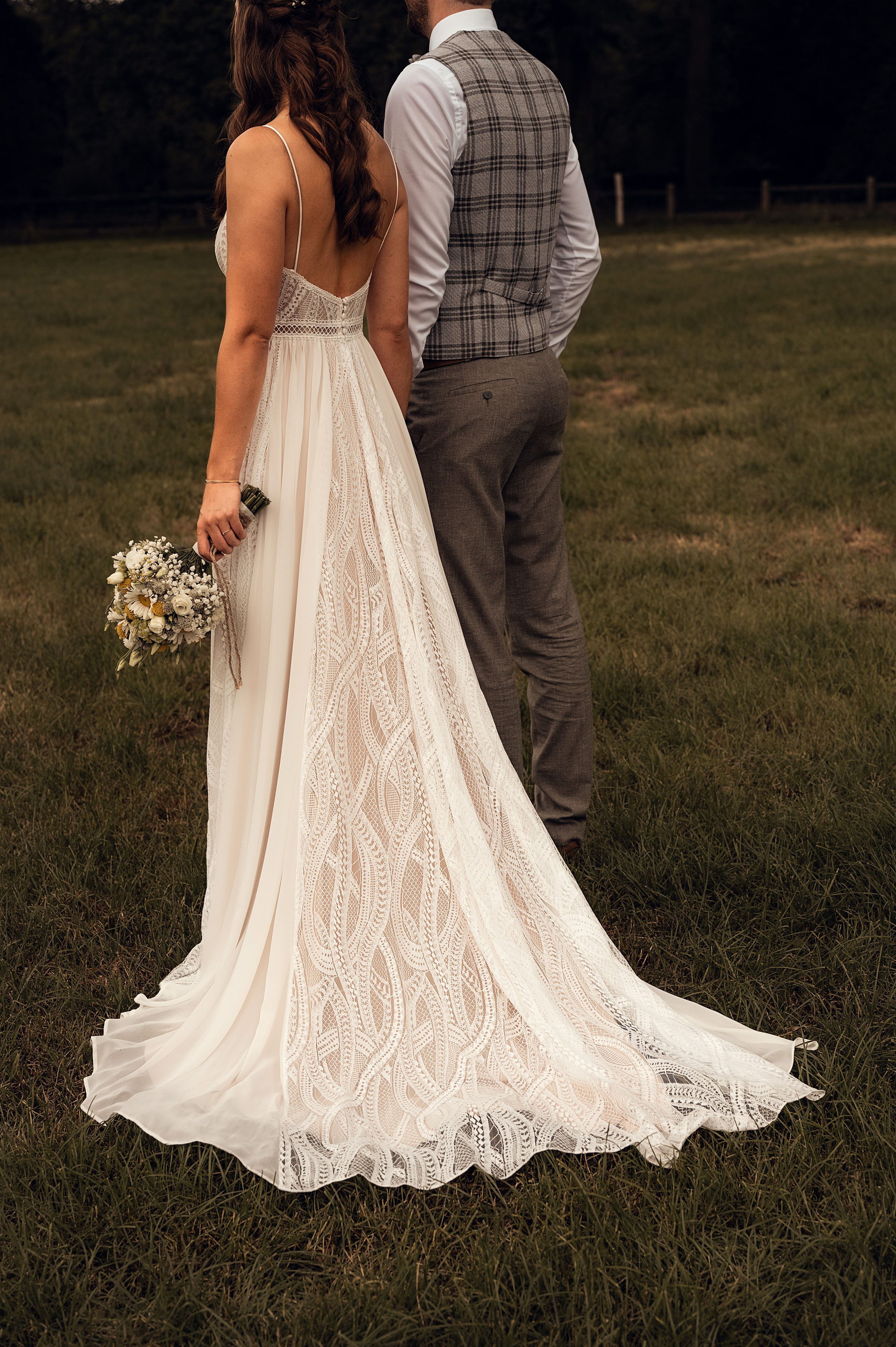 Besonders hervorzuheben ist die schöne Spitze mit dem Nudefarbenen Unterstoff, die besonders in der Schleppe super hervorgehoben werden. Außerdem ist eine Besonderheit des Kleides, der Wechsel aus Chiffon und Spitze im Rock. Trotz tiefem Ausschnitt vorne und hinten hat das Kleid einen super halt.