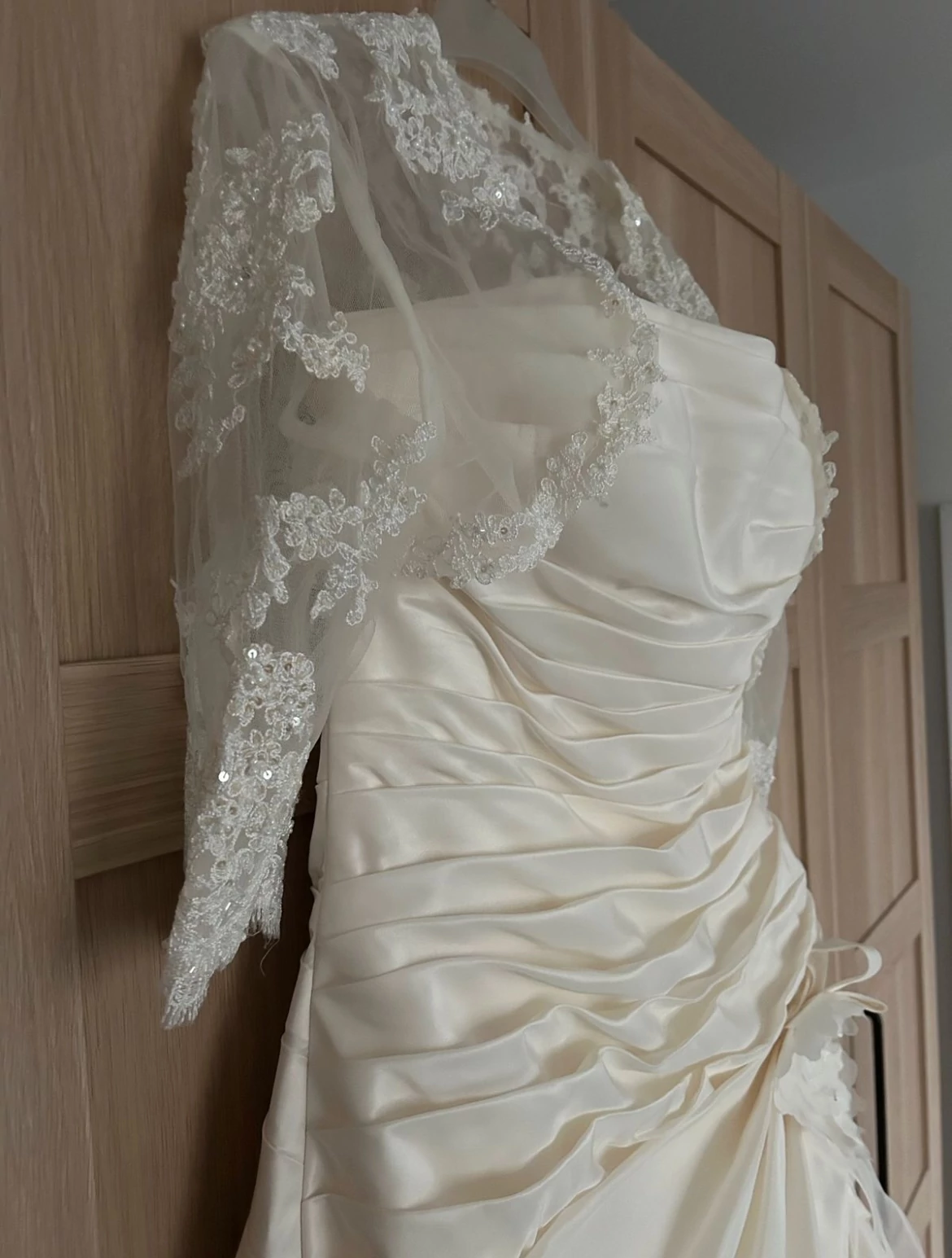 Der Tüll unter dem Kleid in Kombination mit der Schleppe verleiht der Braut dieses gewisse „Prinzessingefühl“ und ist mit dem dazugehörigem Spitzenschleier und Spitzenbolero ein perfektes Abbild einer wunderschönen Braut. "