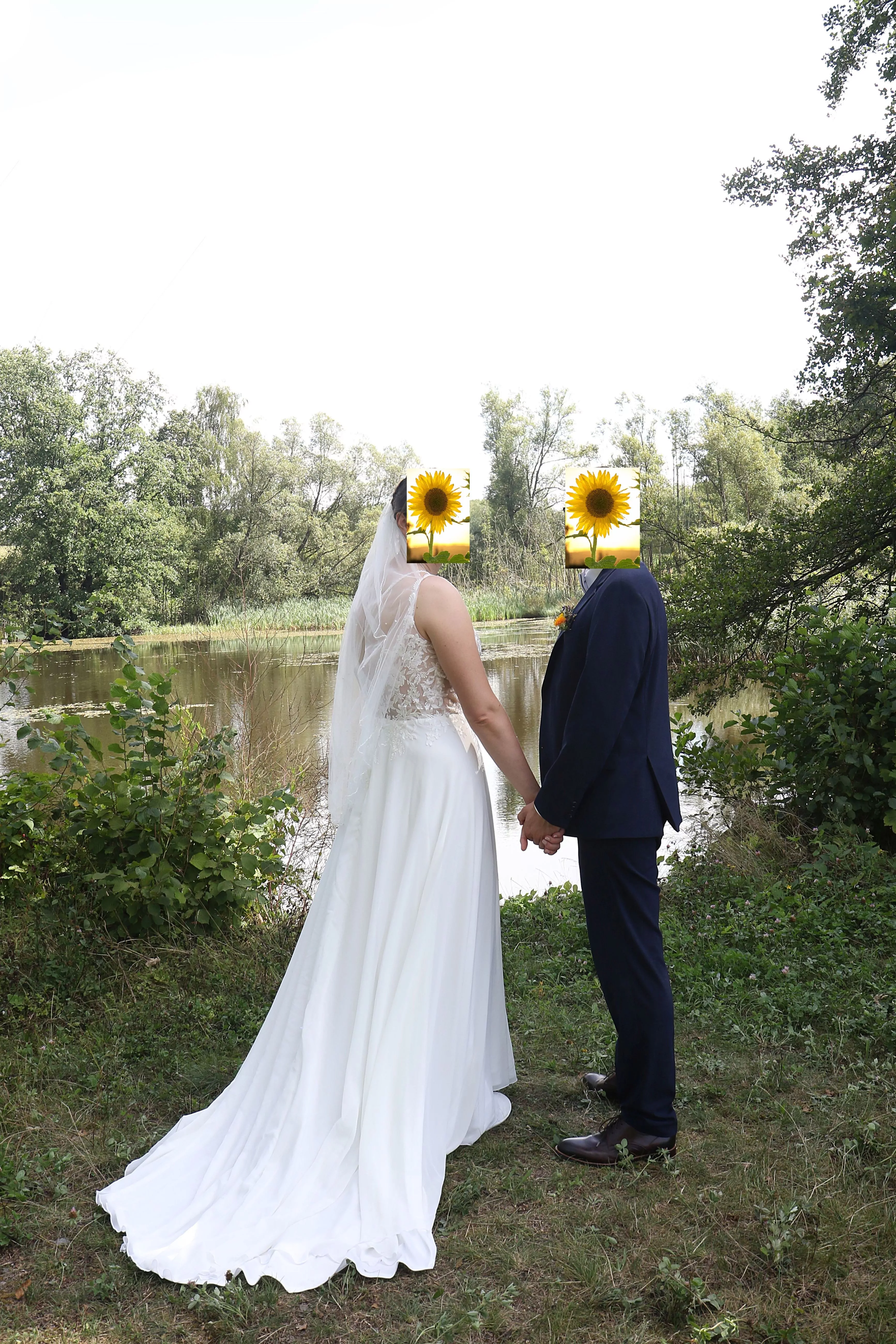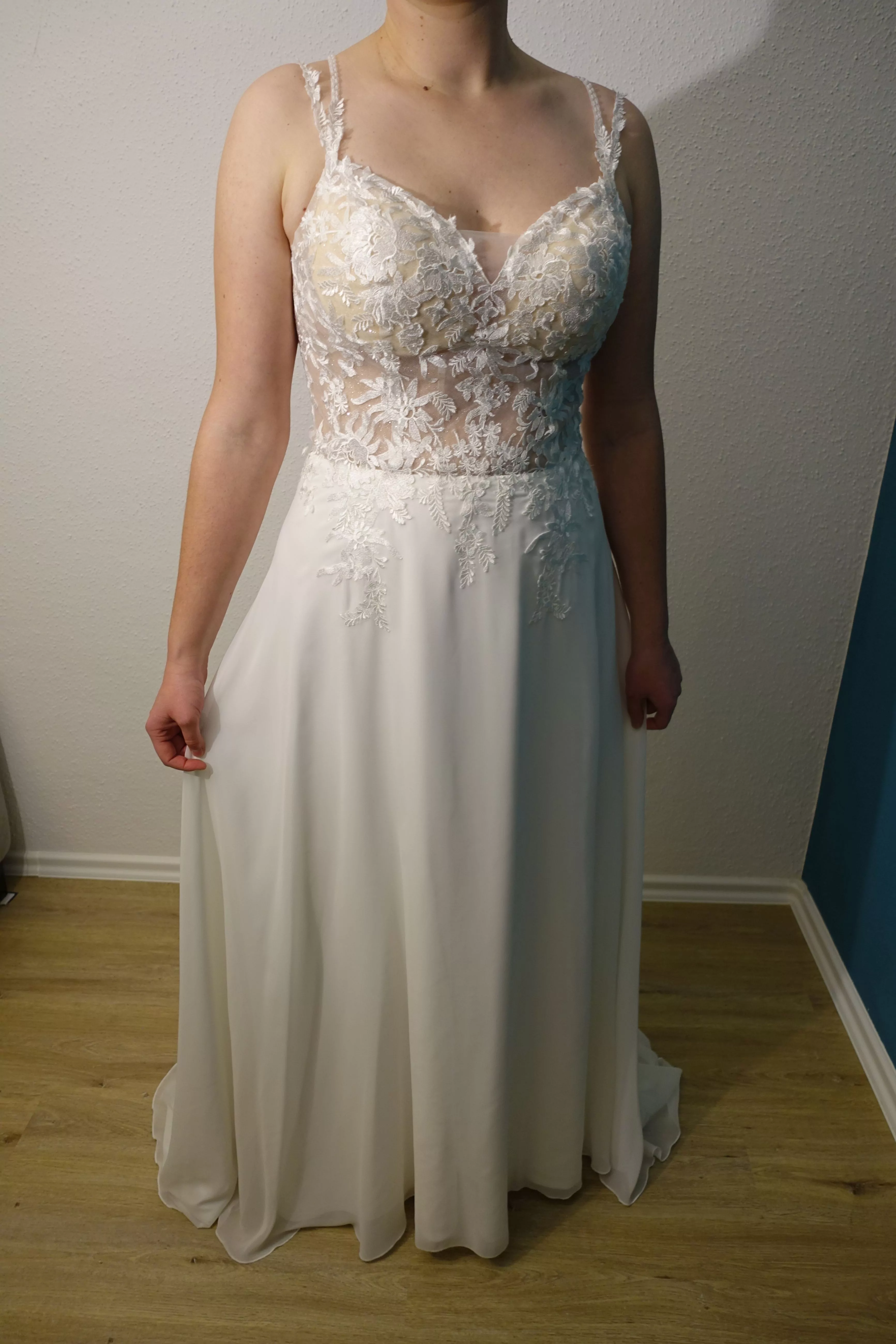 "Ich habe mich in dem Kleid sehr wohl gefühlt. Es war vor allem bequem. Durch die Träger hat man vollständige Armfreiheit und die Schleppe kann über eine Schlaufe hochgebunden werden, was sich auch gut beim Tanzen bewährt hat. Die Blumen-Applikation finde ich sehr schön, die Blüten sind gut sichtbar und trotzdem zart, elegant und nicht aufdringlich. Der offene Rücken erforderte zumindest bei mir (ich bin eigentlich eher zurückhaltend) zuerst etwas Mut, aber am Hochzeitstag war ich sehr stolz darauf, weil auch von allen Seiten ein bewunderndes Feedback kam. In Kombination mit einem Schleier war es ideal.