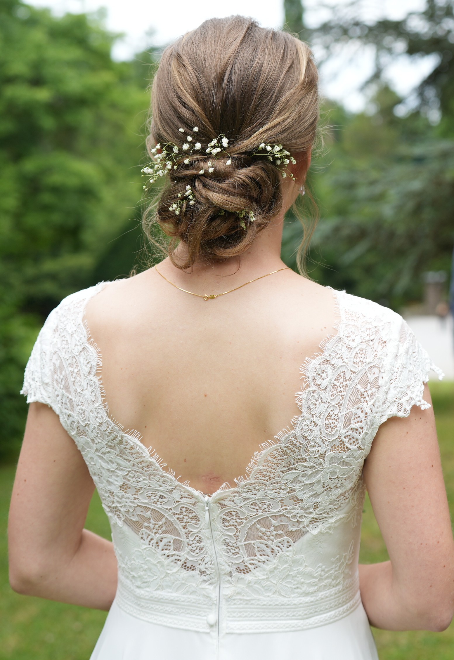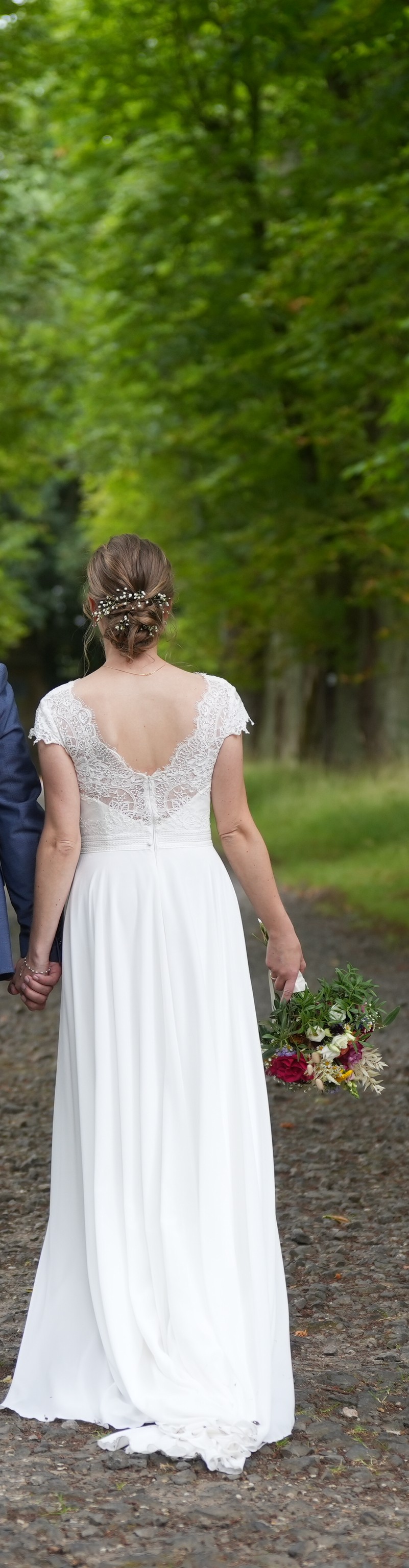 Ich habe mir unter der Borte am Rücken noch einen Knopf und unten am Kleid eine Schlaufe annähen lassen, damit ich die Schleppe hochbinden konnte. So konnte ich mich auch auf der Tanzfläche frei bewegen (das Kleid fliegt sehr schön, wenn du dich drehst).