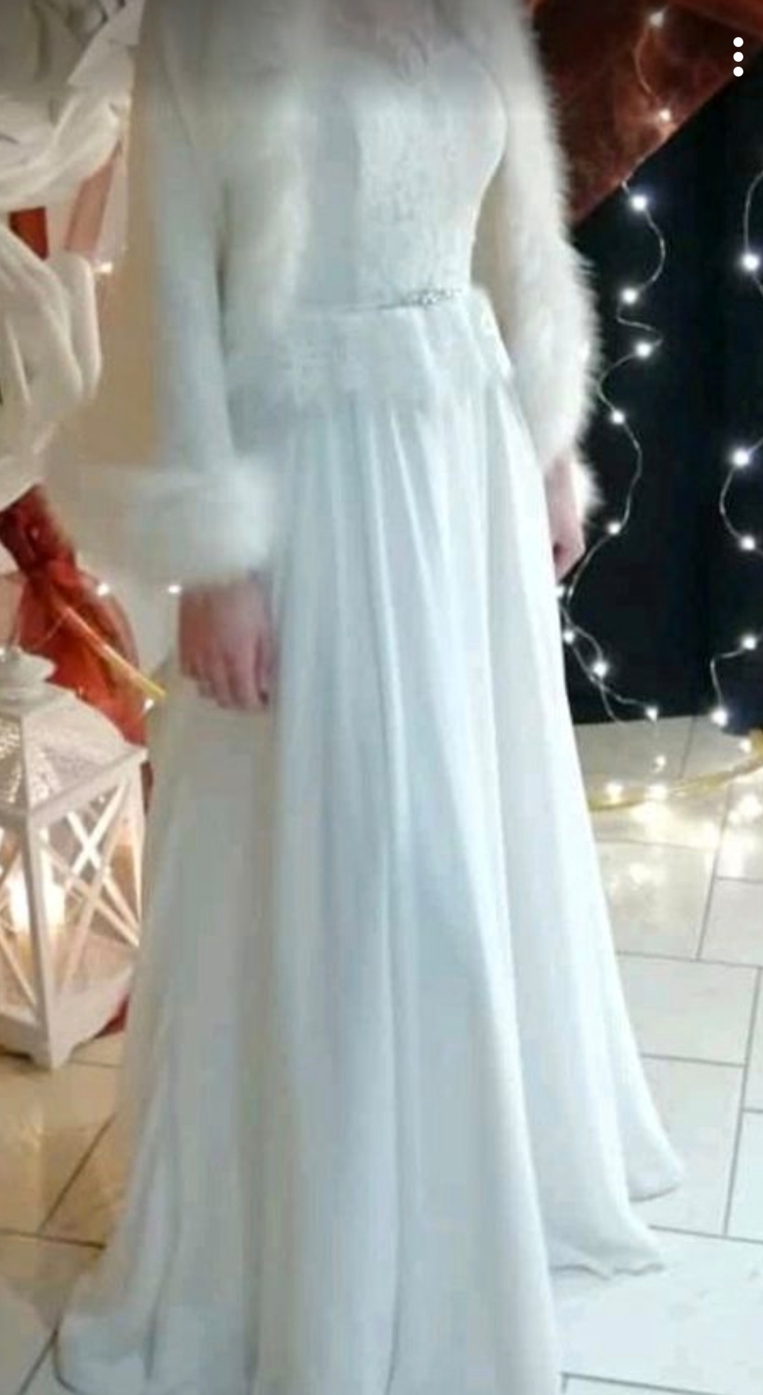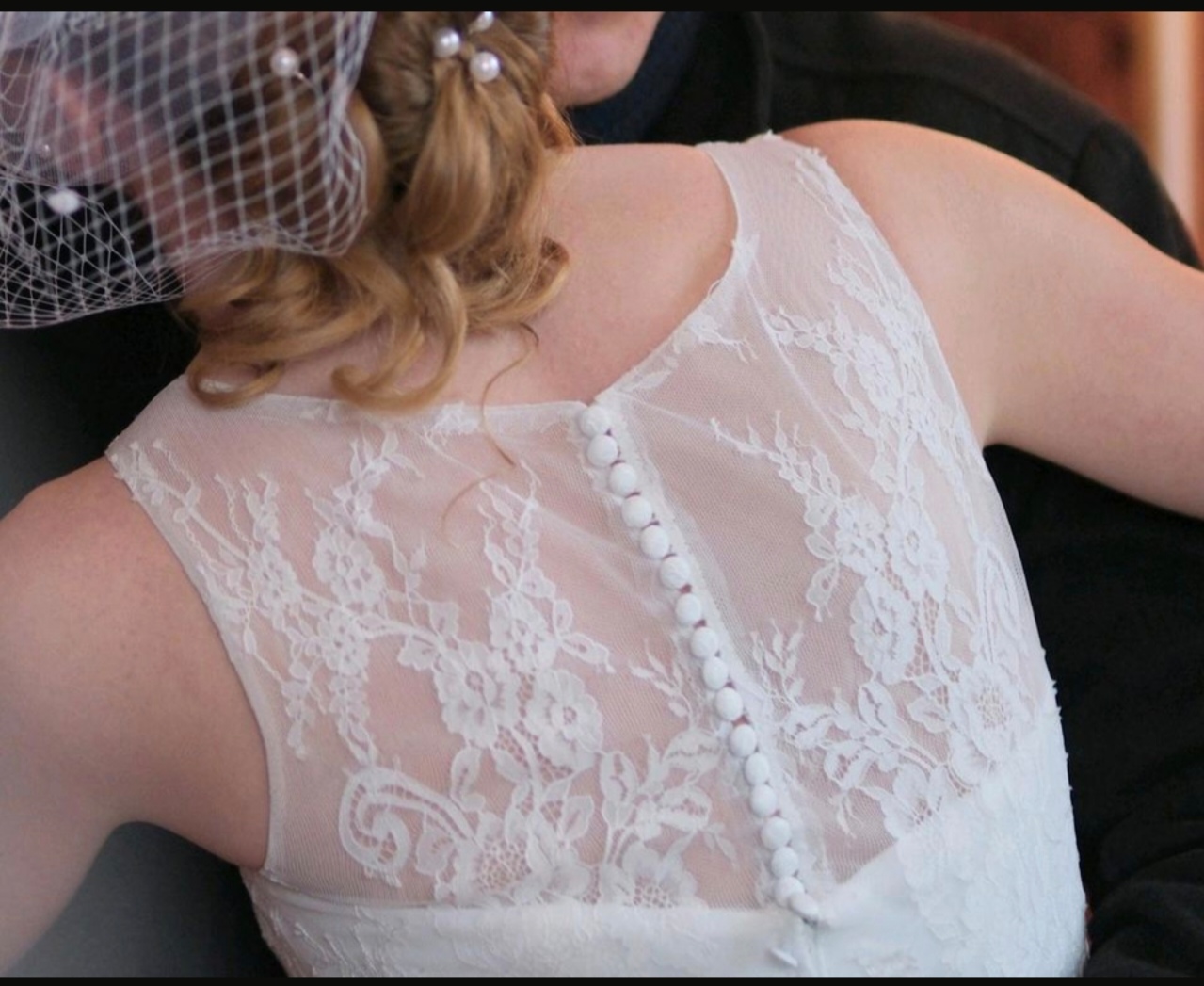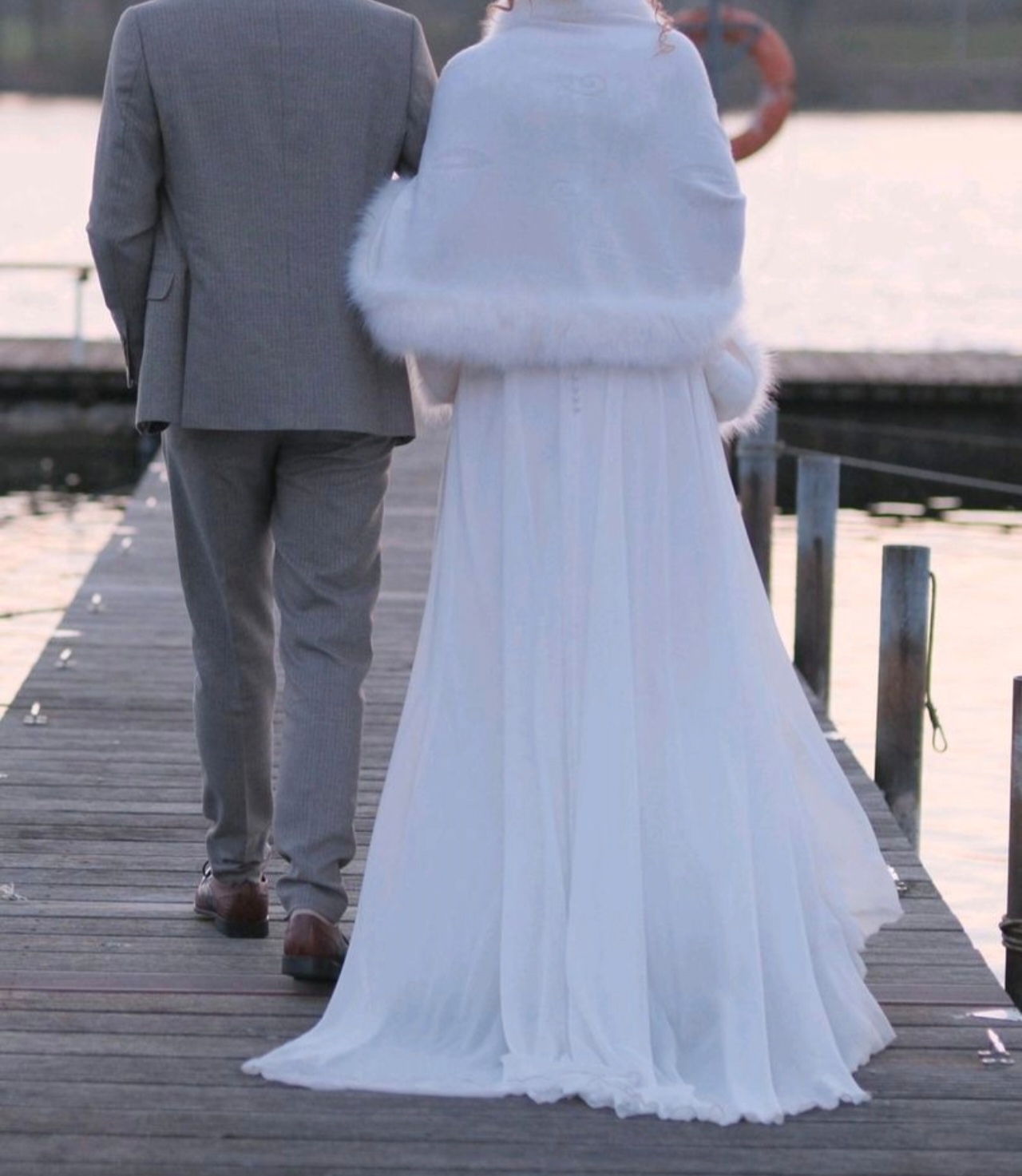"Die Schleppe kann hinten mit einer Schlaufe am Rücken an einem Knopf befestigt werden. Die Knöpfe sind allerdings sehr empfindlich. Reißverschluss und Knöpfe funktionieren einwandfrei. Vorne ist ein Gürtel mit Glitzer und wie auf den Bildern Spitze im oberen Teil vorne und hinten. Das Jäckchen auf dem Bild gehört dazu, falls gewünscht. Die Handschuhe können ebenfalls mit verkauft werden