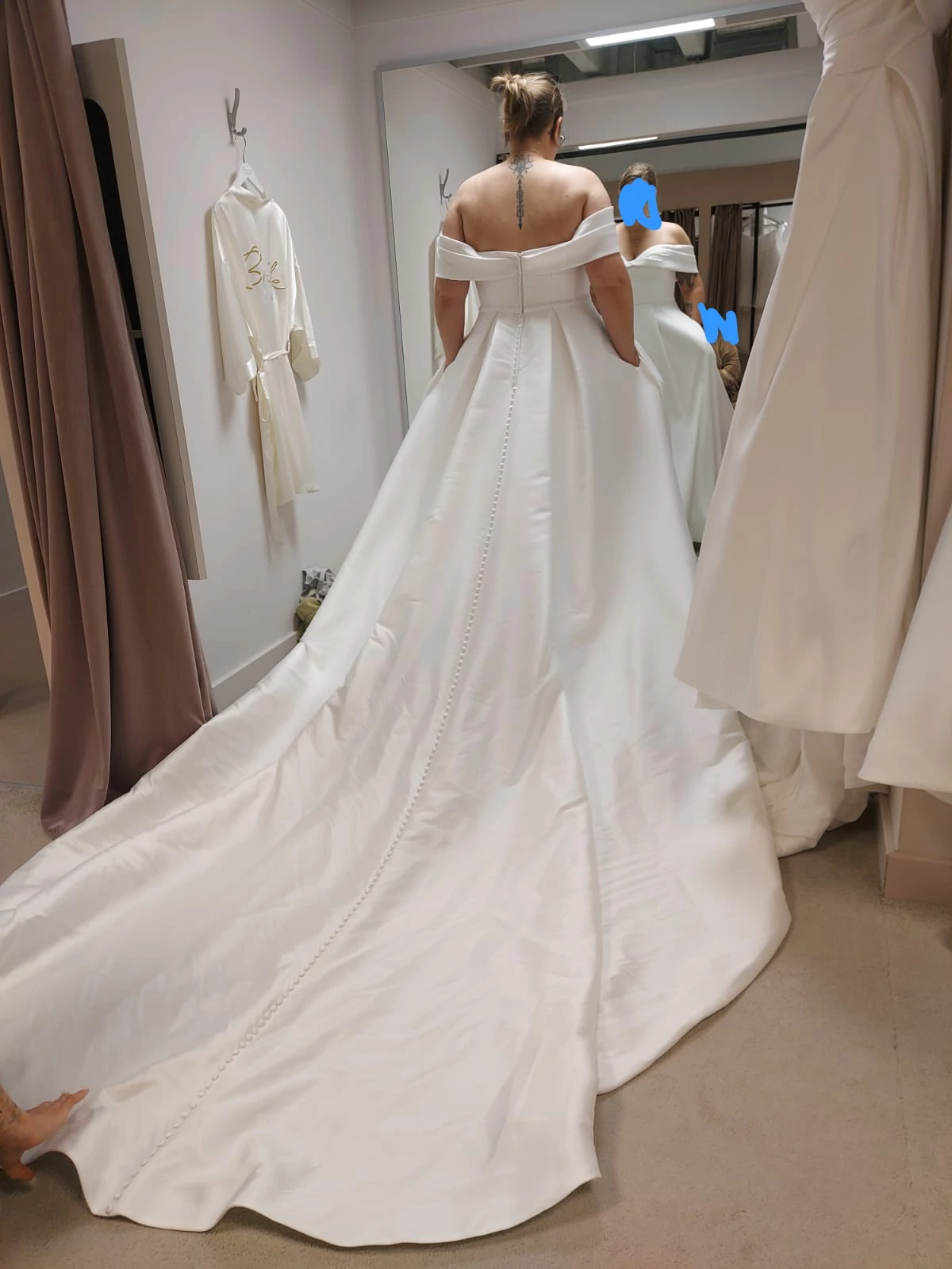 Ich habe einen Knopf verstärken lassen hinten und eine Schlaufe unter schleppe, um die lange schleppe zum Tanzen oder Gehen hoch zu nehmen. "