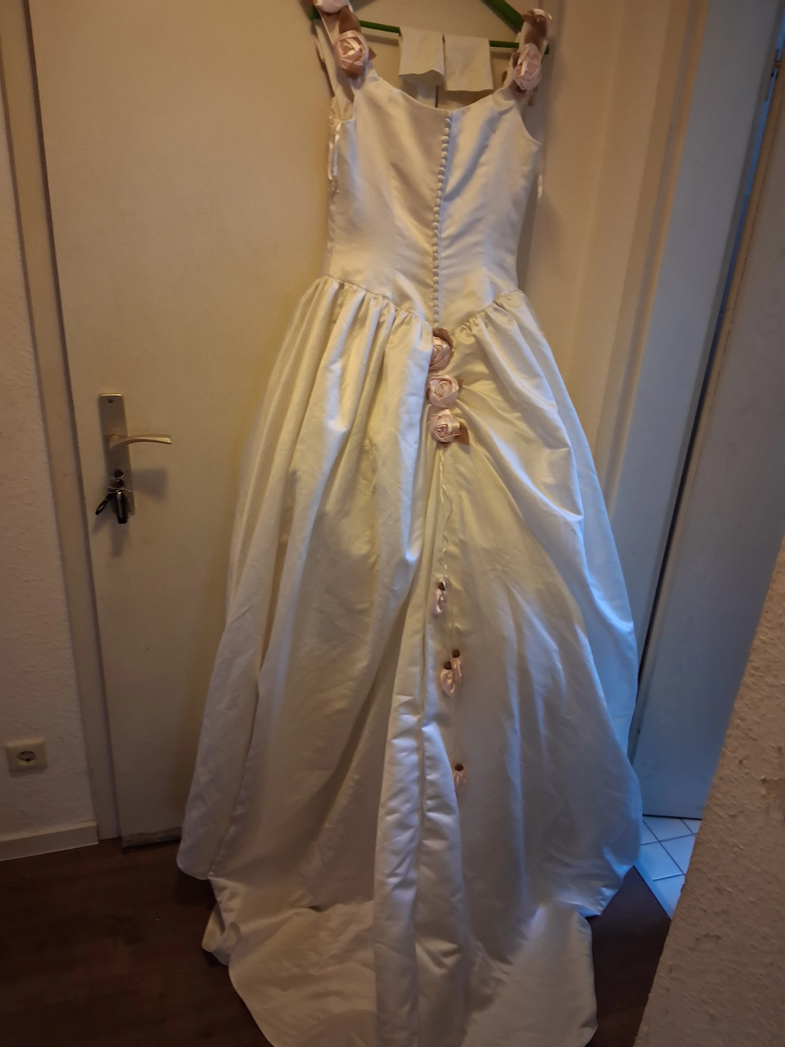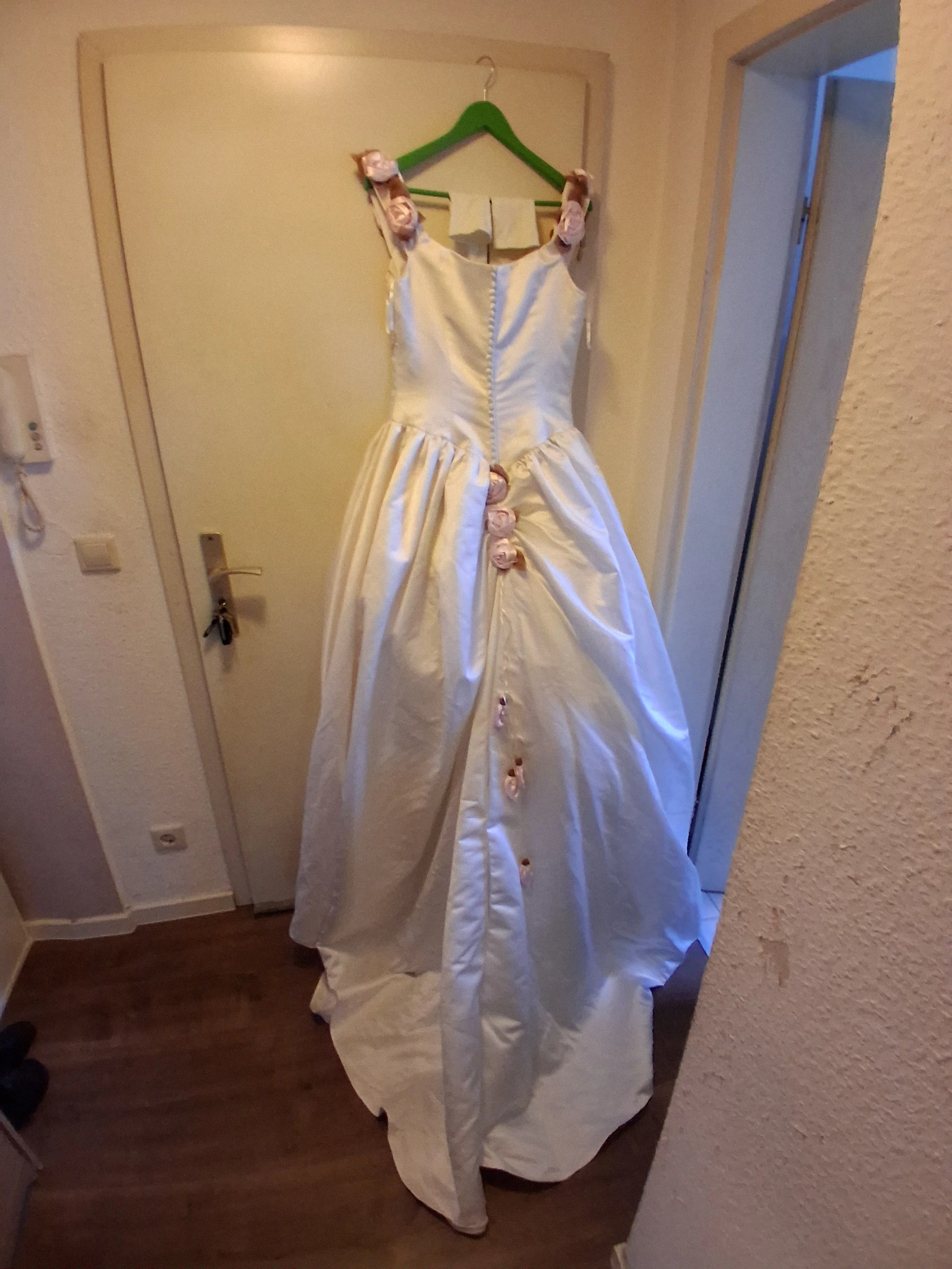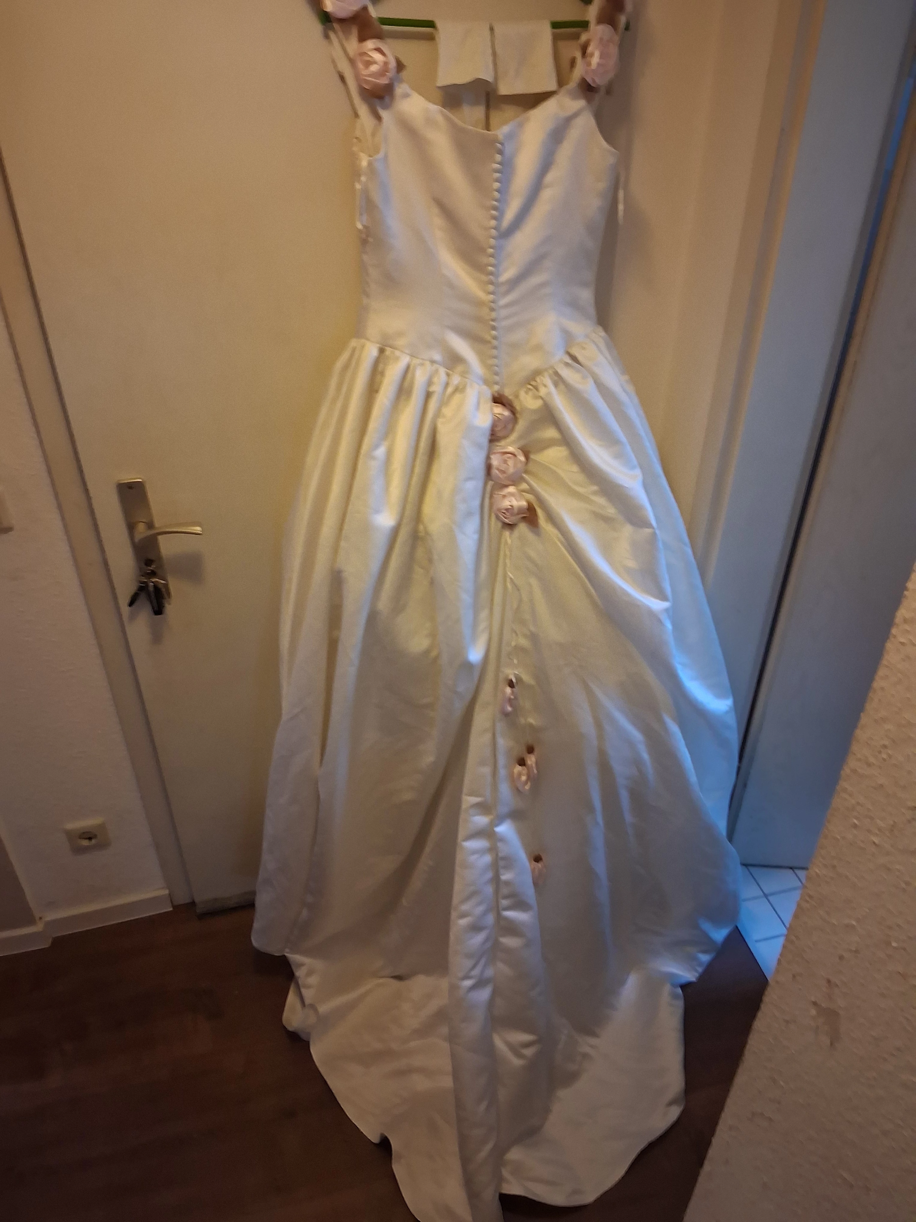 Es hat eine lange schleppe mit rosenband in der Mitte.