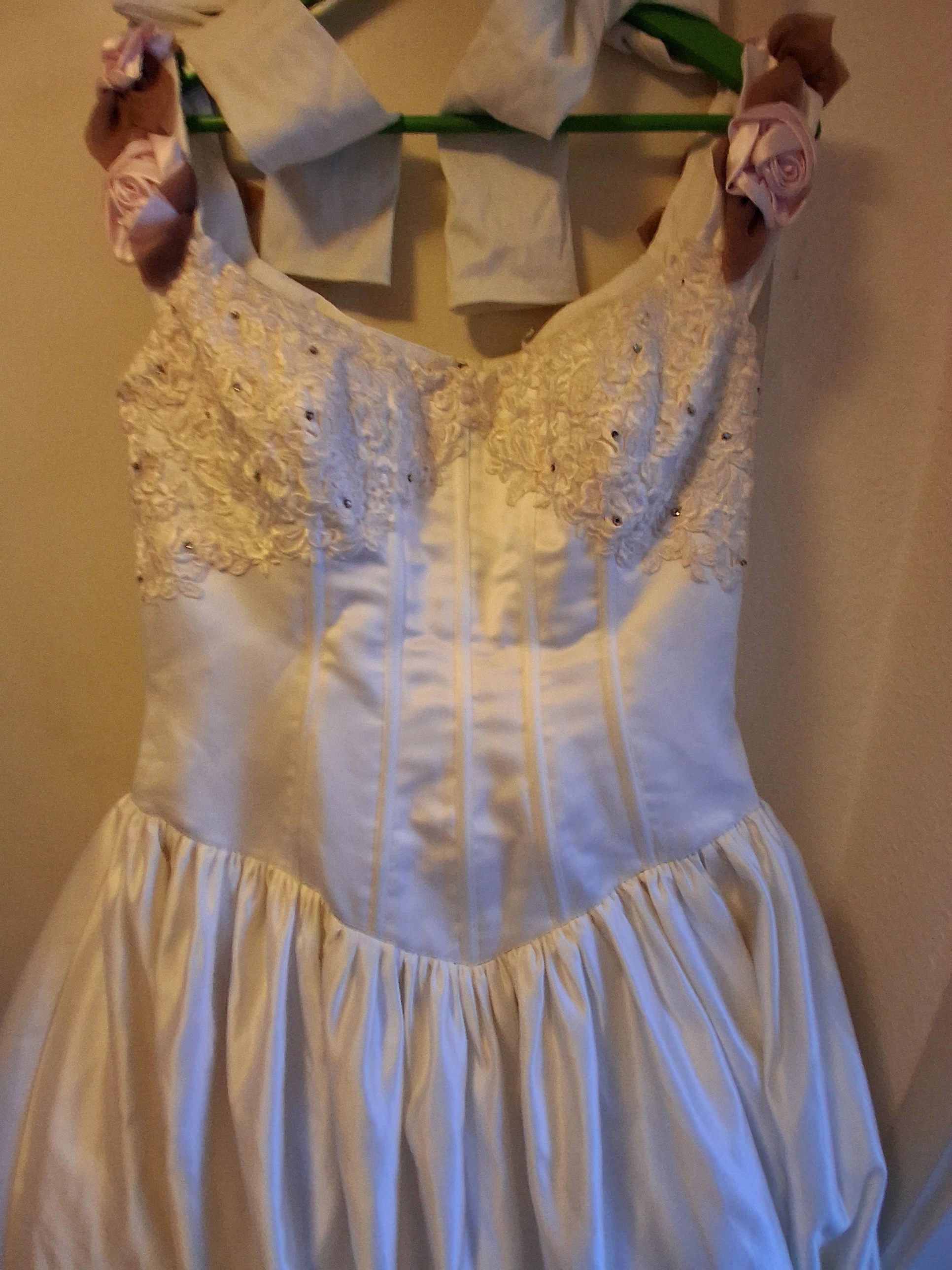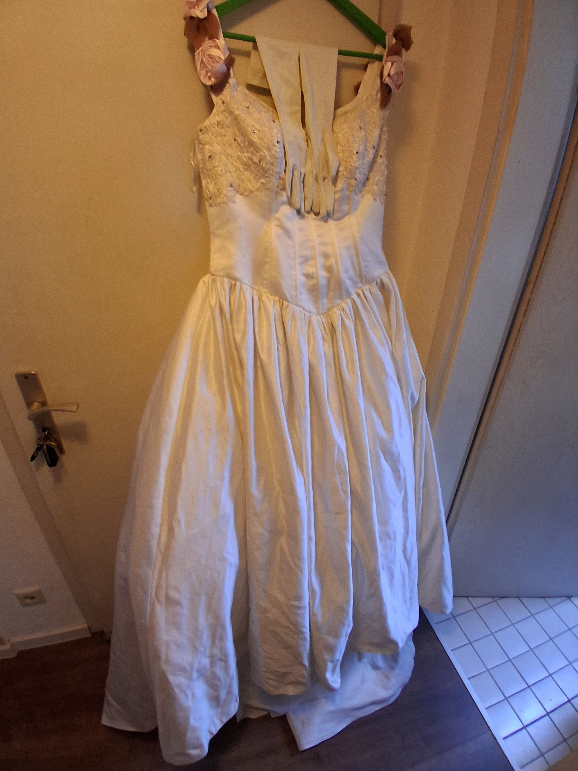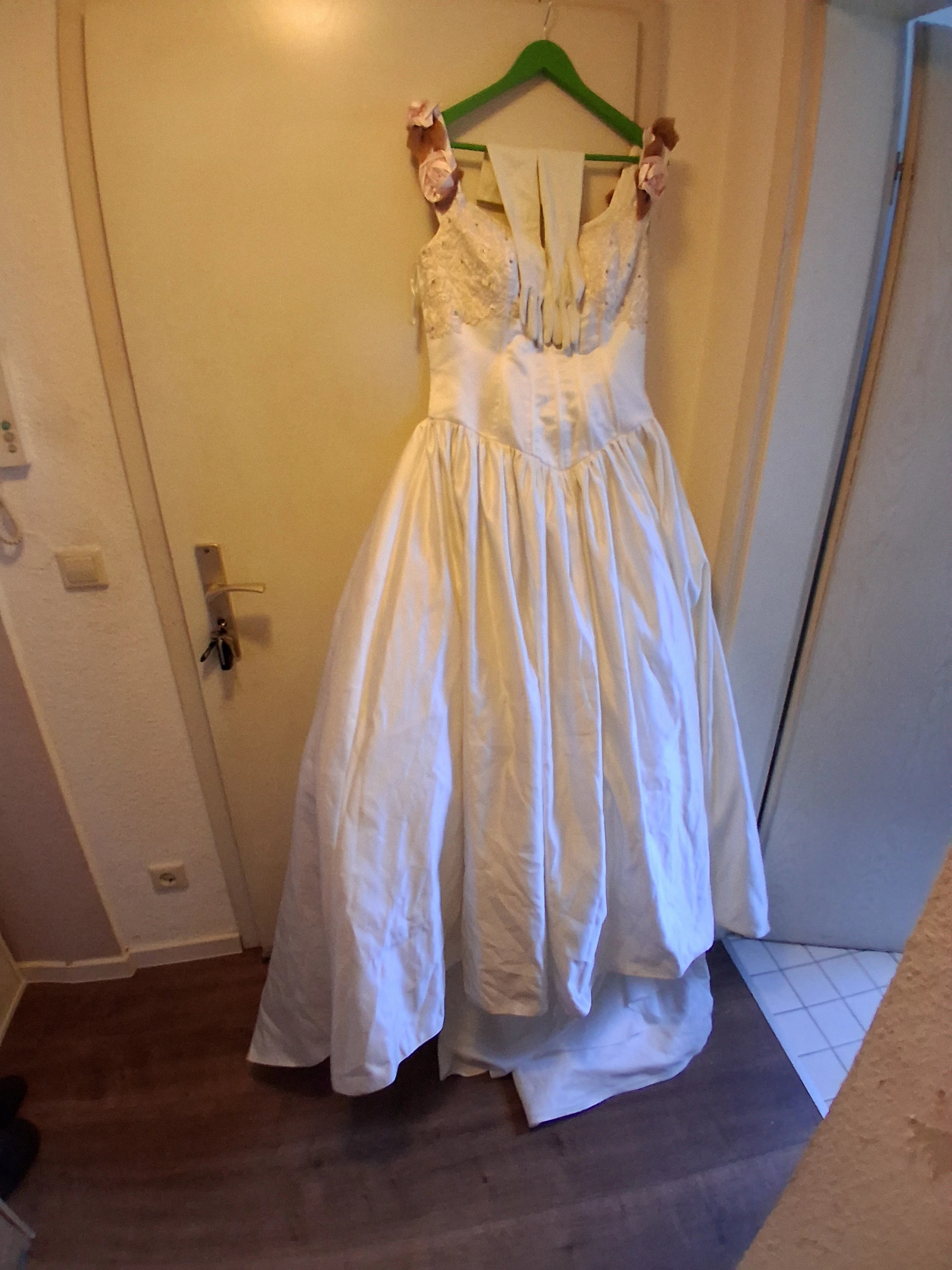 Es hat eine lange schleppe mit rosenband in der Mitte.