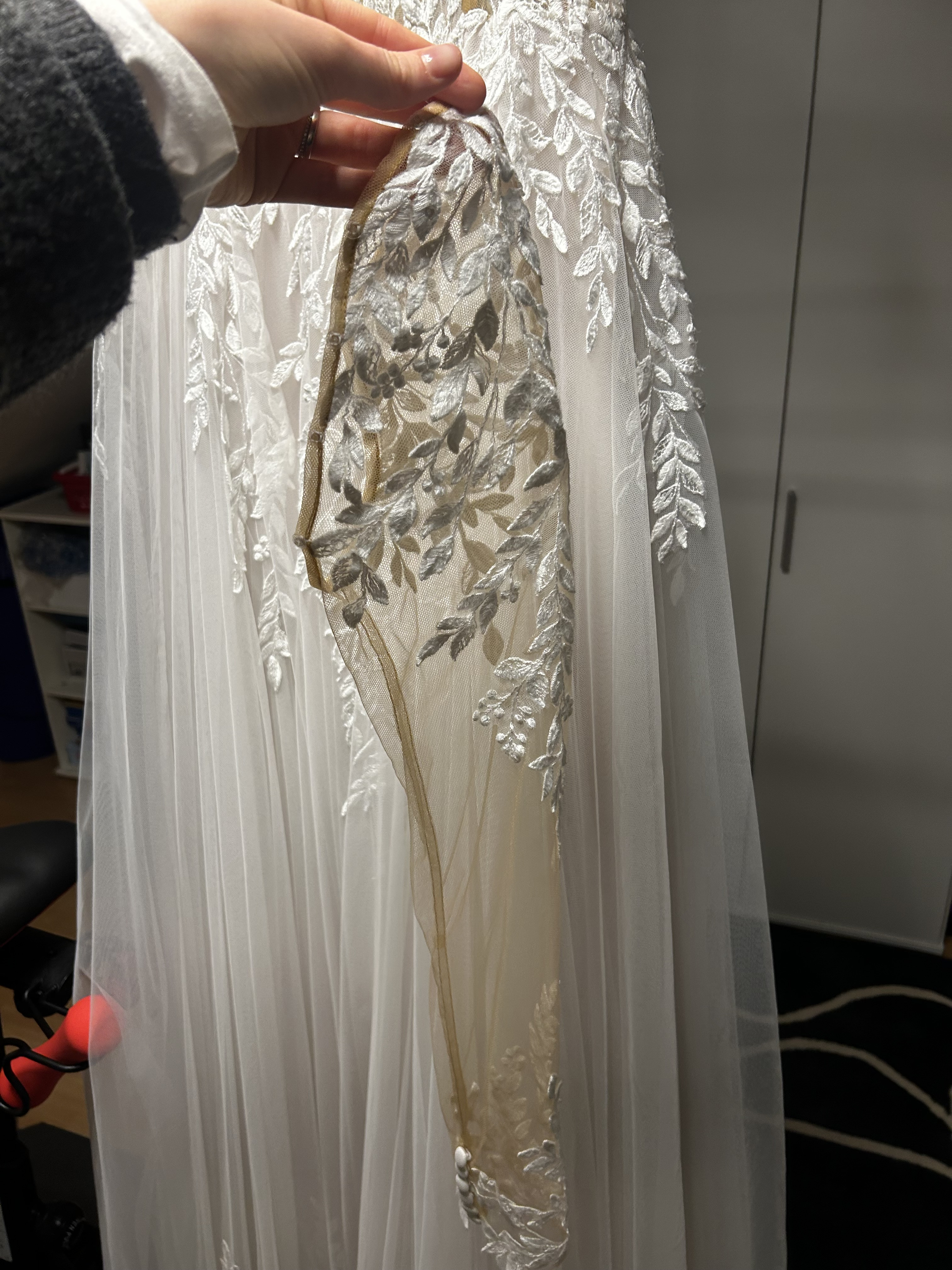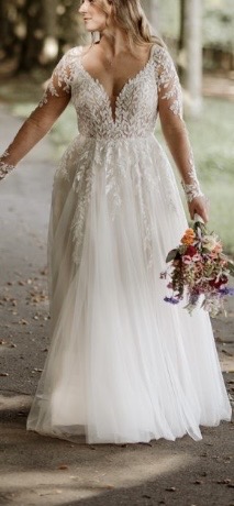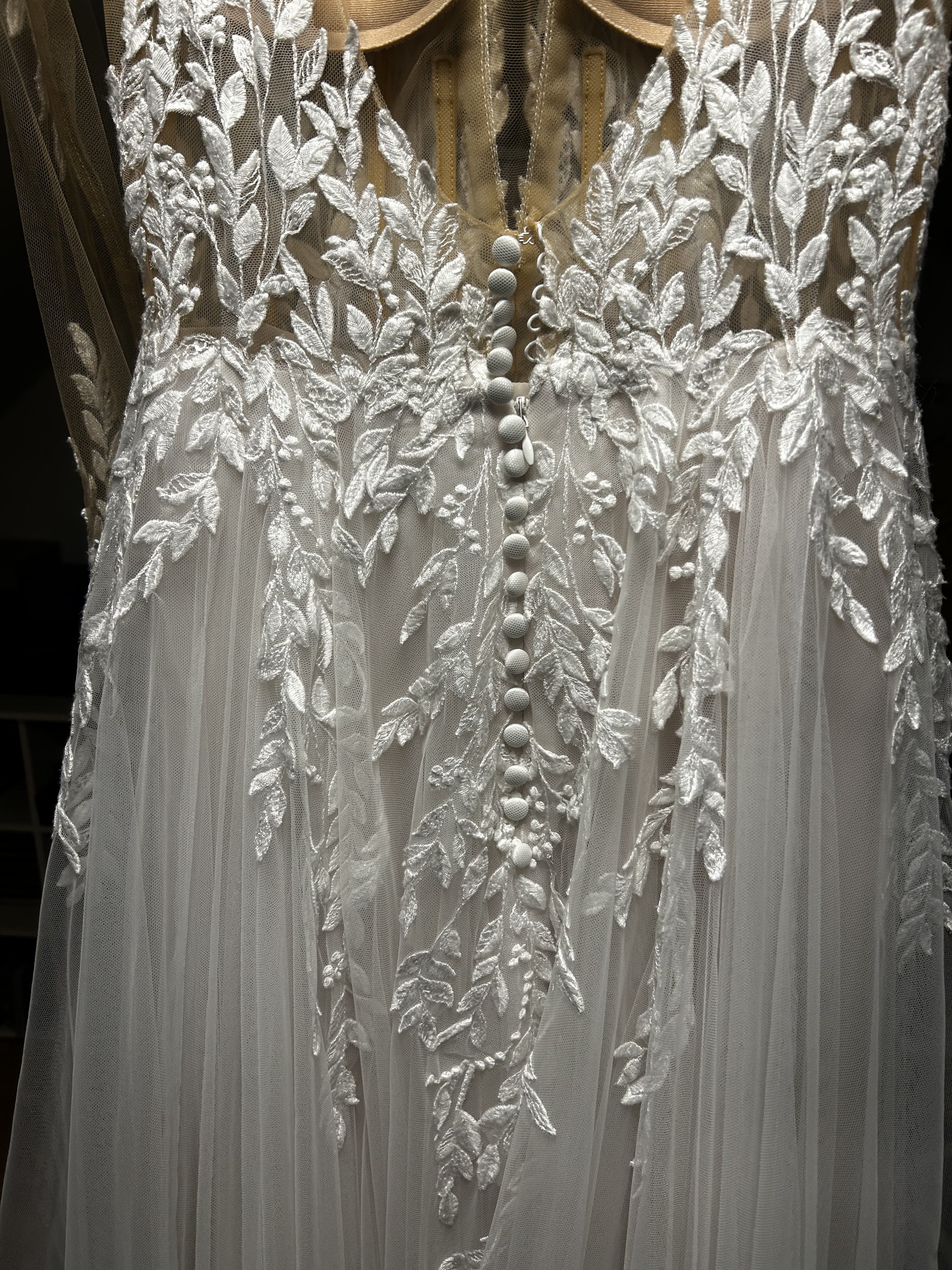 "A-Linie mit abnehmbaren Ärmeln (mit Druckknöpfen), Blätterspitze, Knopfleiste, Schleppe