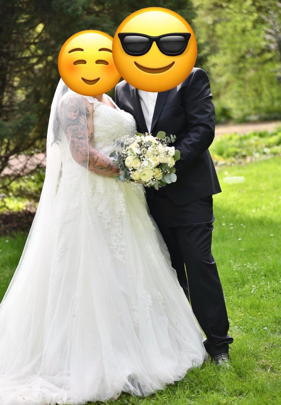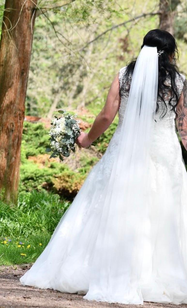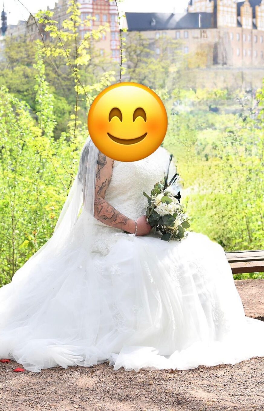 "Das Kleid ist mit Spitze verziert und hat eine wunderschöne Schleppe. Es scheint eine perfekte Mischung aus Eleganz und Romantik zu sein."