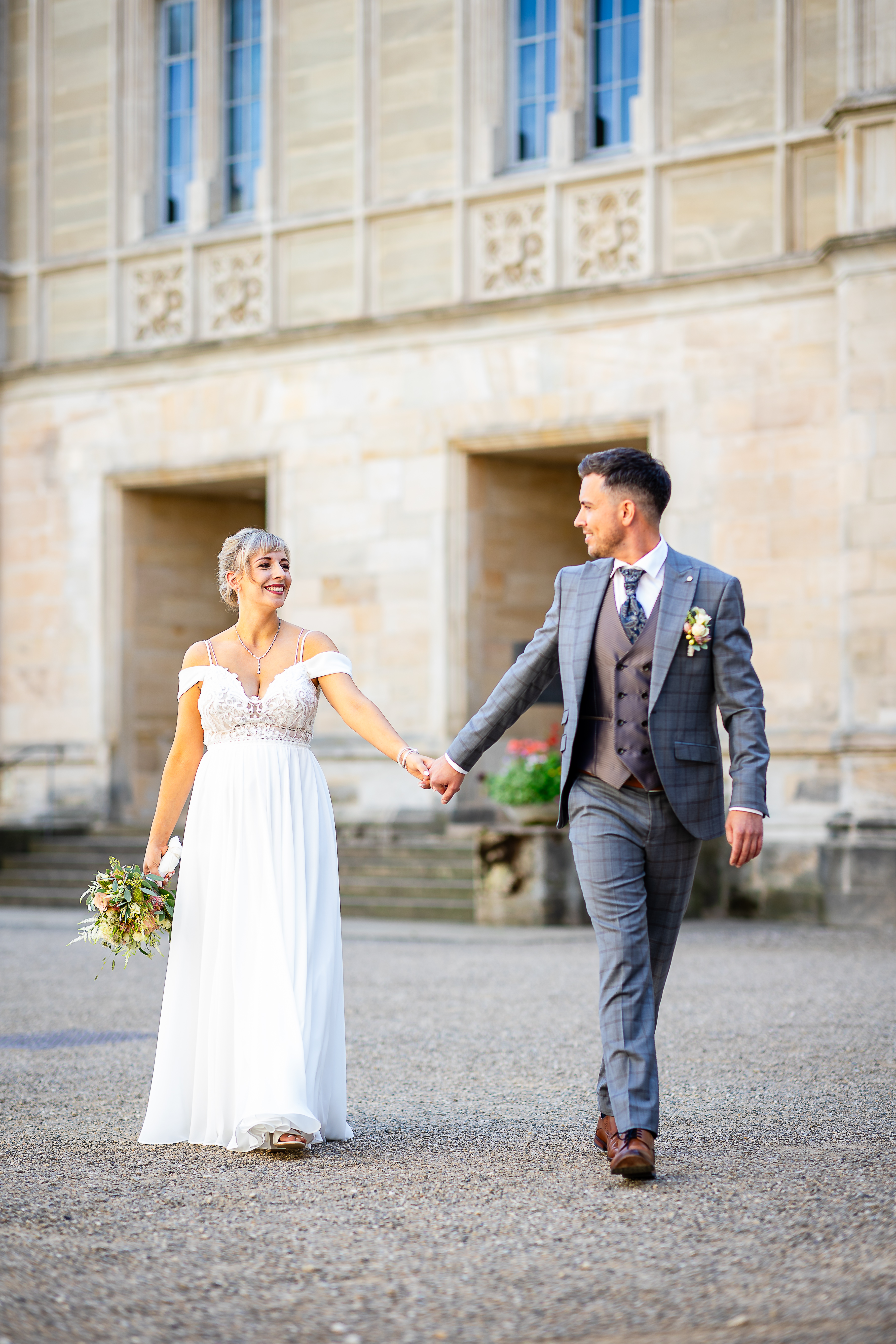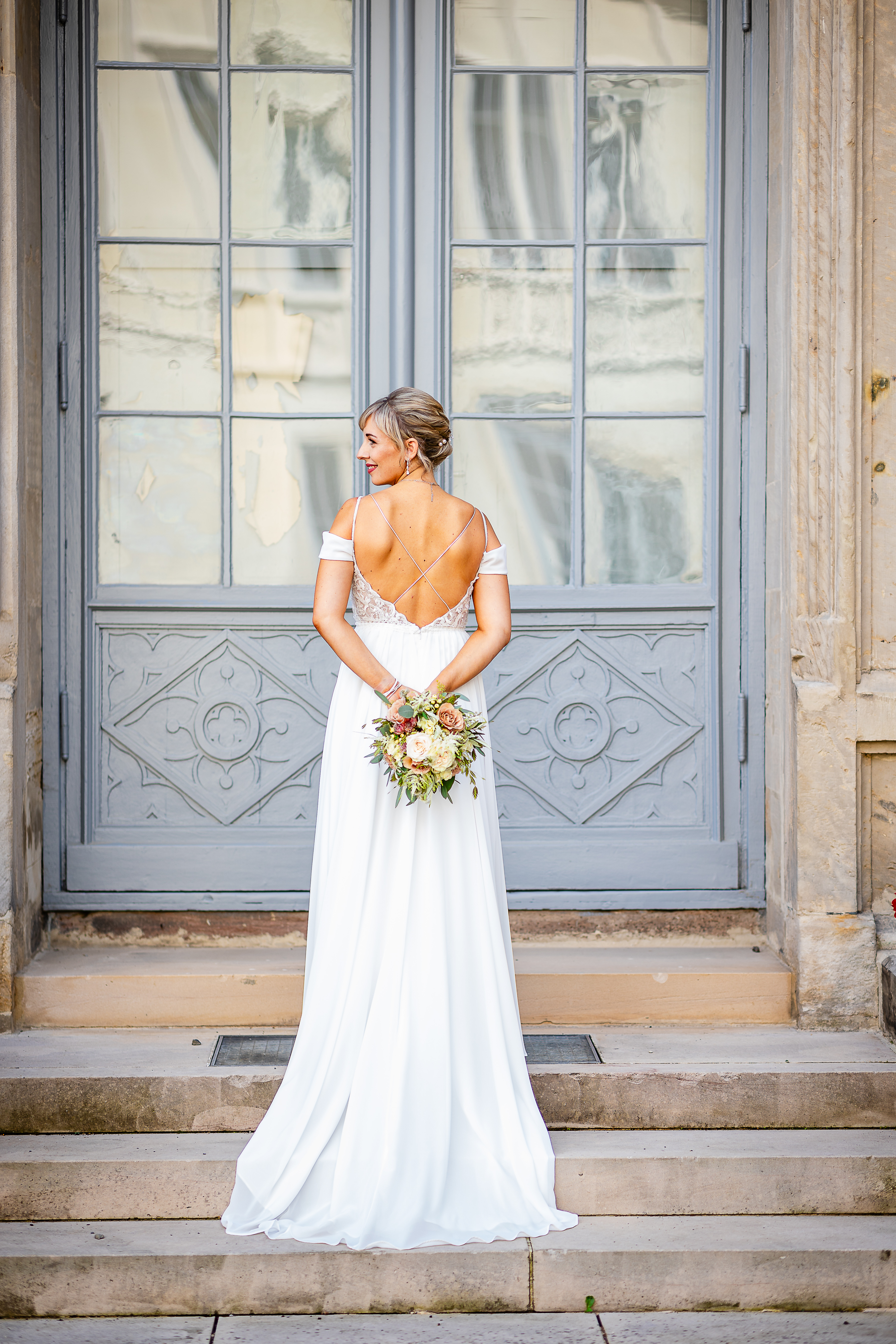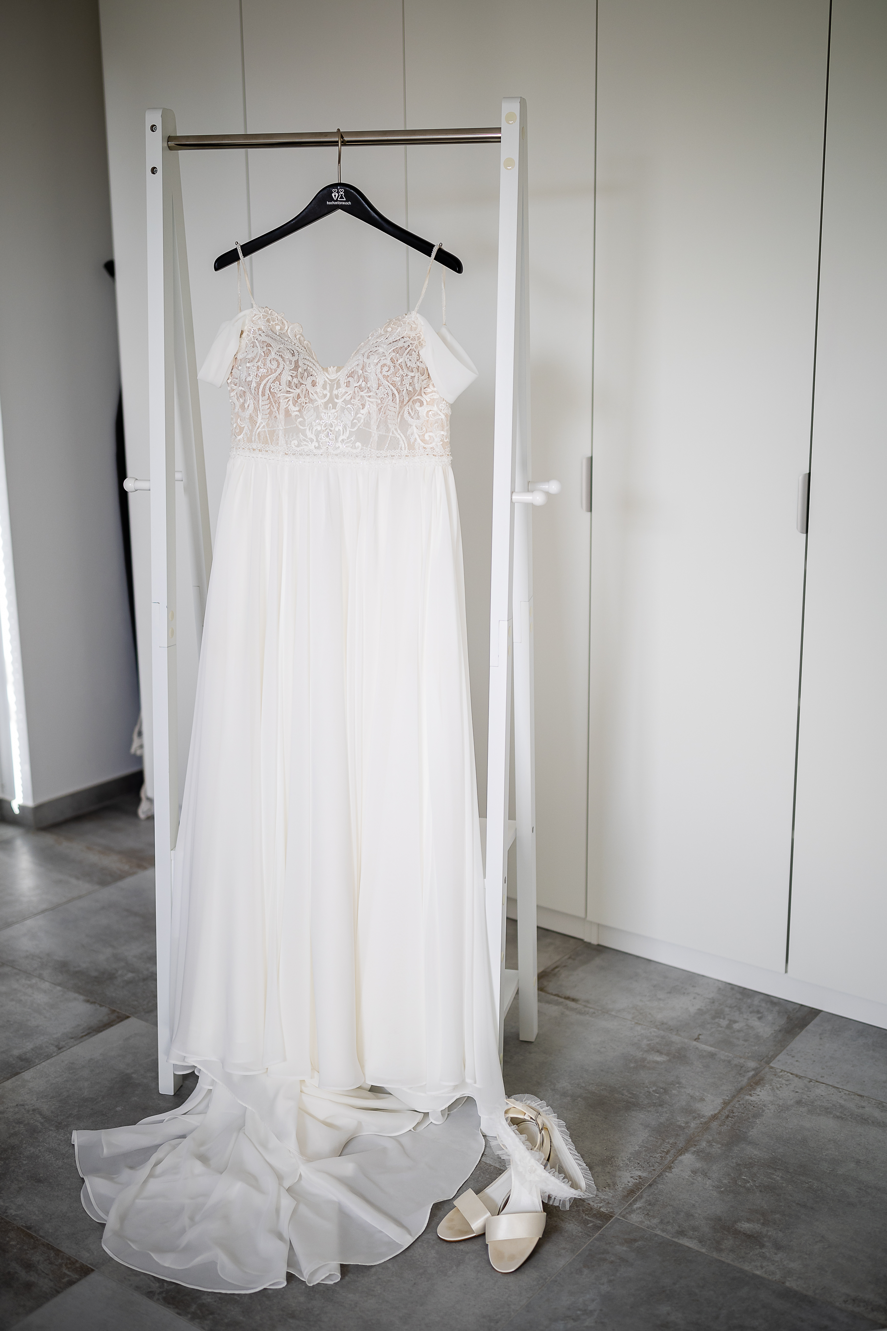 "Das Kleid habe ich gekauft als ich schwanger war. Aus diesem Grund wurden auch einige Änderungen vorgenommen. Wie bereits oben beschrieben, wurden Carmen-Ärmel dran genäht. Für einen besseren Tragekomfort wurde ein Kreuz in den Rücken eingenäht, sodass es besser gesessen hat. Am Reißverschluss wurde eine kleine Schnürung eingenäht, sodass ich bei Bedarf das Kleid etwas weiter machen konnte. Es hat sich an meinem Hochzeitstag super tragen lassen. Das Kleid war sehr bequem und hat mich Strahlen lassen. All diese Änderungen können aber auch rückgängig gemacht werden, sodass das Kleid wieder im ursprünglichen Zustand wäre."