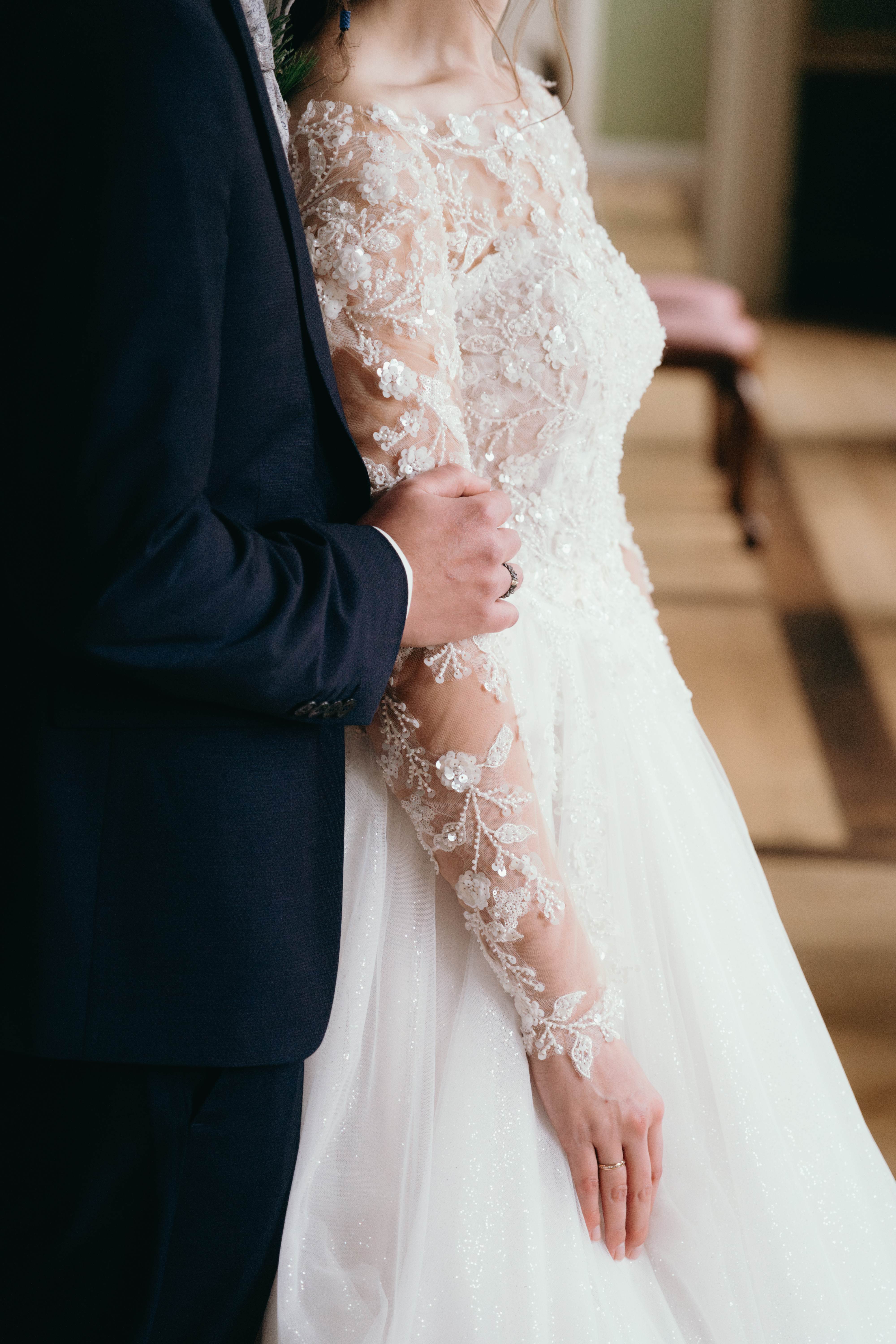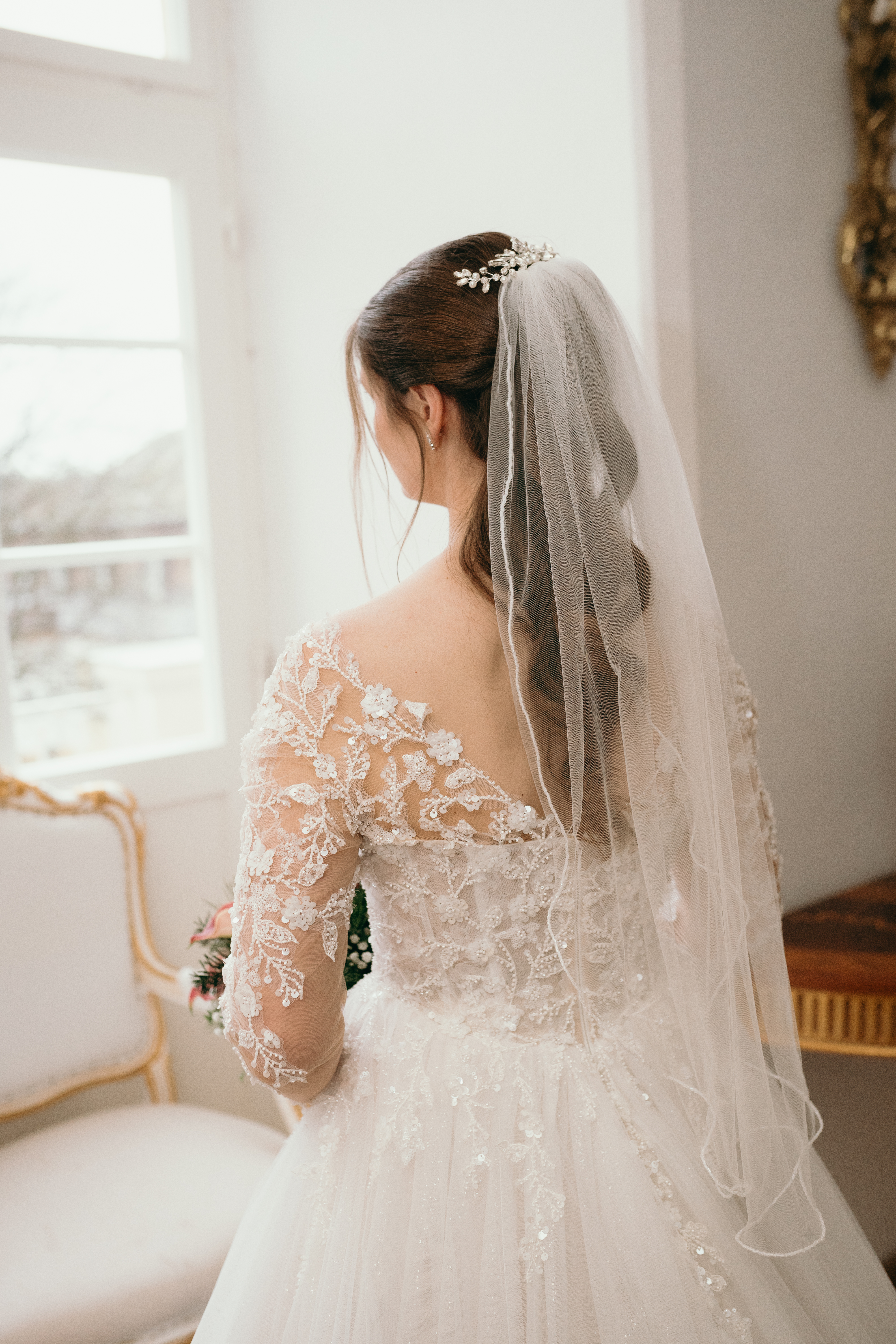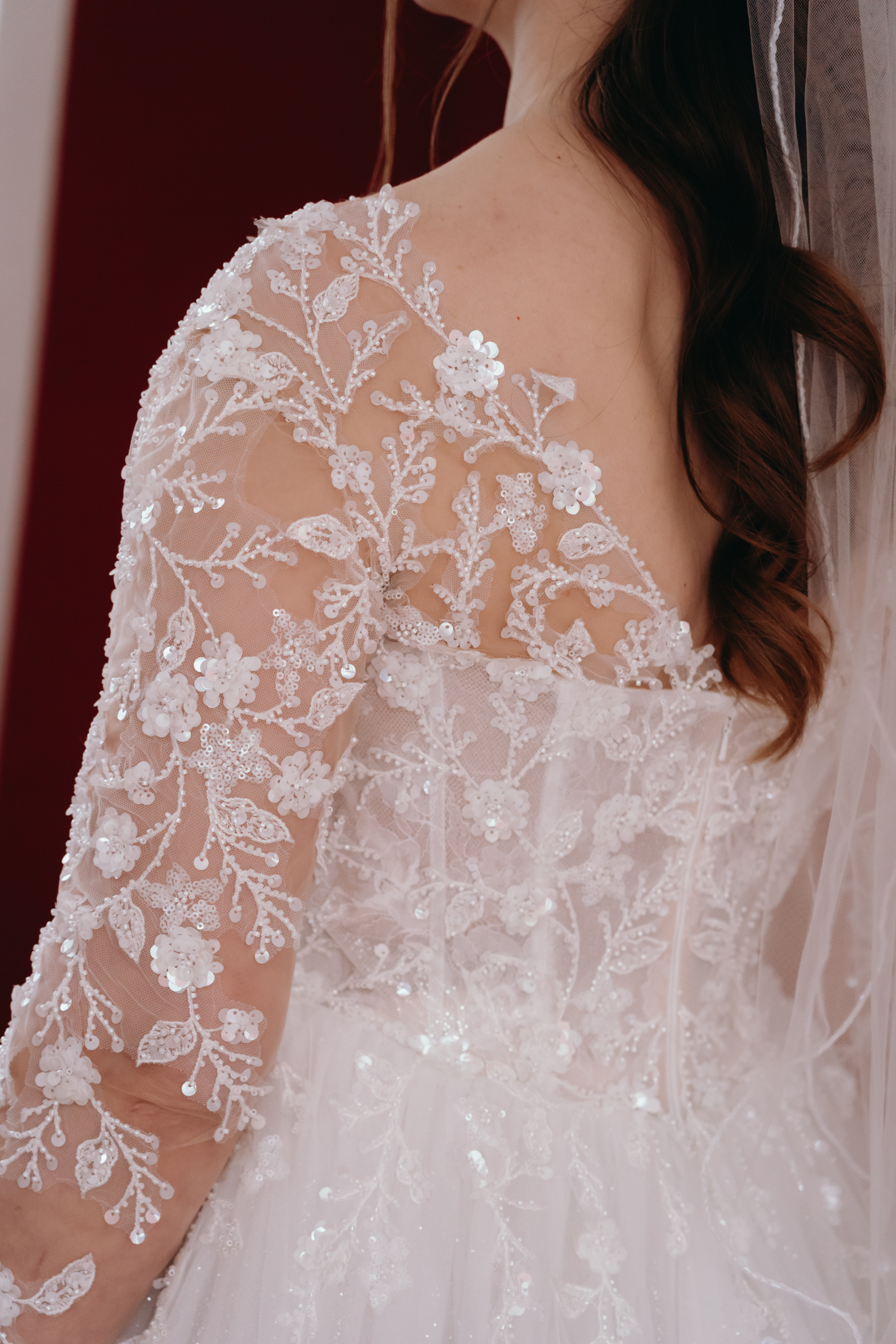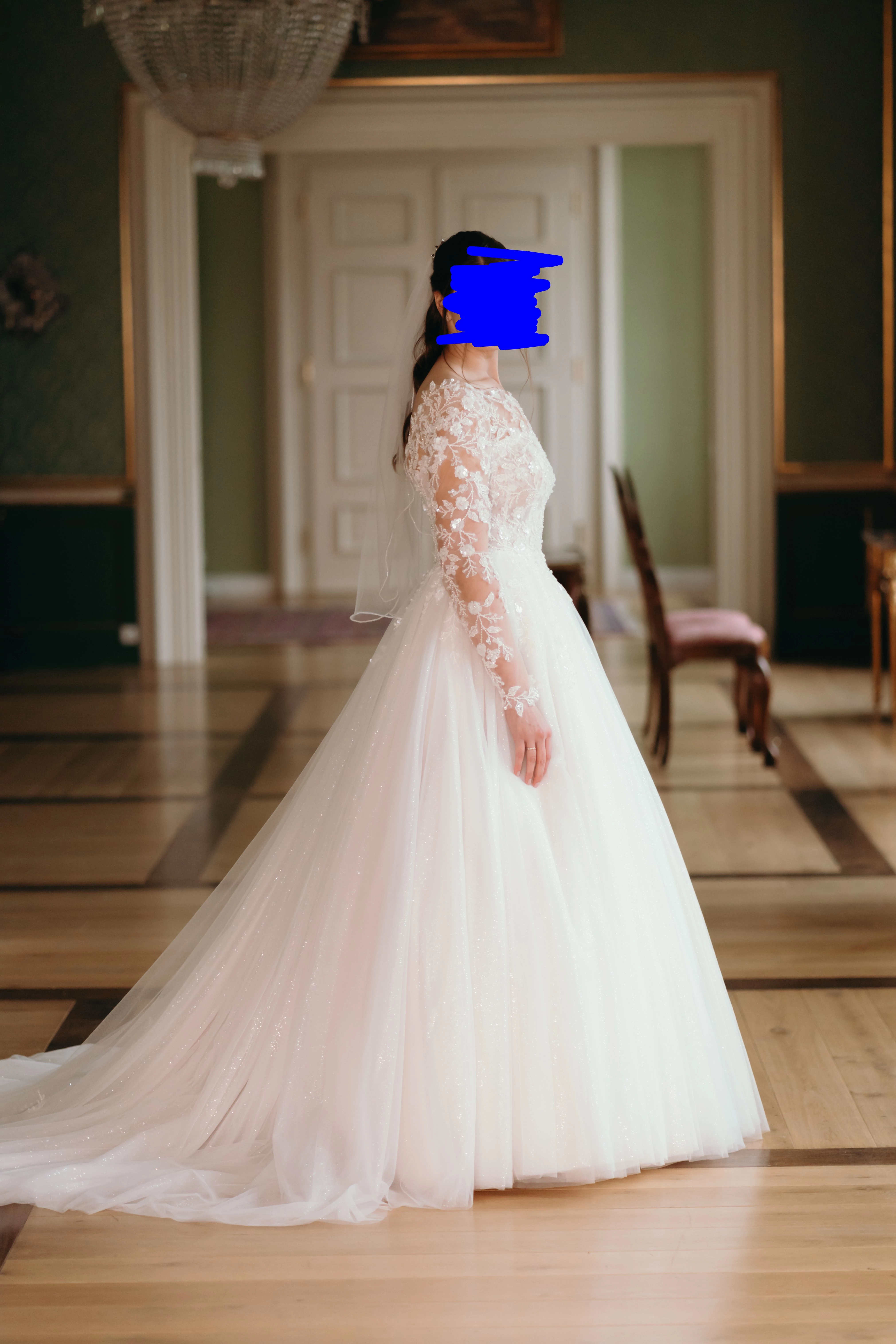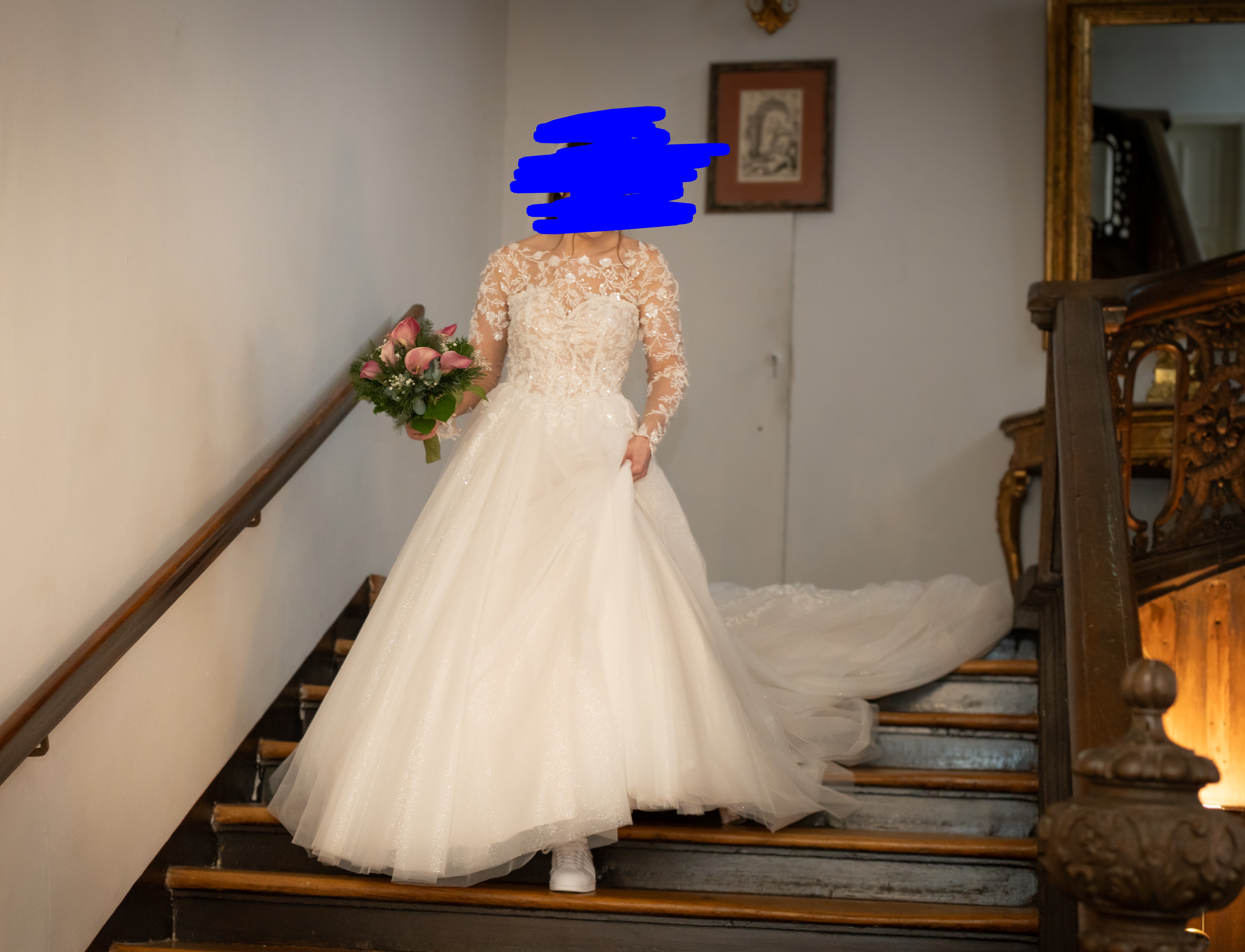 "Das Kleid ist perfekt, um eine schmale Taille zu zaubern mit einem weiten Rock. Richtig Prinzessinenlike, ohne übertrieben zu wirken. Es glitzert, aber dezent. Die Ärmel sind geschneidert und die Spitze ist passend zum Kleid vom selben Design dazu bestellt. Es ist sogar noch etwas Spitze übrig ( z.B. als Accessoire für die Trauzeugin oder Blumenmädchen) Auch den Reifrock würde ich ohne Aufpreis dazugeben. Das Design würde sowohl in den Winter als auch in den Sommer passen. Etwas freier Rücken aber ein schön umschmeicheltes Dekolleté lässt dich als Braut sehr stilvoll und etwas Royal wirken."