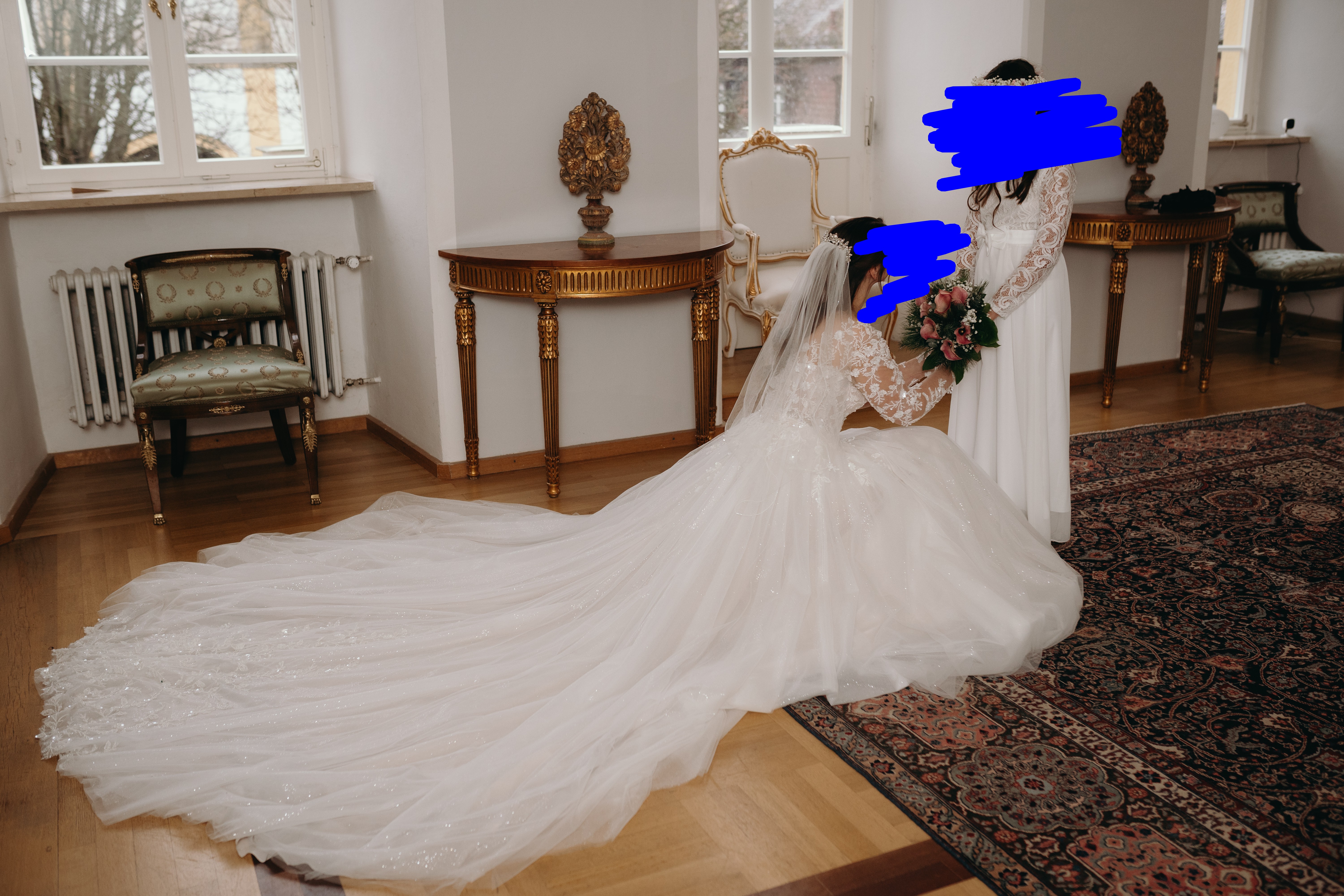 Zustand: Kleinere Gebrauchsspuren (Es ist nichts kaputt, es ist einmal getragen, aber nicht gereinigt. Es war eine Hochzeit in einem Schloss im Winter. Somit war das Kleid max. 1 Stunde draußen)