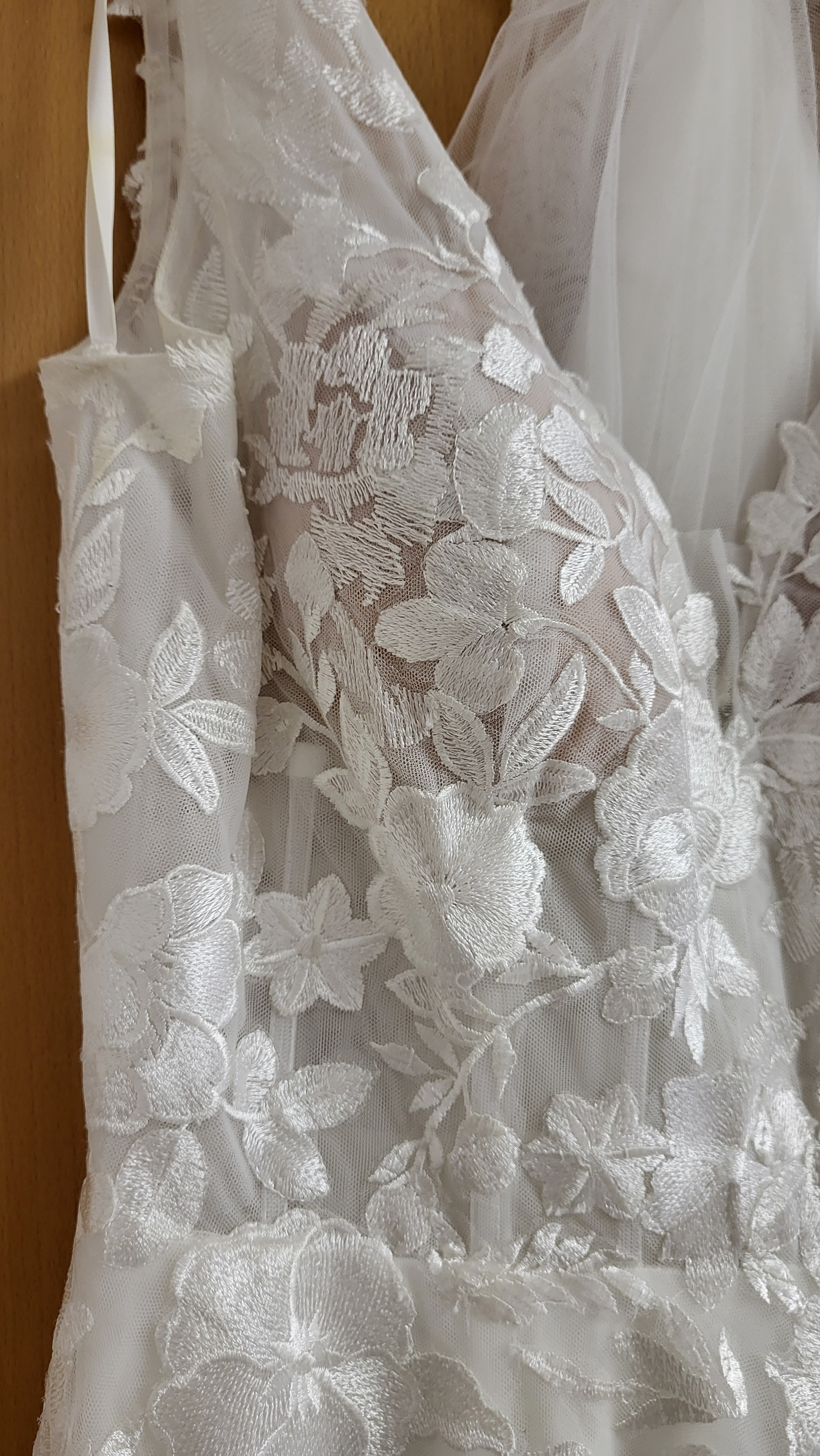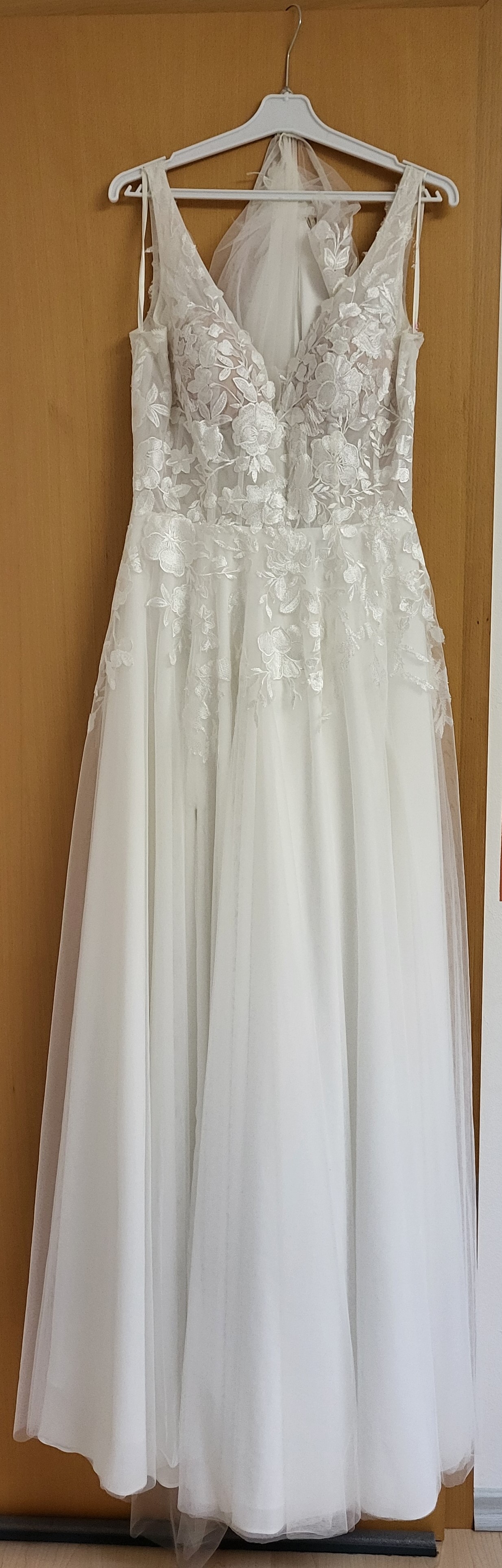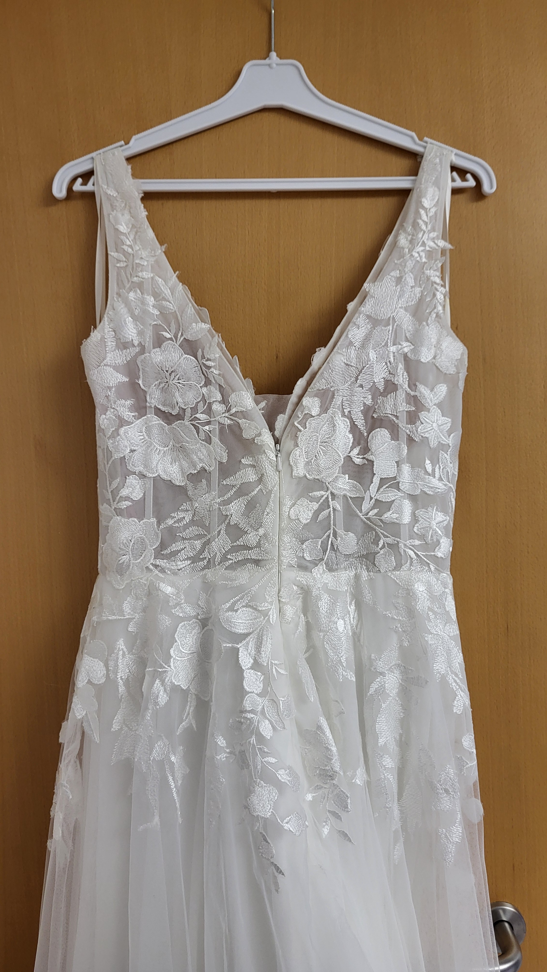 "Hiermit verkaufe ich dieses schöne Brautkleid, welches neu und ungetragen ist. Es ist die Originalgröße und auch noch nicht gekürzt, also ebenfalls die Originallänge. Ich habe es nur einmal bei der Anprobe getragen. Highlights dieses Kleides sind die Leichtigkeit des Kleides und der Beinschlitz. Ich habe mich leider in ein anderes Modell verliebt und suche daher nun jemanden, der in diesem Kleid seinen Brautmoment und Brautauftritt hat!"