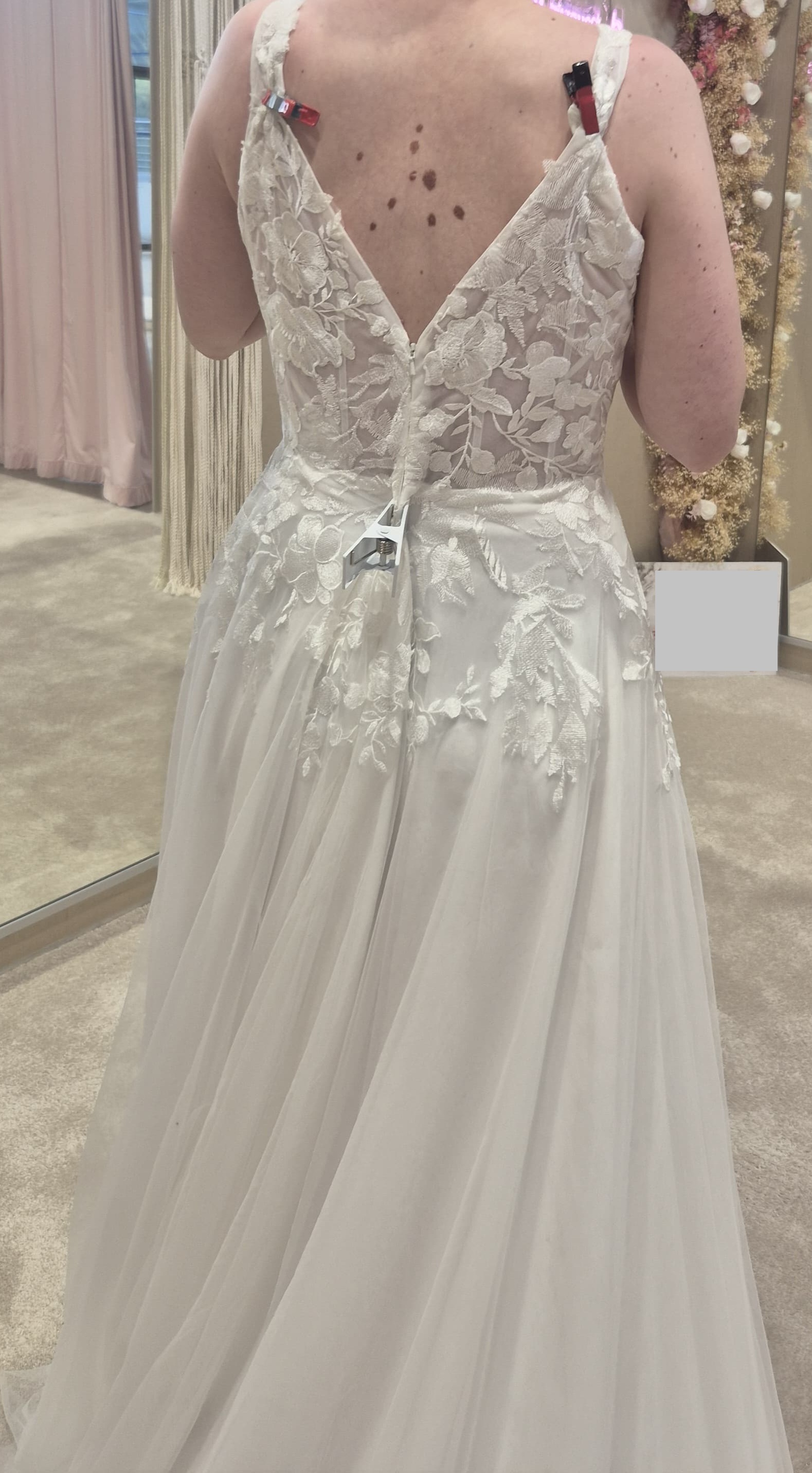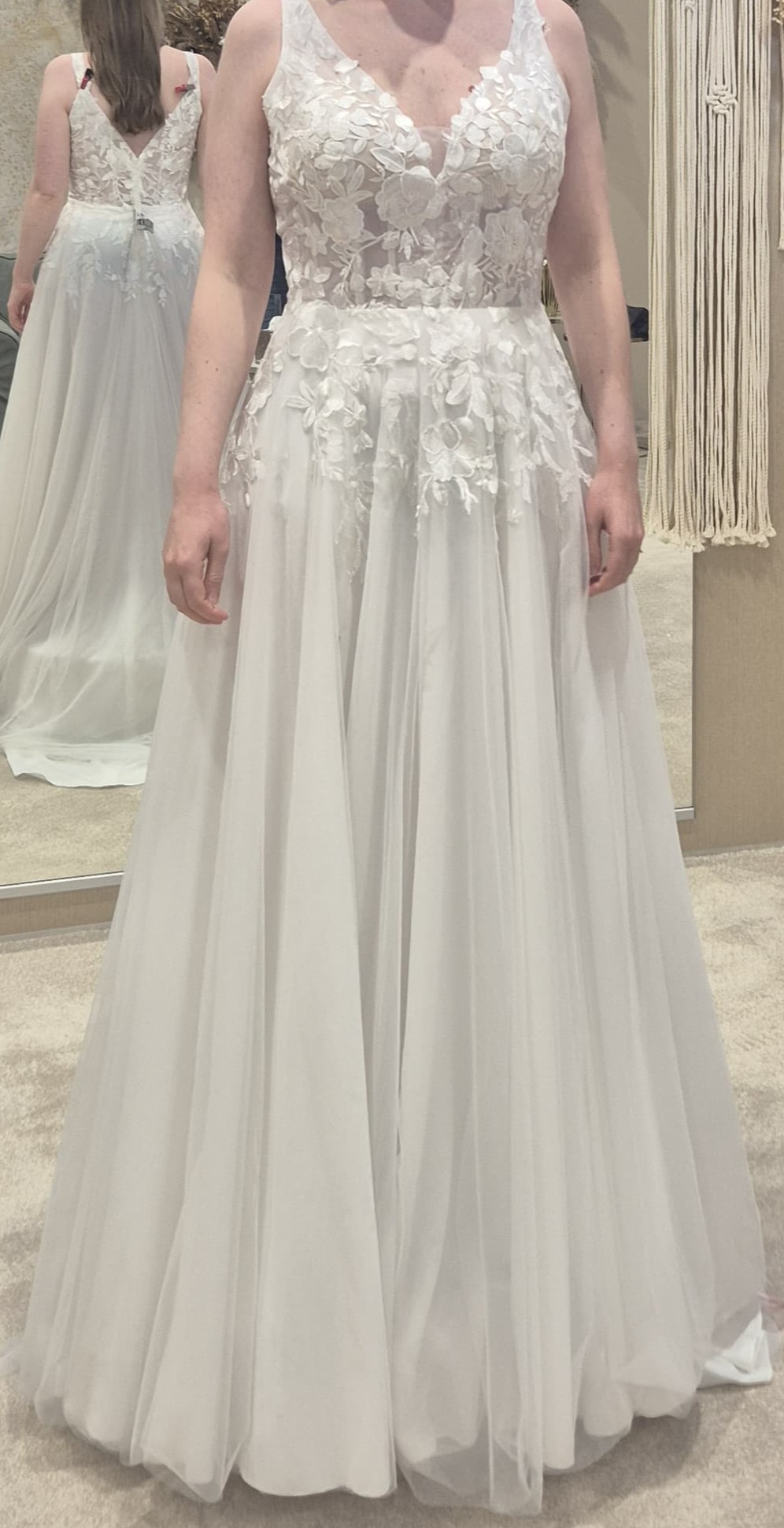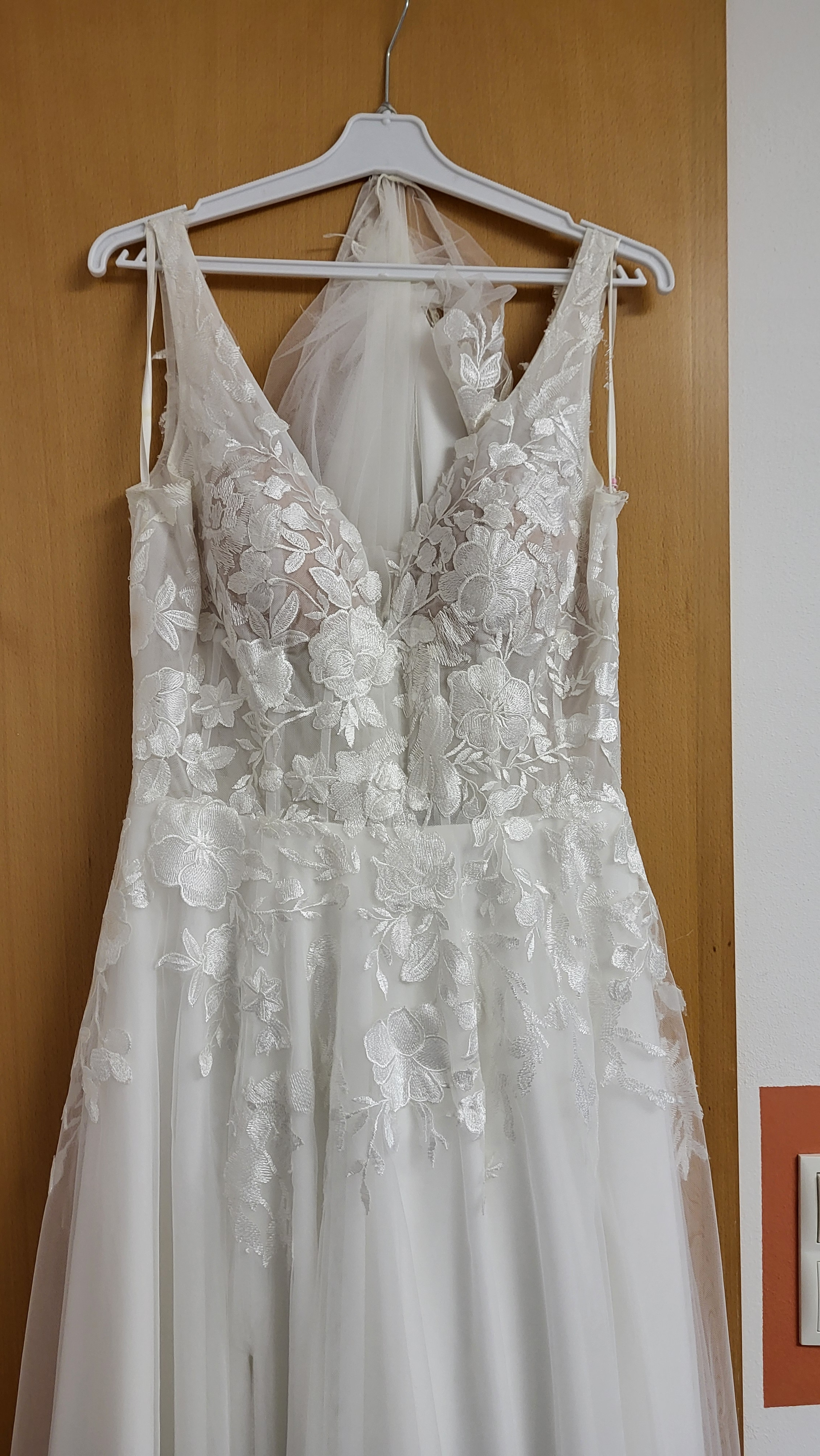 "Hiermit verkaufe ich dieses schöne Brautkleid, welches neu und ungetragen ist. Es ist die Originalgröße und auch noch nicht gekürzt, also ebenfalls die Originallänge. Ich habe es nur einmal bei der Anprobe getragen. Highlights dieses Kleides sind die Leichtigkeit des Kleides und der Beinschlitz. Ich habe mich leider in ein anderes Modell verliebt und suche daher nun jemanden, der in diesem Kleid seinen Brautmoment und Brautauftritt hat!"