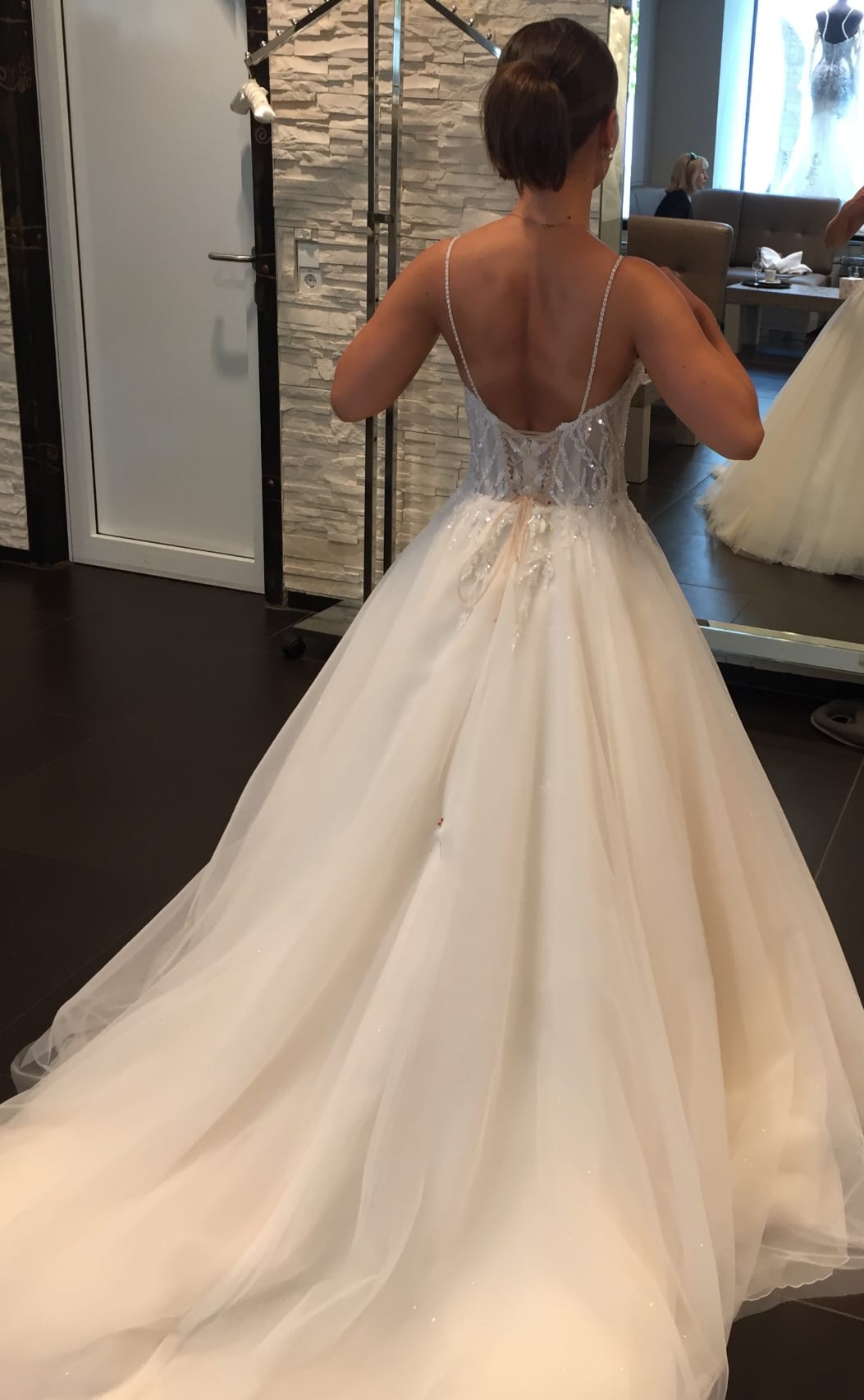 Der obere Teil ist sehr detailverliebt mit Pailletten und feinen Verzierungen. Am Rücken gibt es eine Schnürung. Der Rock hat unter dem Tüll leichte Glitzerpartikel, was eine wunderschöne Optik gibt. Ein kleine Schleppe hat das Kleid.