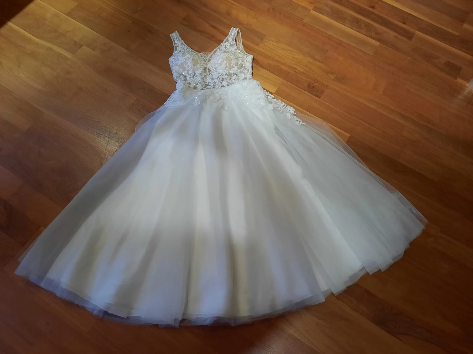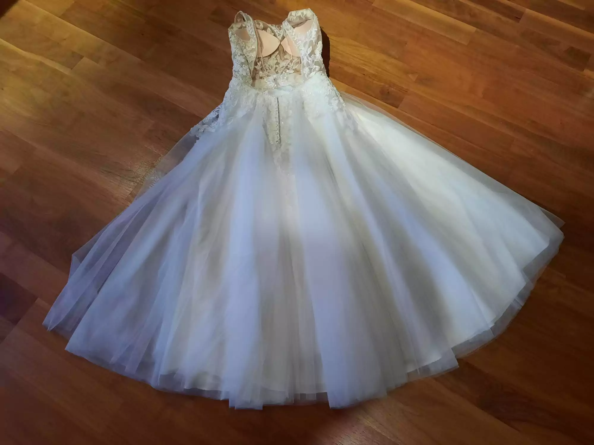 "Das Kleid hat einen schönen, tiefen Rückenausschnitt. Die Spitze verläuft in den Tüllrock.