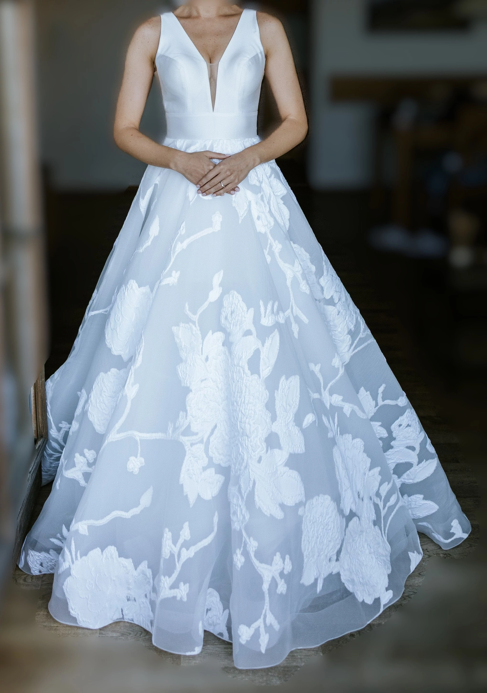 "Das Kleid ist Größe 38, fällt aber aus wie eine 36. In der Länge wurde nichts gekürzt, lediglich die Träger wurden um 1cm verkürzt, sowie der Tüll im Ausschnitt ein wenig verengt. Beide Änderungen können aber problemlos aufgelassen werden. Das Kleid wurde professionell gereinigt und schaut aus wie neu.