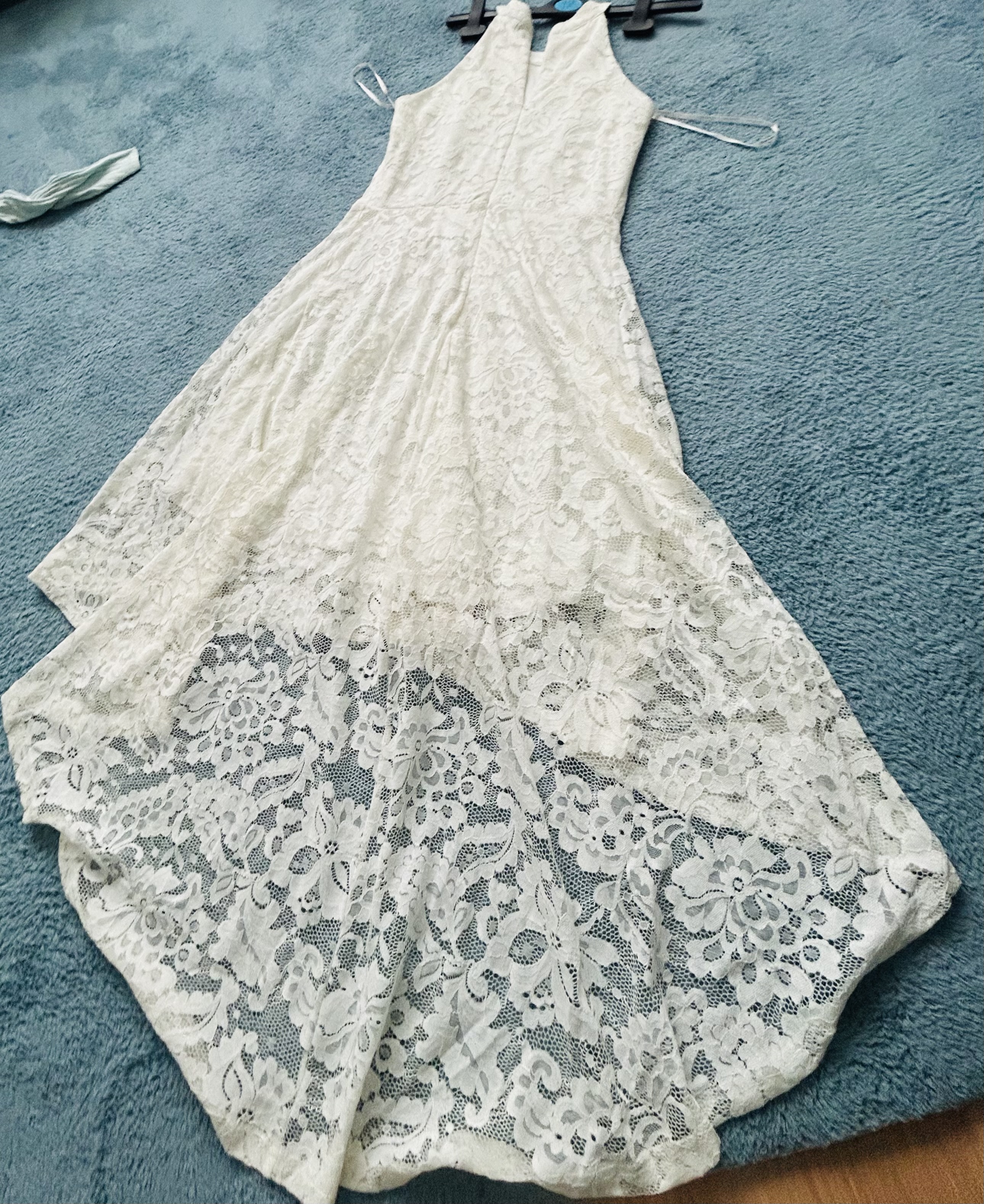 "Der schnitt , sportlich elegant am Bein vorne etwas frei und hinten schleppe - so leicht und schön - es war einfach passend. Oben der Kragen - Arme schön frei, wirkte man schlank. "