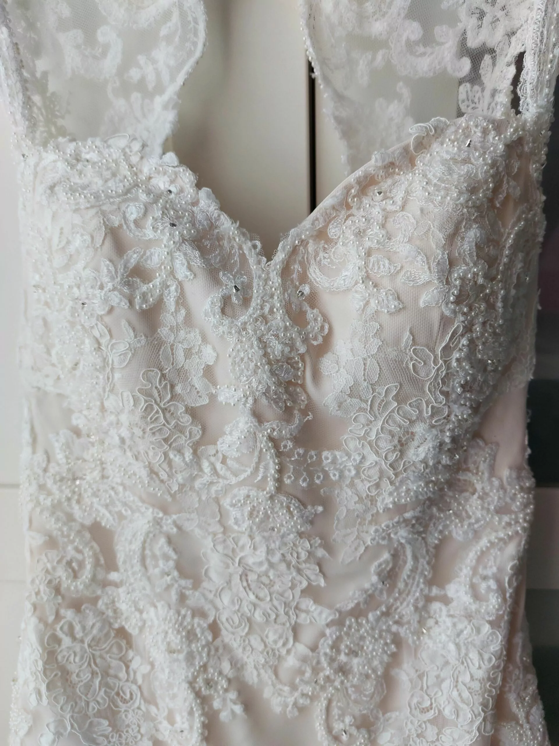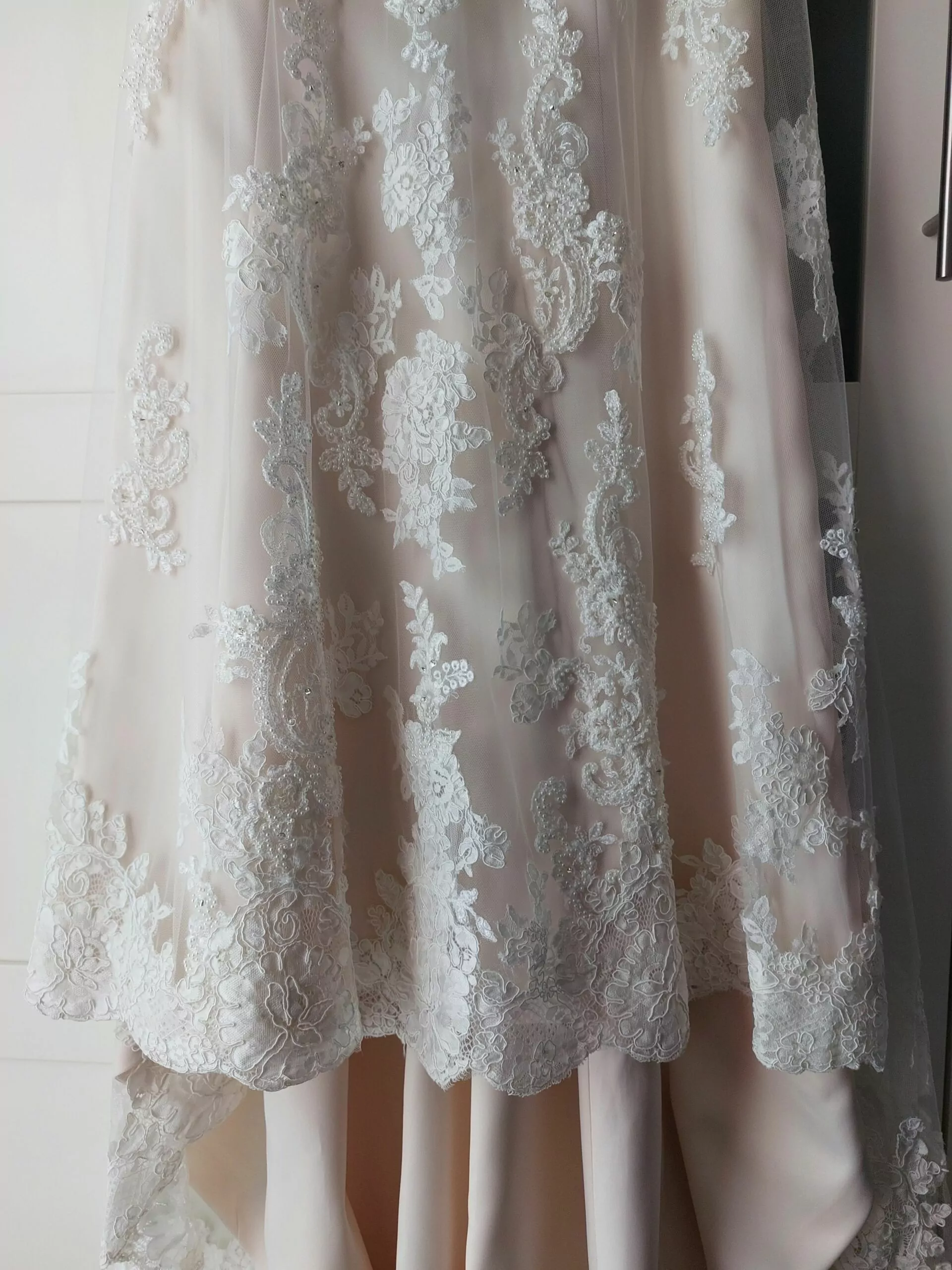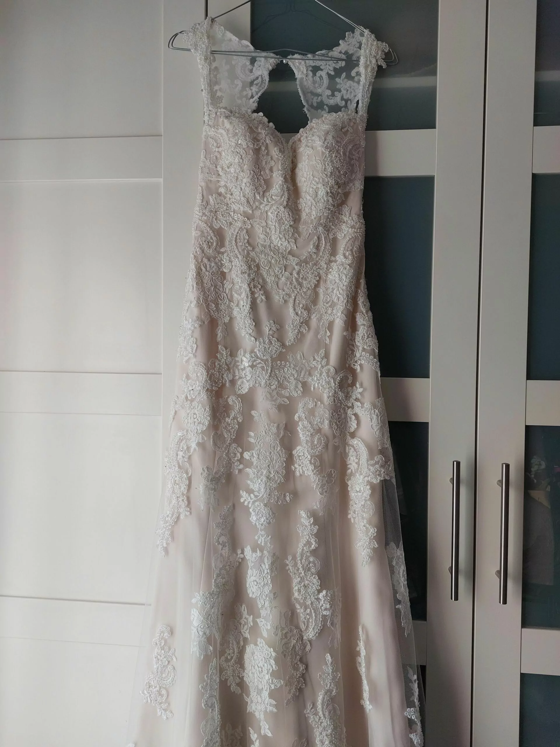 "Das Modell Inaru hat eine außergewöhnliche Spitze, die durch das champagnerfarbene Unterkleid besonders zur Geltung kommt. Das Kleid wurde gekürzt, was sehr aufwendig war, da die meisten Kleider für eine Körpergröße von 178 cm angefertigt werden. Das Kleid ist vom Träger bis zum Boden etwa 150 cm"