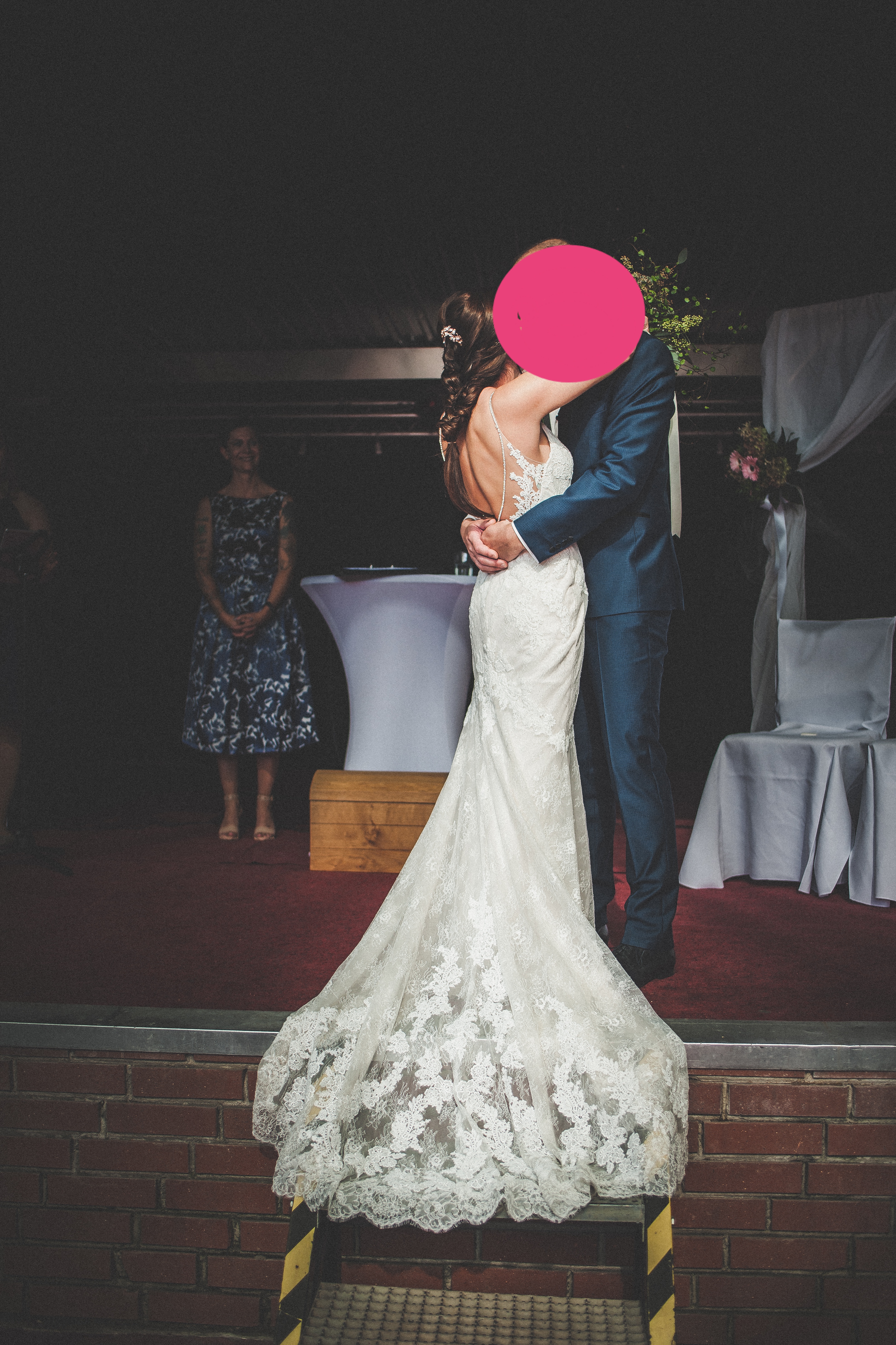 Größe: 38 - Wurde kurz vor der Hochzeit nochmal enger gemacht, sodass es eher fast 36 ist. Wurde gekürzt. Ich bin 1,58cm groß und habe 10 cm hohe Schuhe getragen.