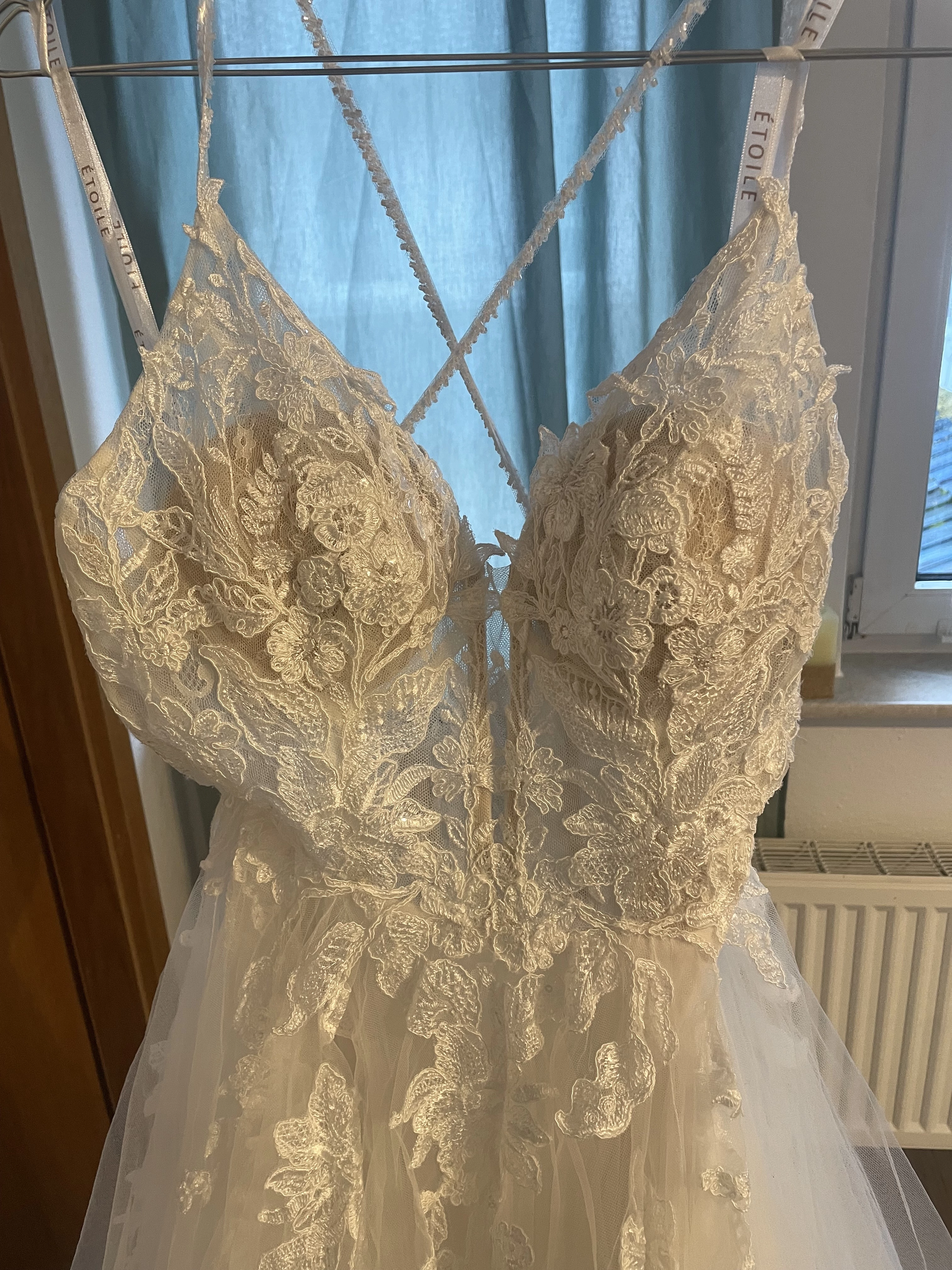 Das Brautkleid ist in der Farbe ivory/nude. Das Kleid wurde auf eine Länge von 1,75m (1,70m Körpergröße + 5 cm Schuhe) gekürzt. Der Tüll hat von der wilden Party 3 kleinere Beschädigungen (ein Riss, 3 Löcher) abbekommen. Diese fallen beim Tragen des Kleides absolut gar nicht auf!