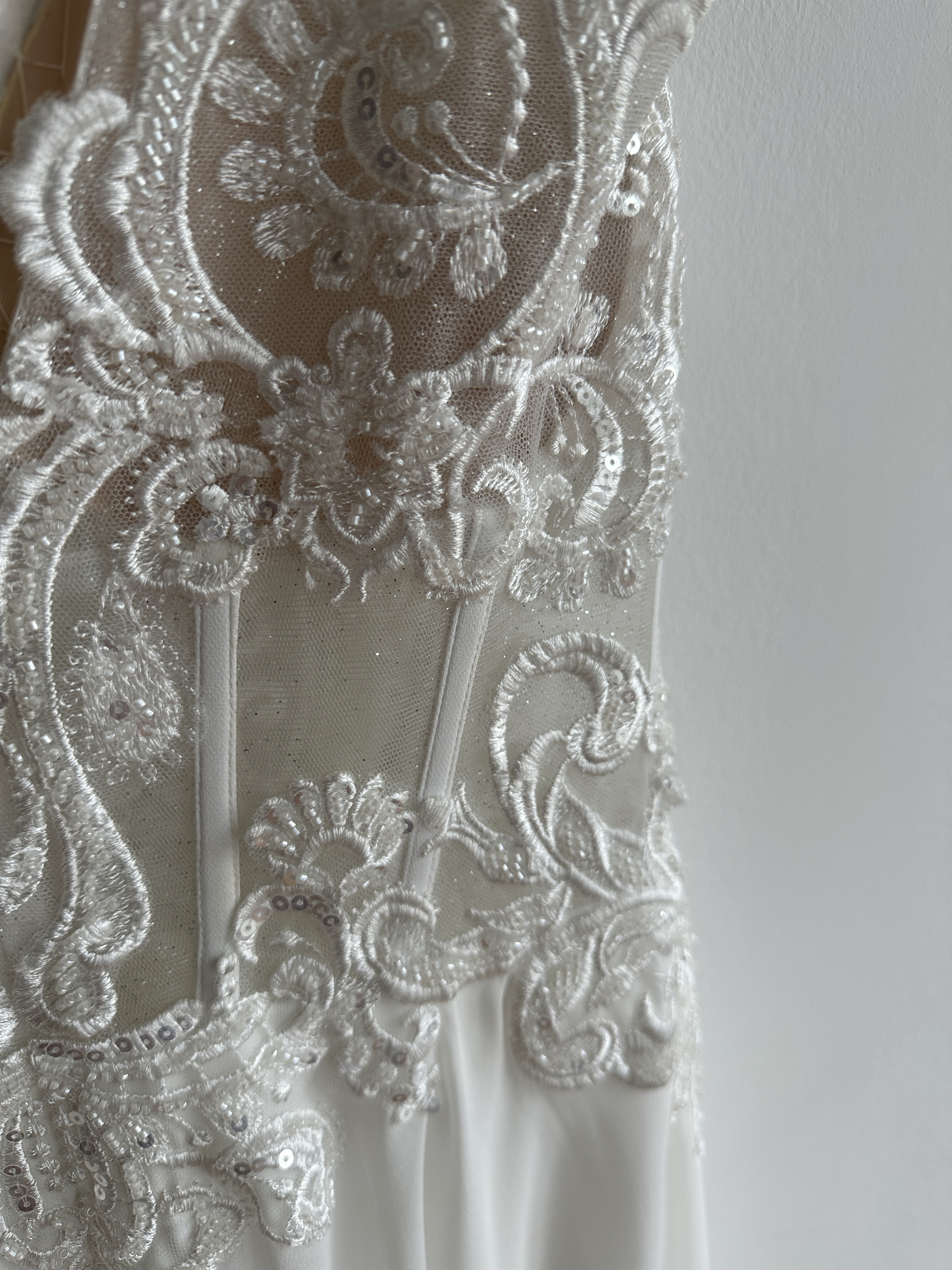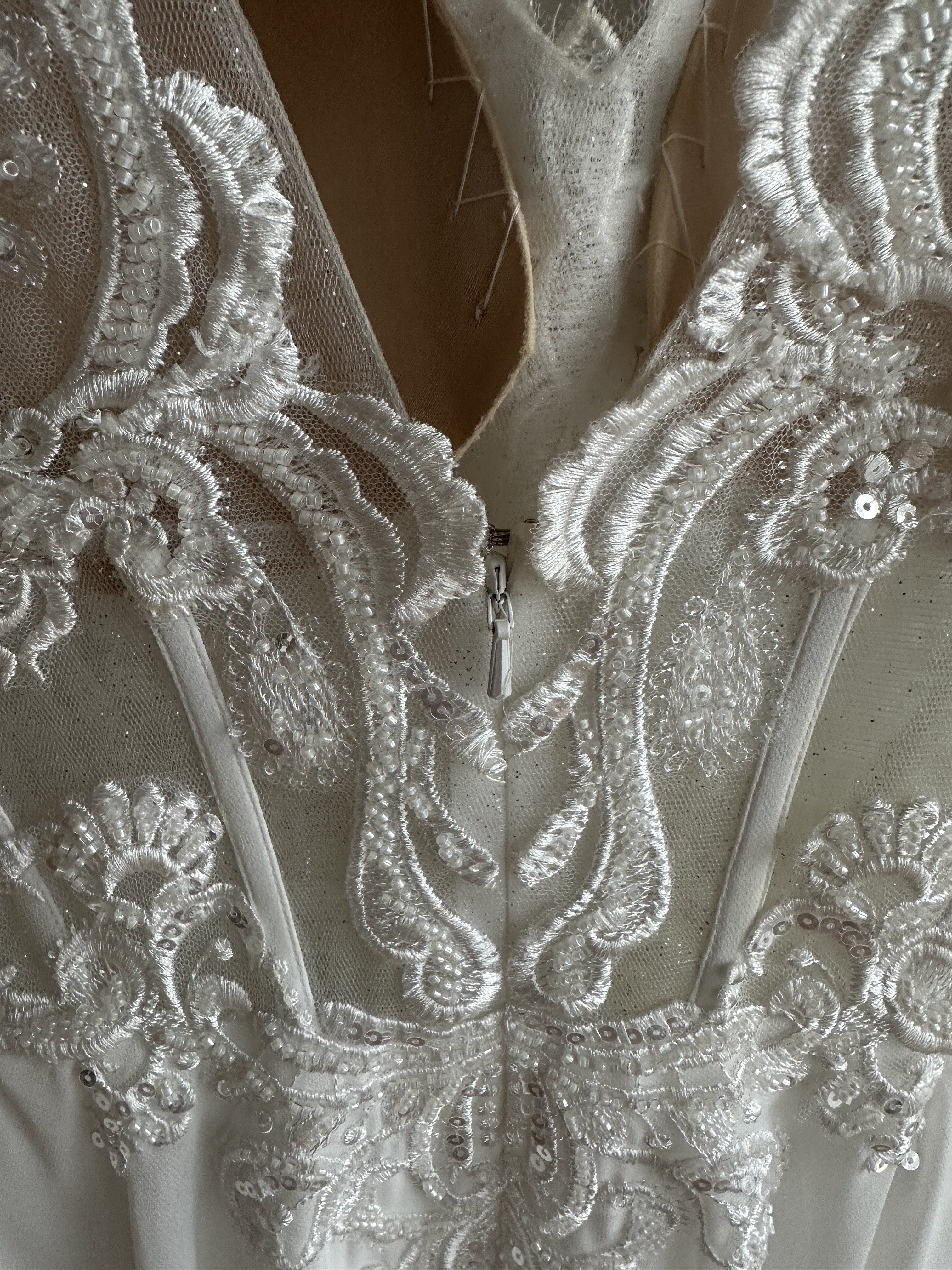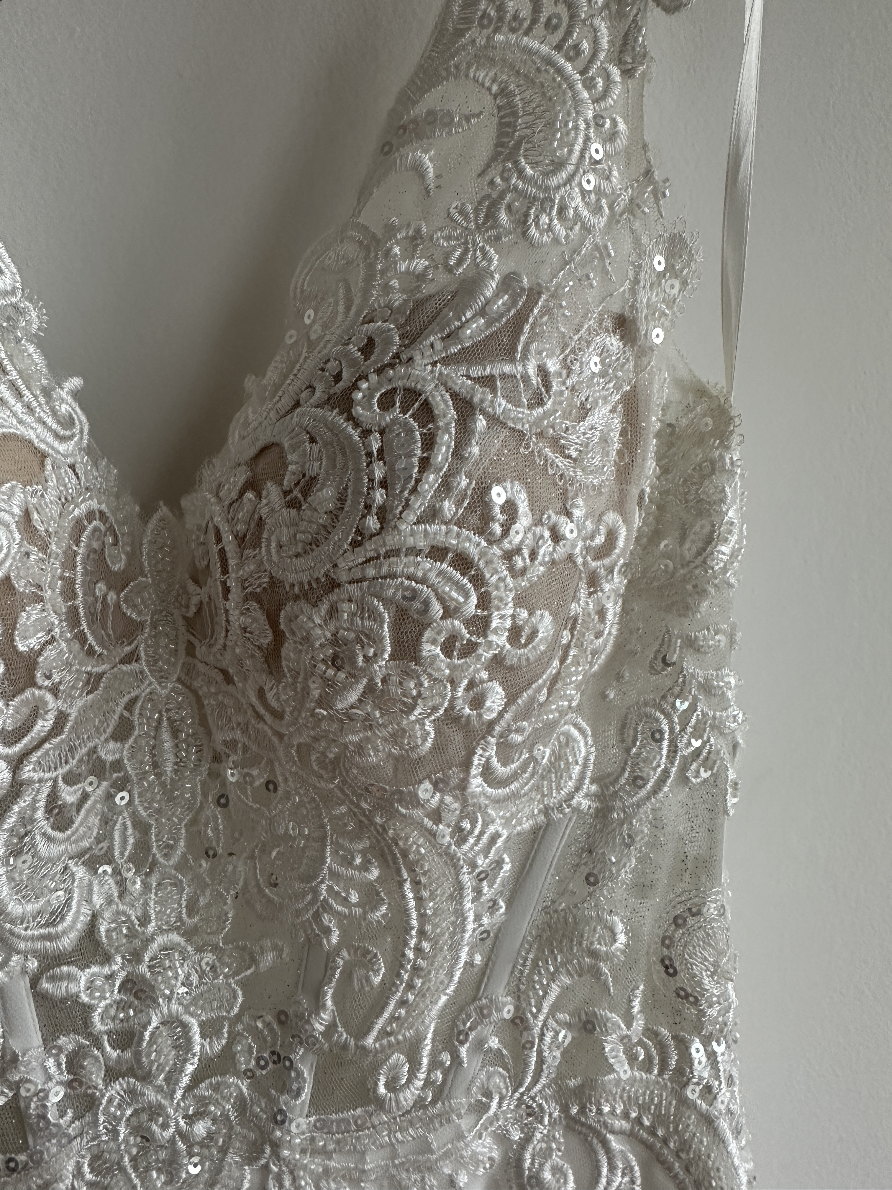"Wunderschönes Brautkleid in A-Linien-Schnitt, das durch das detailliert gearbeitete Spitzenoberteil mit tiefem V-Ausschnitt und zarten Trägern besticht. Die filigranen Stickereien, die glitzernden Paletten und die transparente Optik verleihen dem Kleid eine romantische und zugleich moderne Note. Durch die eingearbeiteten "Stäbe" (nicht fest) ähnelt das Oberteil einer Corsage.