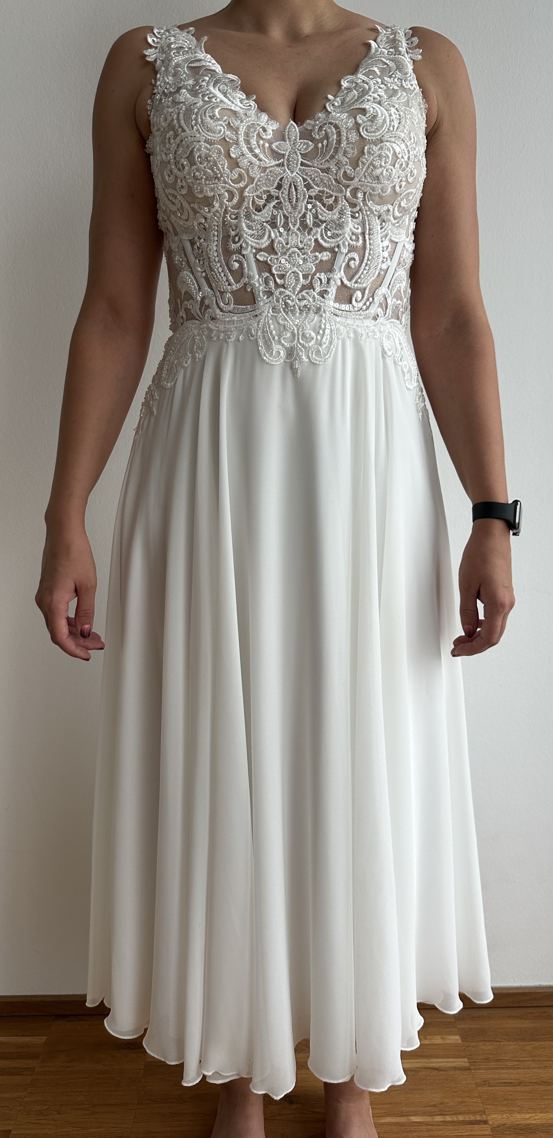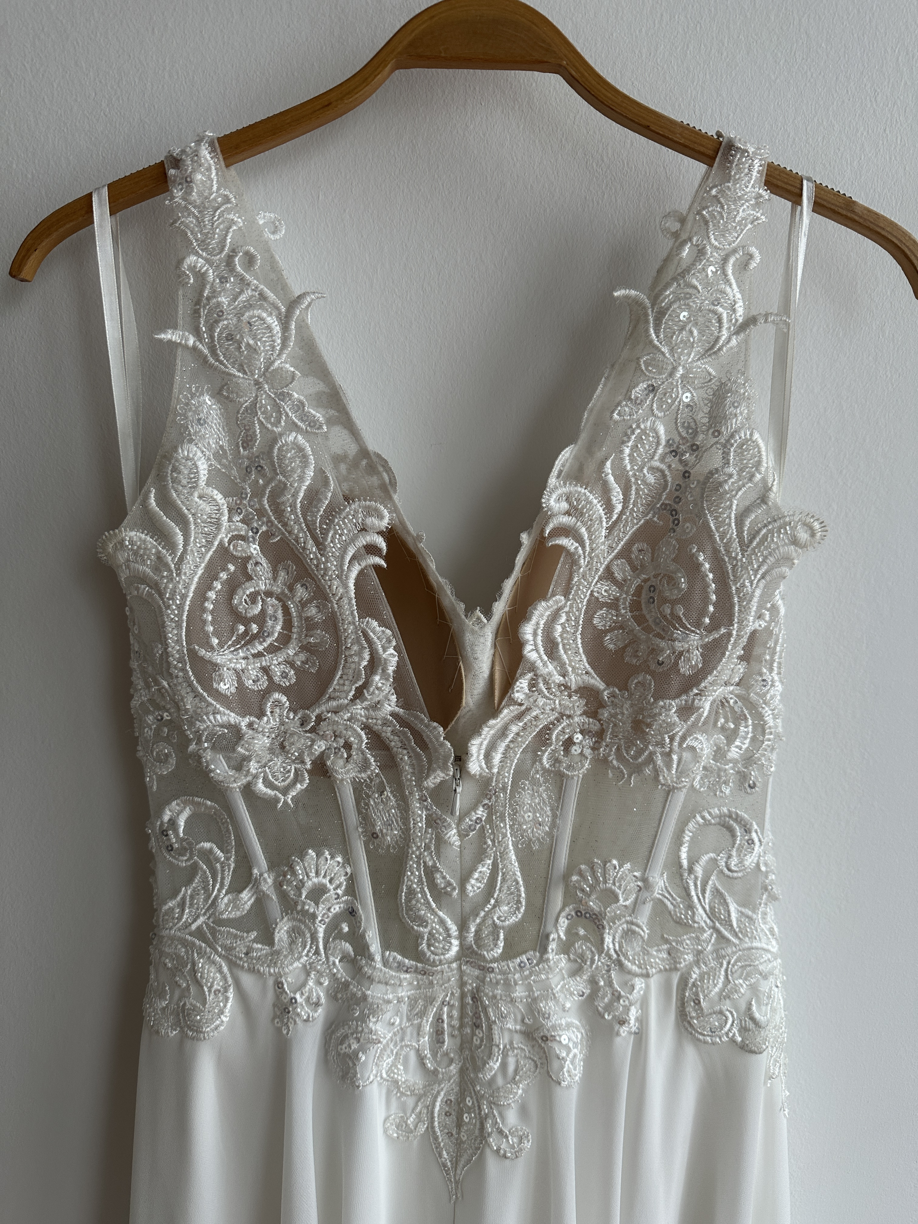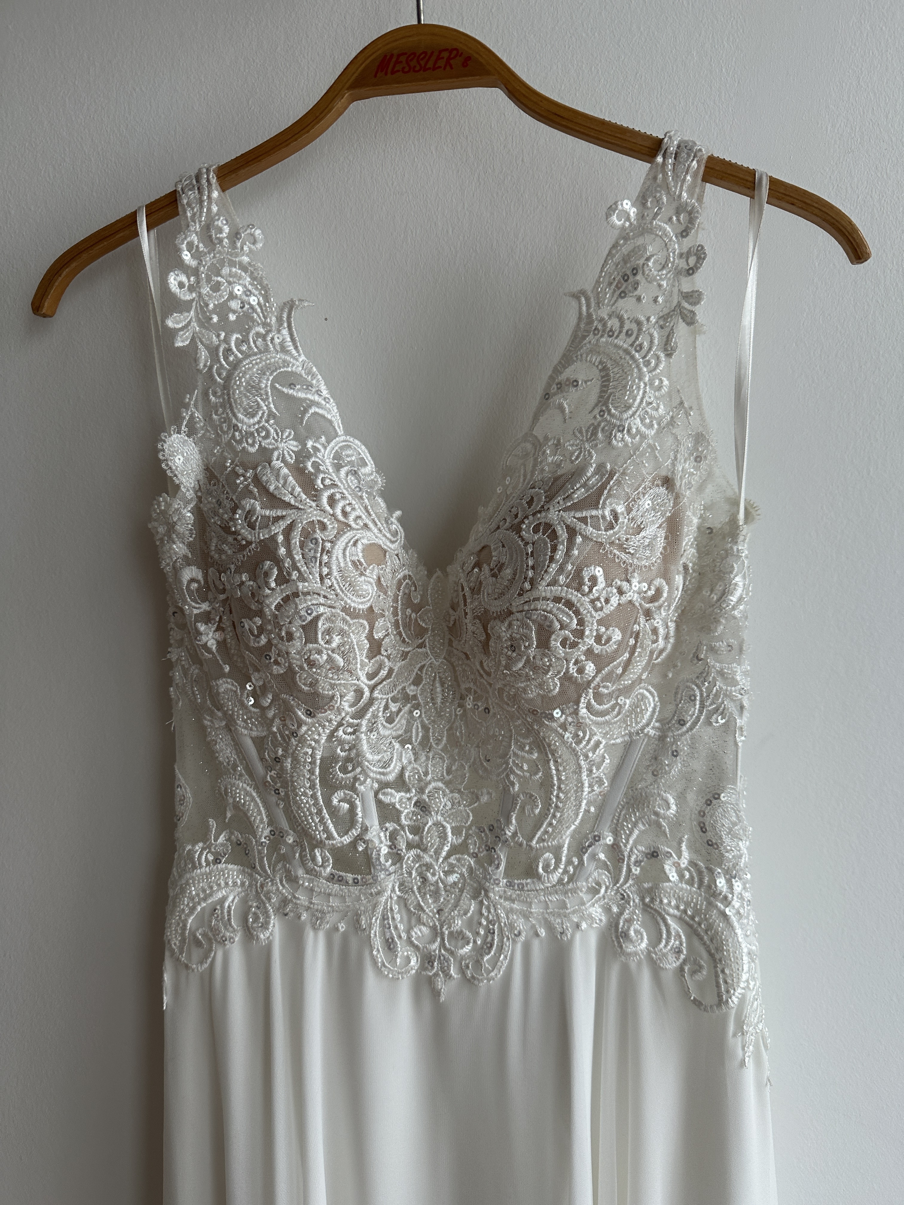 "Wunderschönes Brautkleid in A-Linien-Schnitt, das durch das detailliert gearbeitete Spitzenoberteil mit tiefem V-Ausschnitt und zarten Trägern besticht. Die filigranen Stickereien, die glitzernden Paletten und die transparente Optik verleihen dem Kleid eine romantische und zugleich moderne Note. Durch die eingearbeiteten "Stäbe" (nicht fest) ähnelt das Oberteil einer Corsage.
