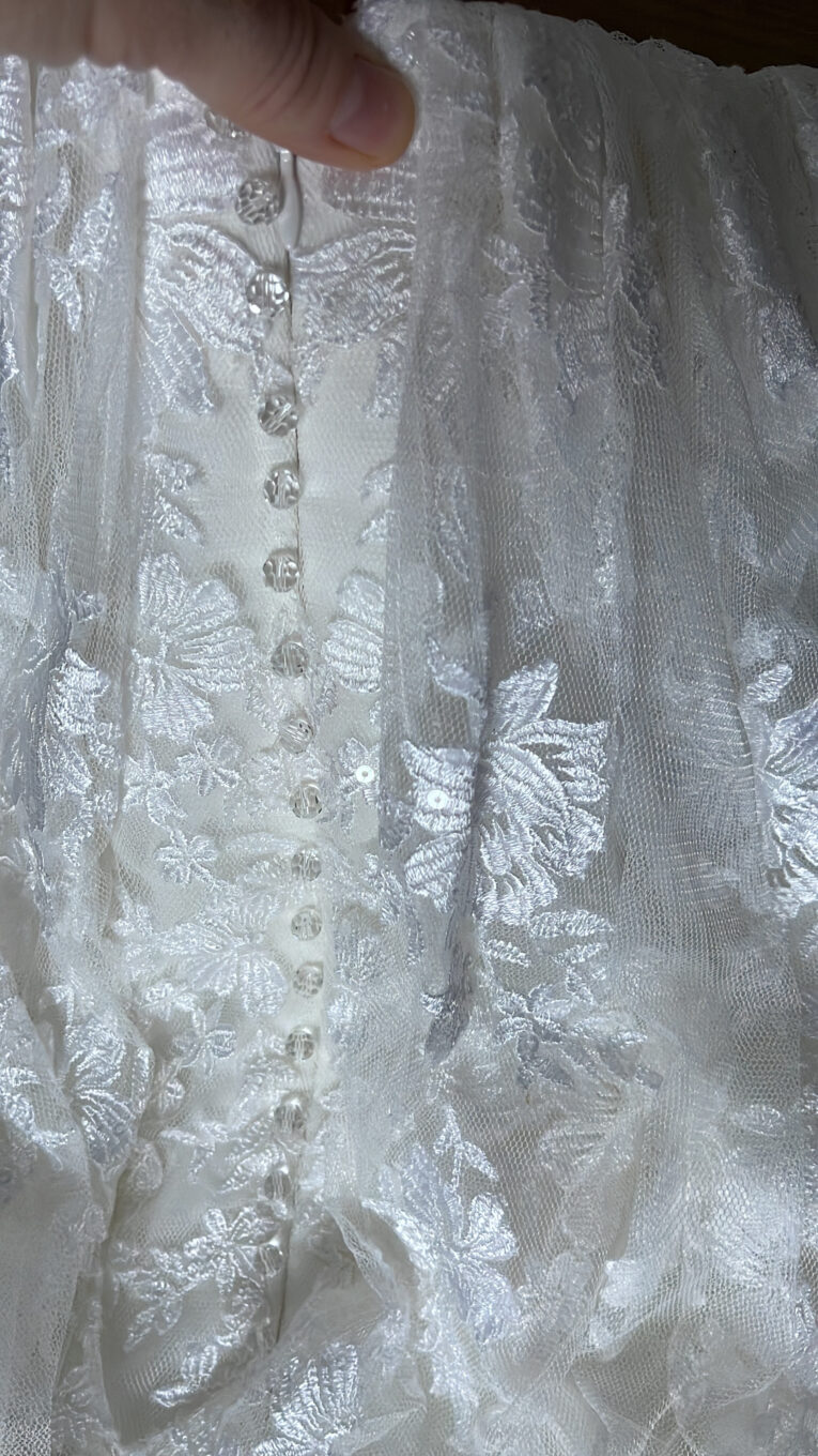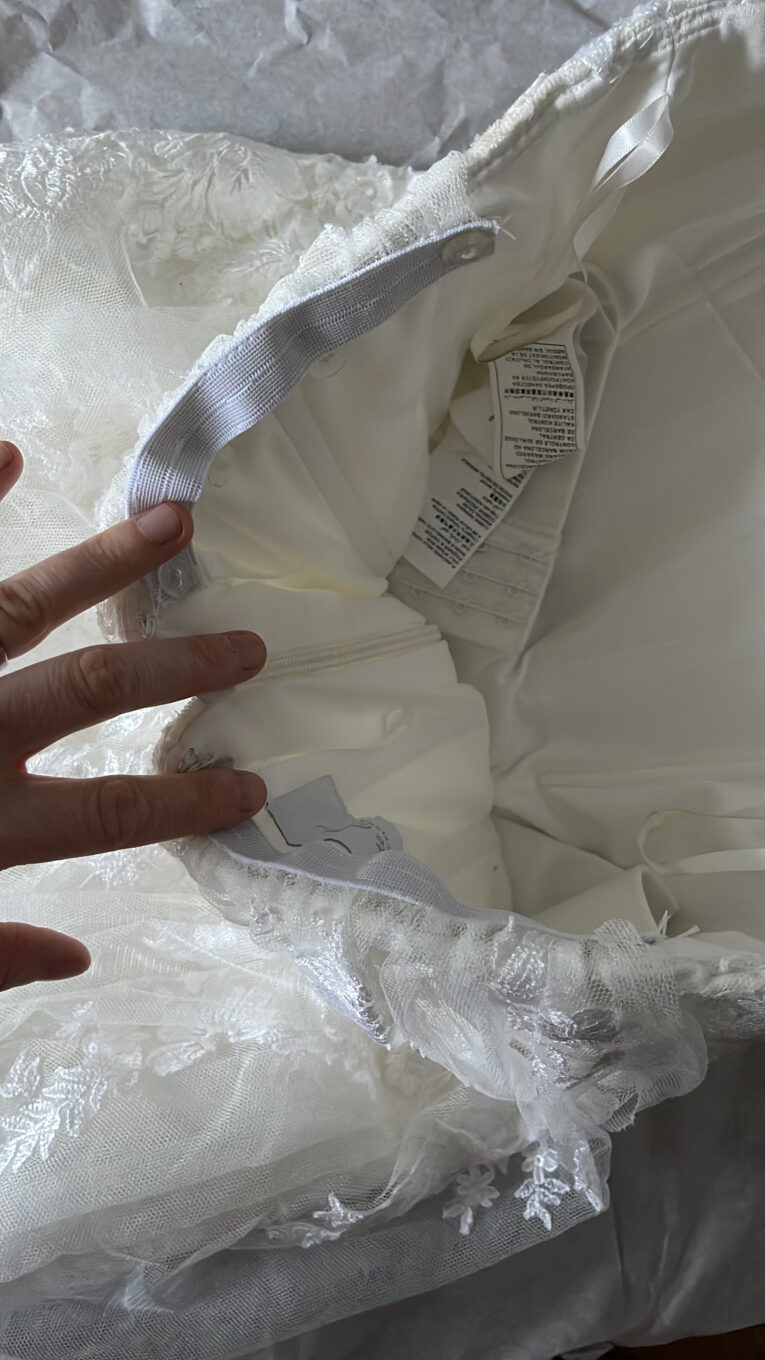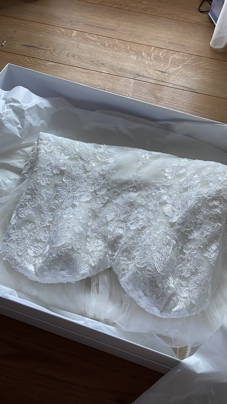 "Ein leichtes, elegantes aber auch verführerisches Kleid . Wurde professionell gereinigt. Keine Mangel . Eine Schutzhülle sowie ein spezielles Karton für Hochzeitkleider in Wert von 100€ ist dabei. "