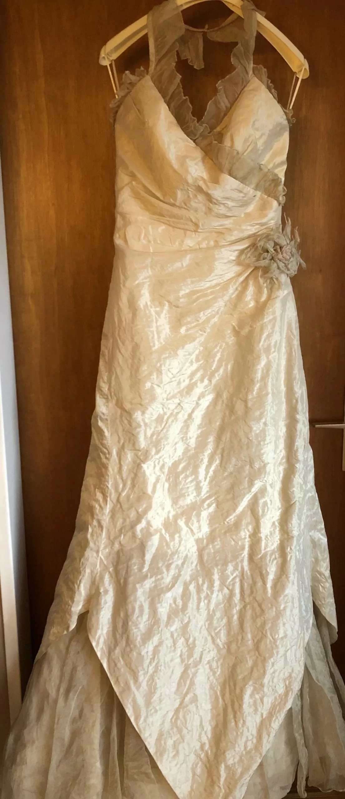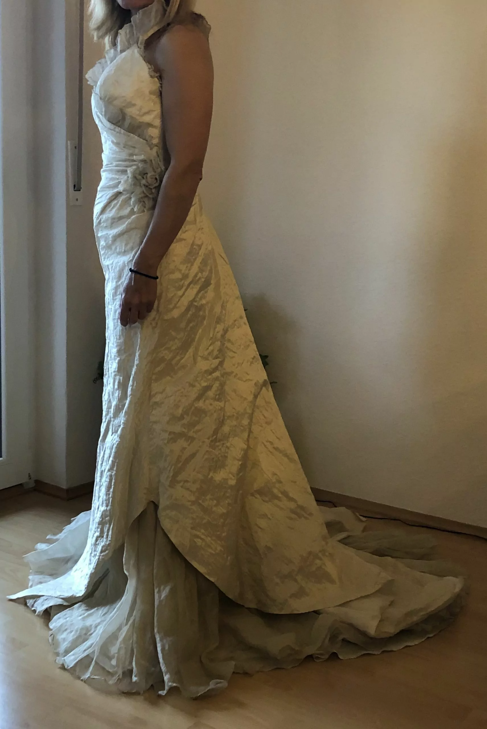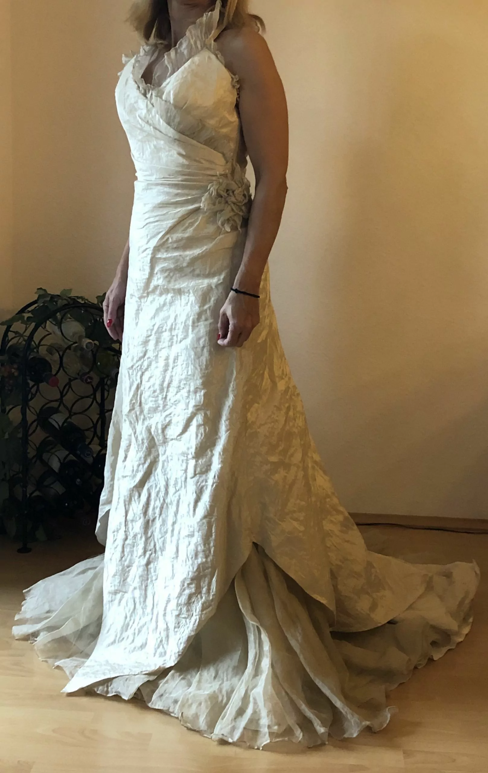 "Wunderschönes Brautkleid aus reiner Wildseide in Elfenbein und in Größe 38. Neu wurde nie getragen. Nicht geändert. Tiefer Rücken. Blume an der Seite."