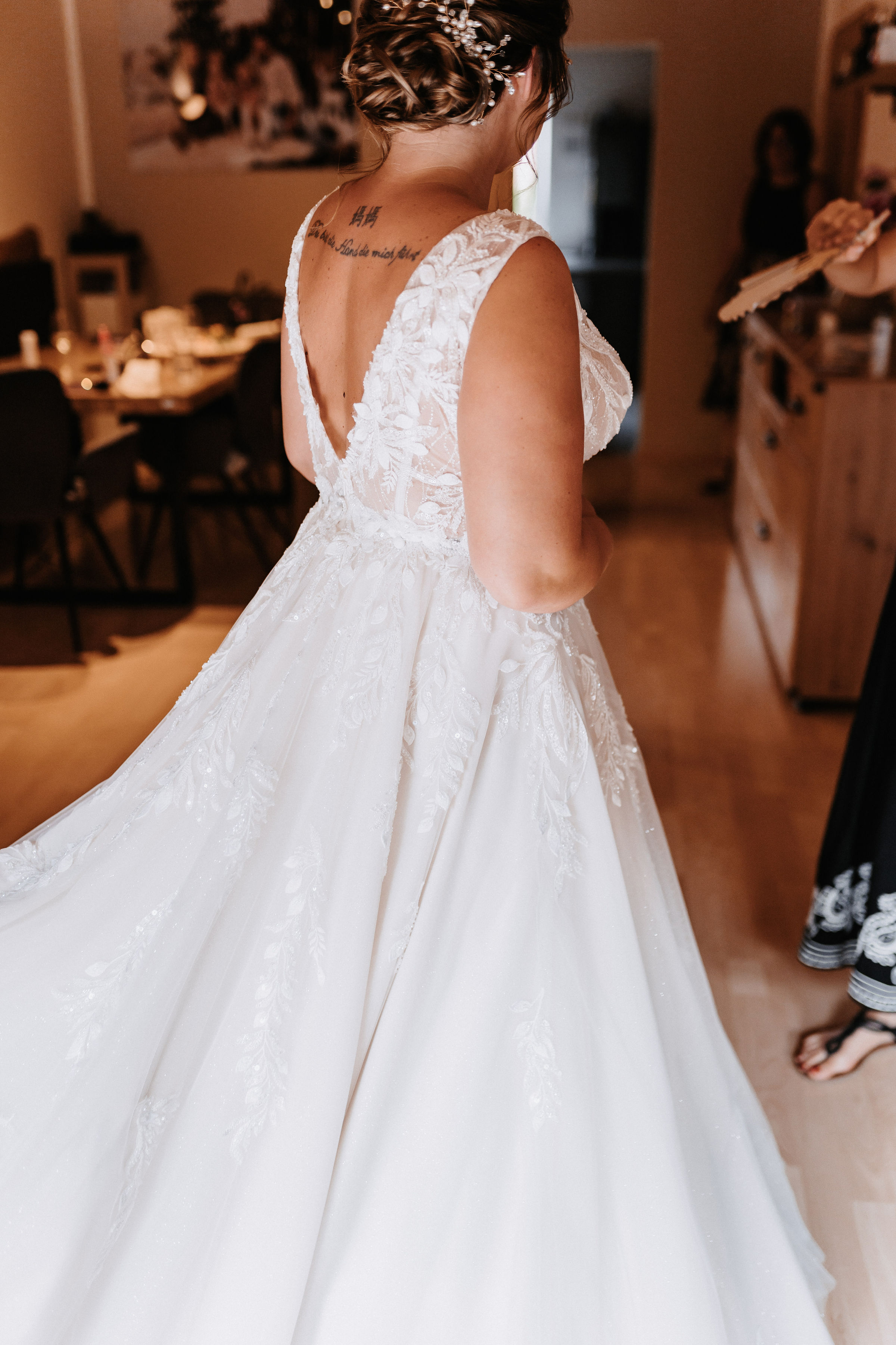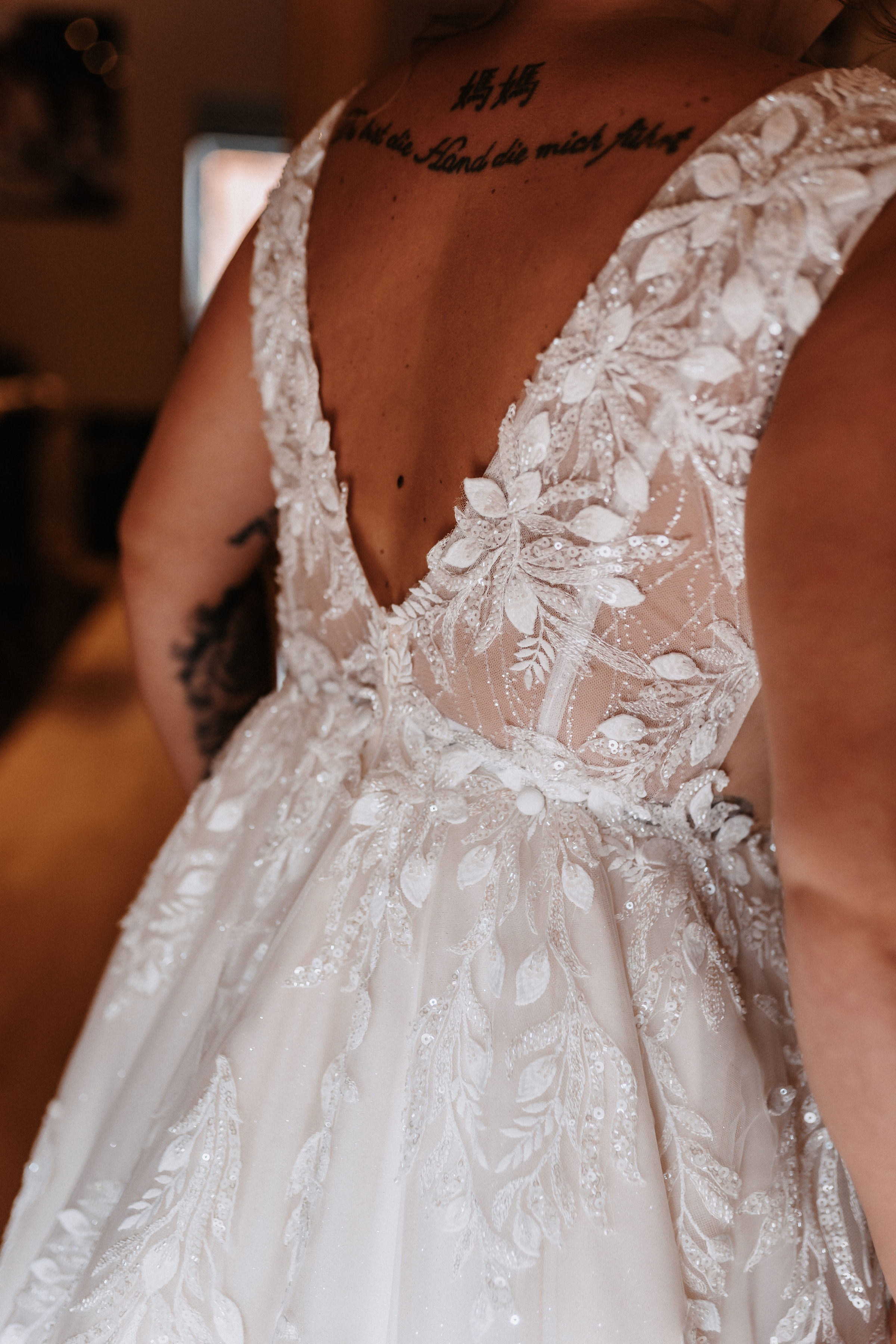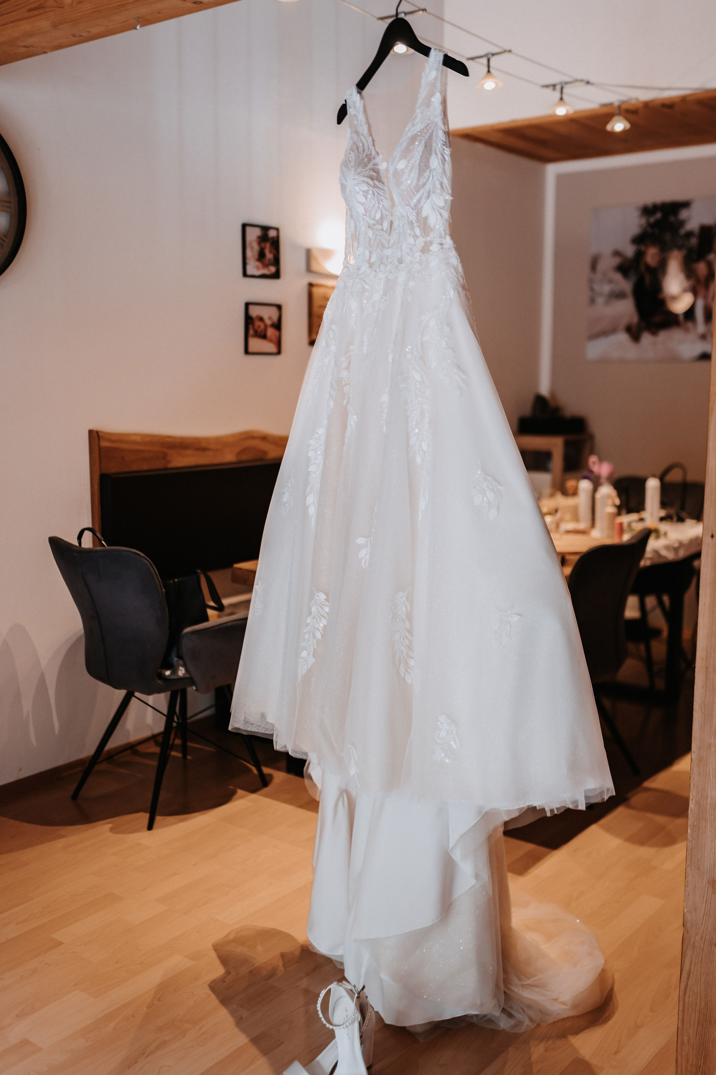 Das Oberteil ist fein mit floraler Spitze gearbeitet und zaubert durch den schmeichelhaften Schnitt eine wunderschöne Silhouette. Der tiefe V-Ausschnitt vorne und hinten wirkt elegant und feminin, ohne aufdringlich zu sein. Der weich fallende Tüllrock mit zarten Spitzenapplikationen und Glitzer sorgt für einen zeitlosen, romantischen Look und lässt sich angenehm tragen.