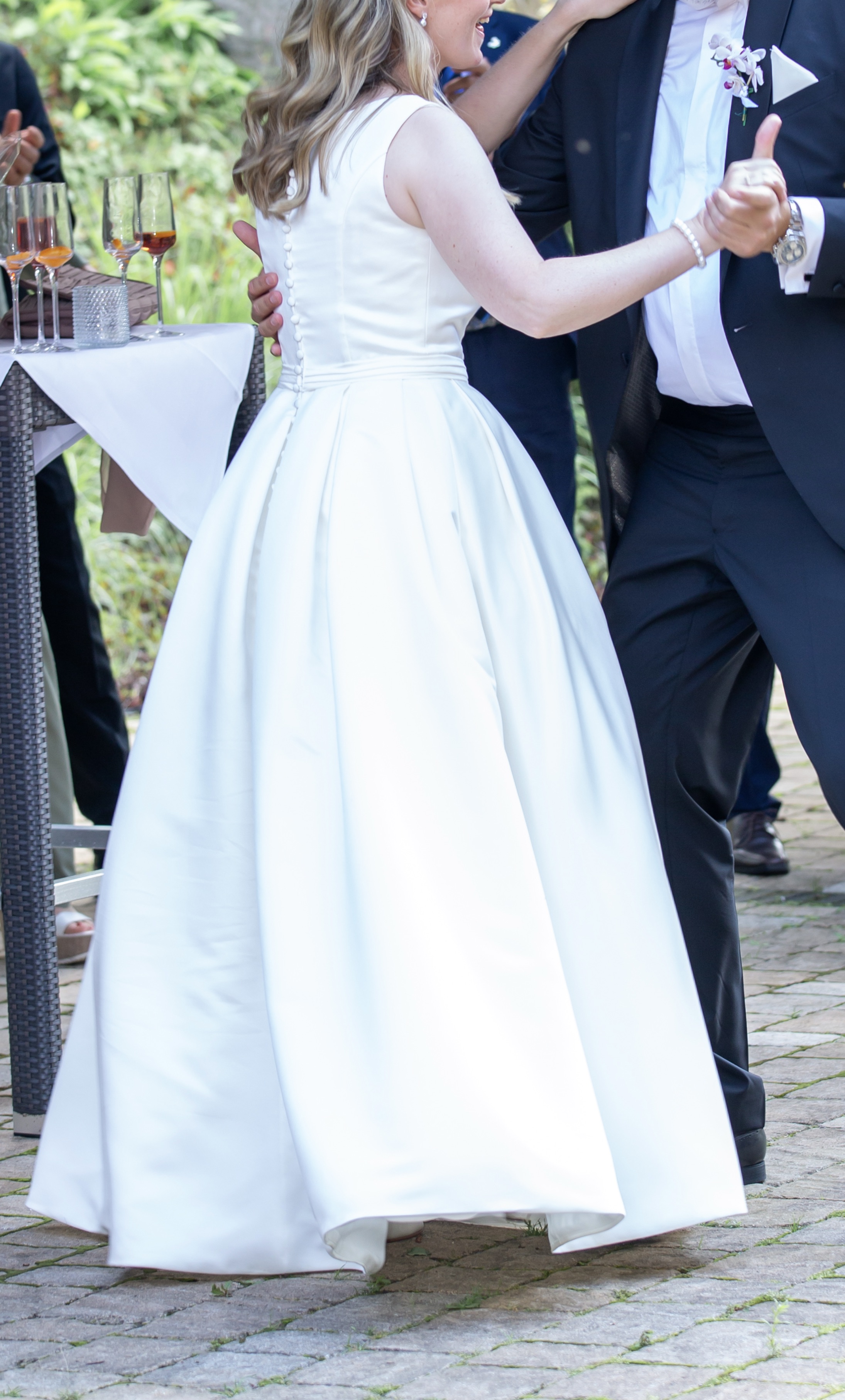 große Taschen an den Seiten, keine Schleppe und damit große Bewegungsfreiheit,