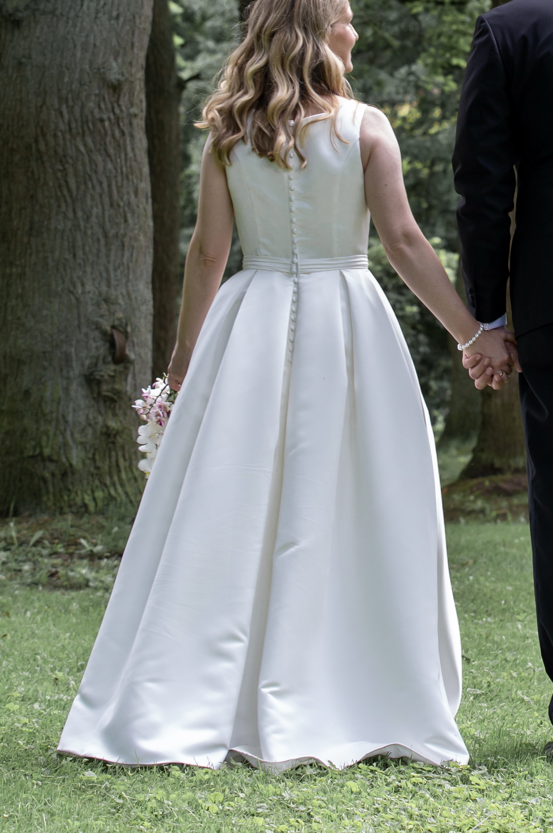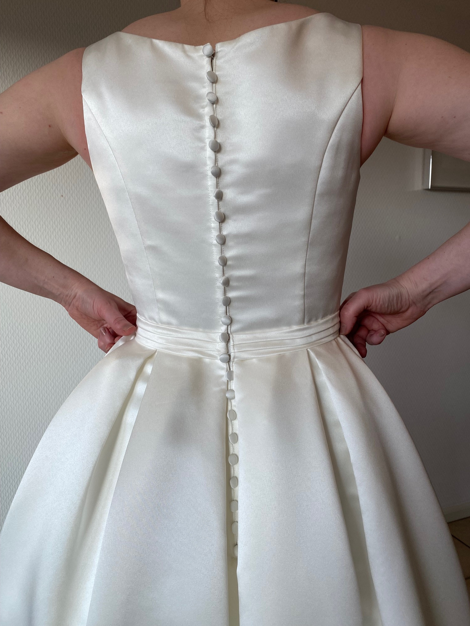 Faltenband an der Taille, lange Knopfleiste mit Satinknöpfen am Rücken, darunter Reißverschluss,