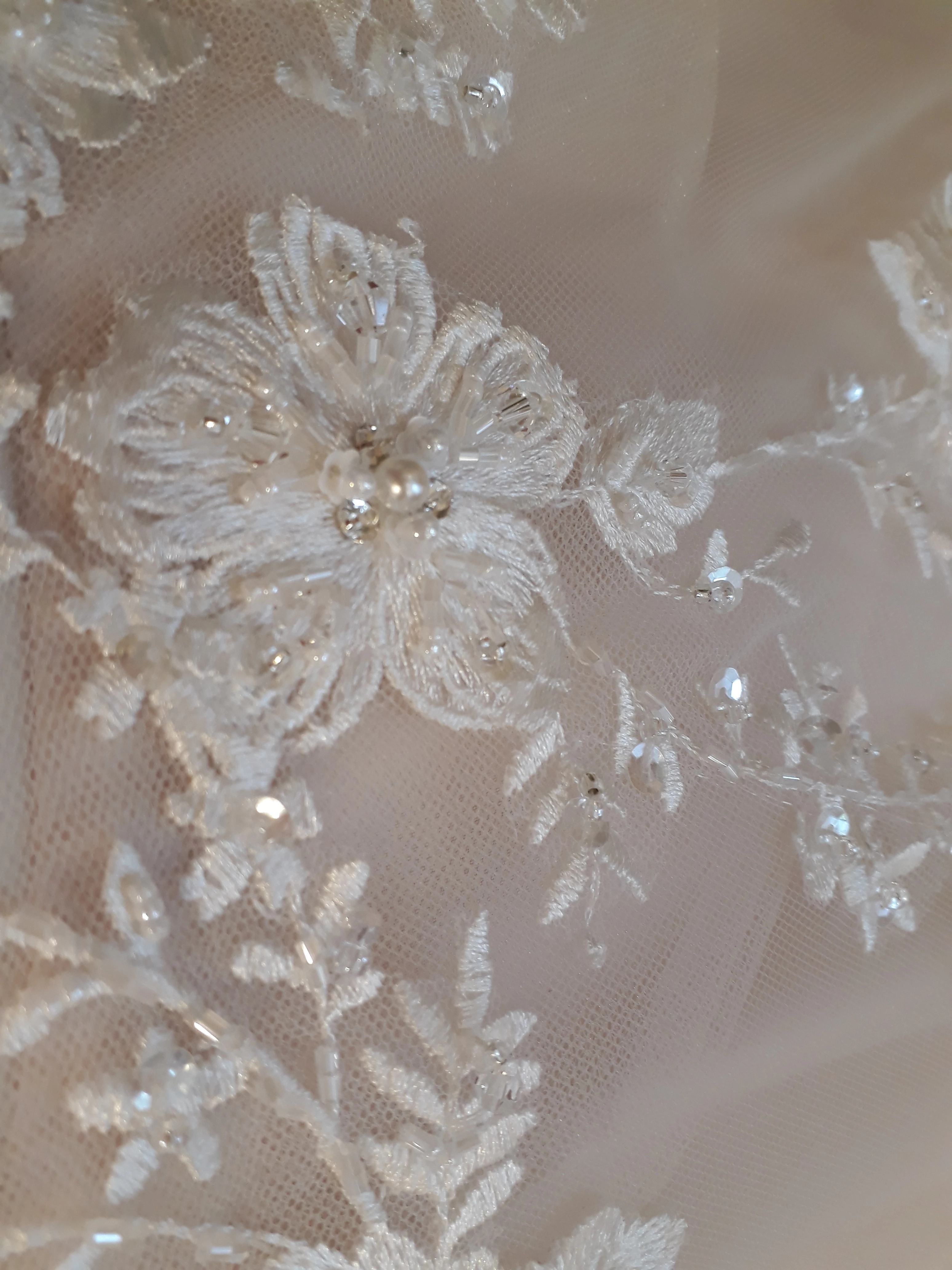 Nicht getragen wegen Corona! Inzwischen Kind bekommen! Bei Orchidee in Ahlen gekauft. Hinten mit Schnürung. Mit Schleier. Mit Reifrock. Ohne Schuhe. Bin 168 cm. Meine Schuhe 6 cm Absatz. Spitze an Unterkante Kleid noch nicht festgenäht, damit Länge des Kleides variabel. Kann z. B. Orchidee fertigstellen. Ich kann Kontakt herstellen.