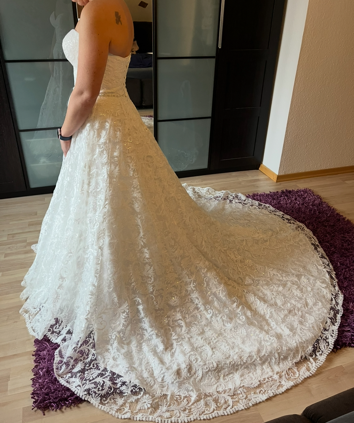 Ich habe mich sehr wohl gefühlt und meinen Tag sehr genossen. Vielleicht kann ich mit dem Kleid noch eine andere Braut glücklich machen. Das Kleid ist bereits gereinigt und bereit für seine nächste Braut."
