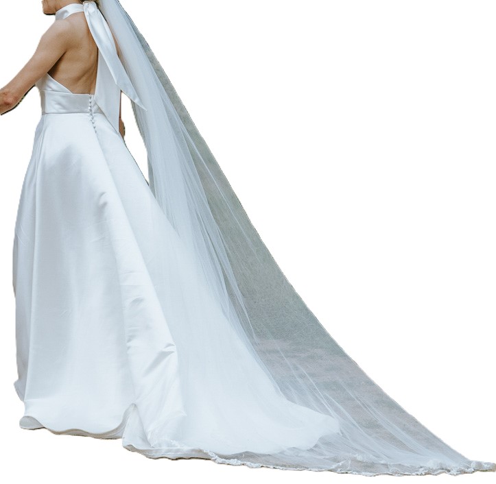 *Schnitt: Neckholder-Ausschnitt mit tiefem V-Dekolleté, fließender bodenlanger Rock mit Schleppe.
