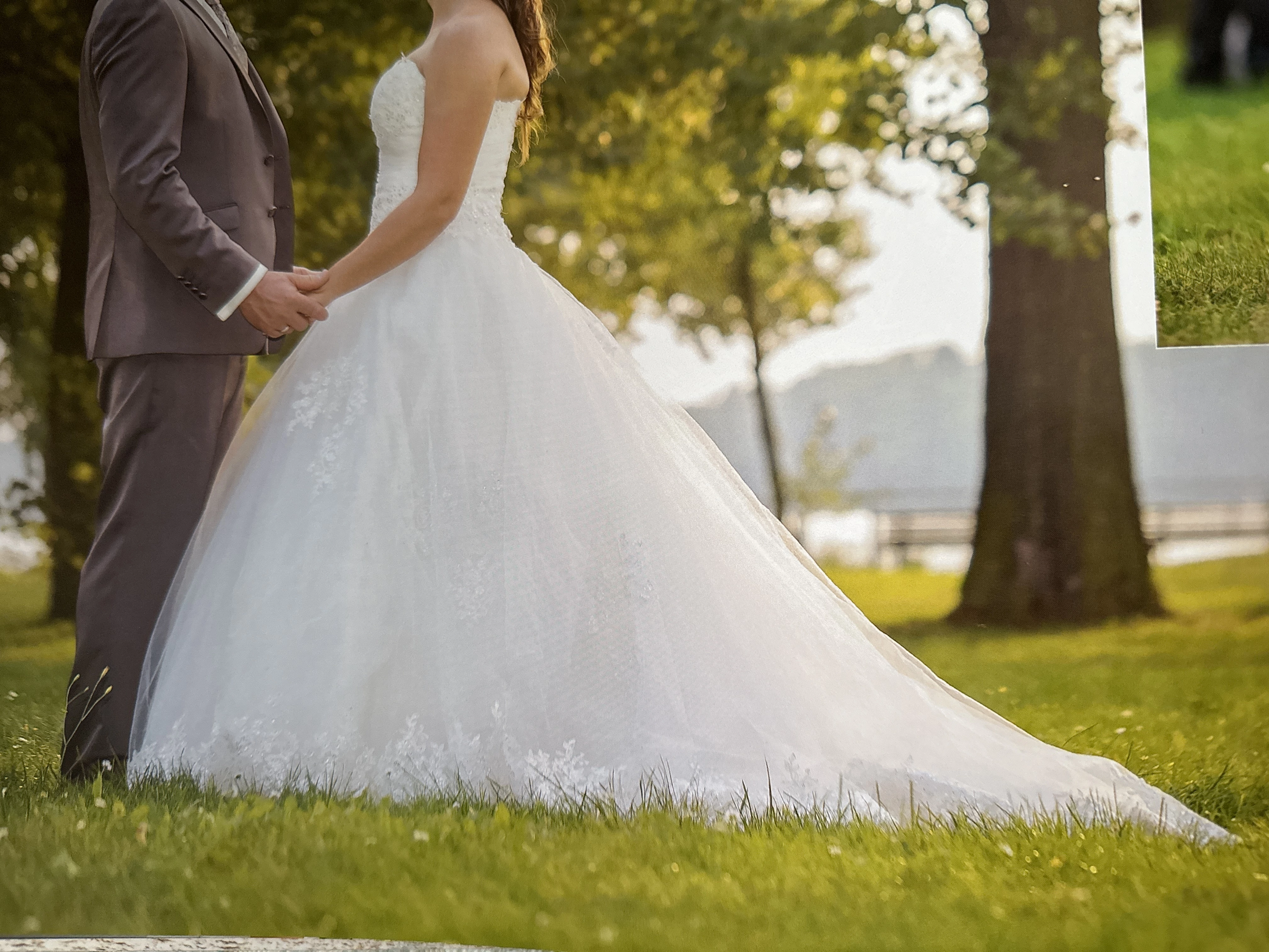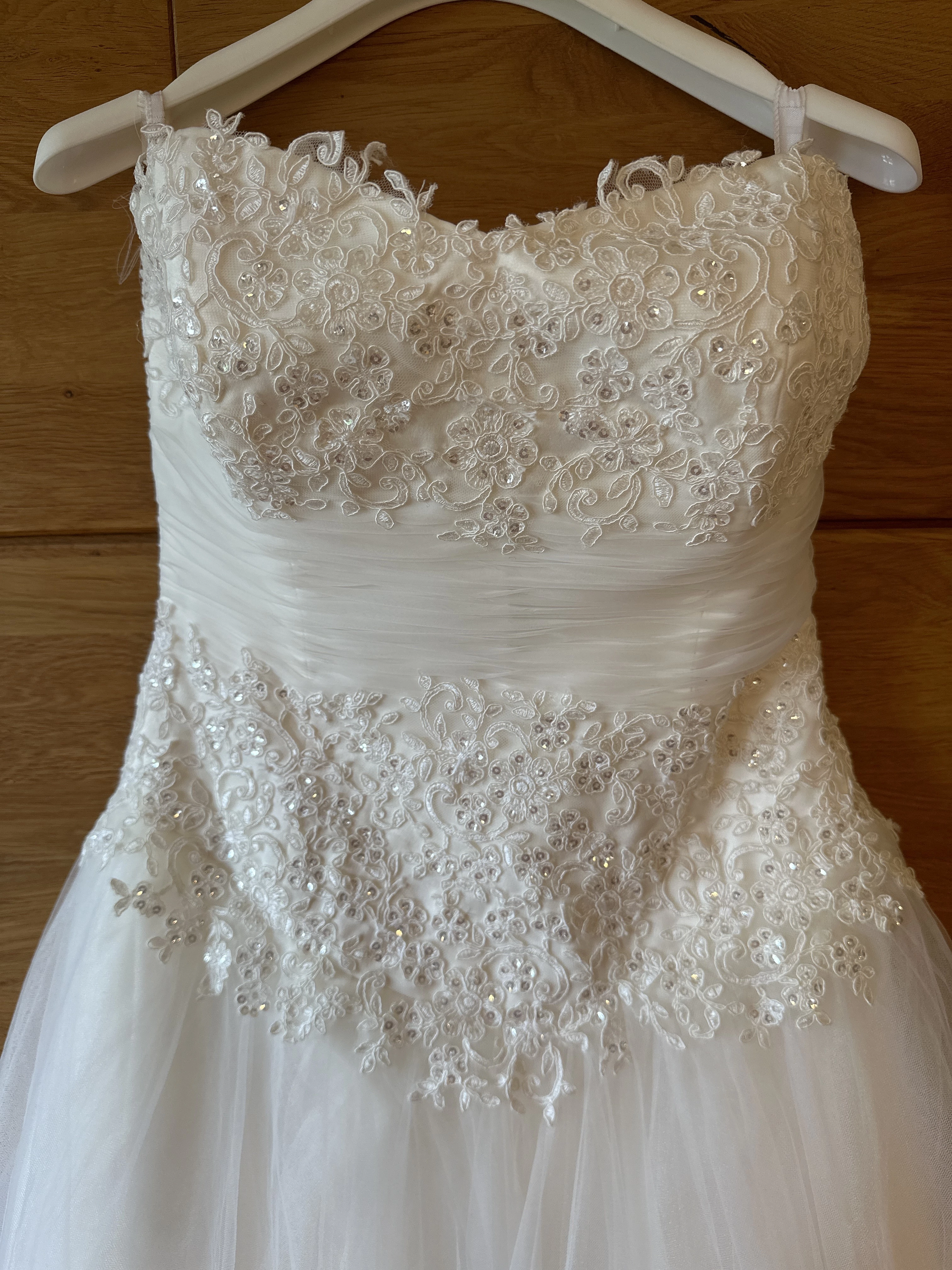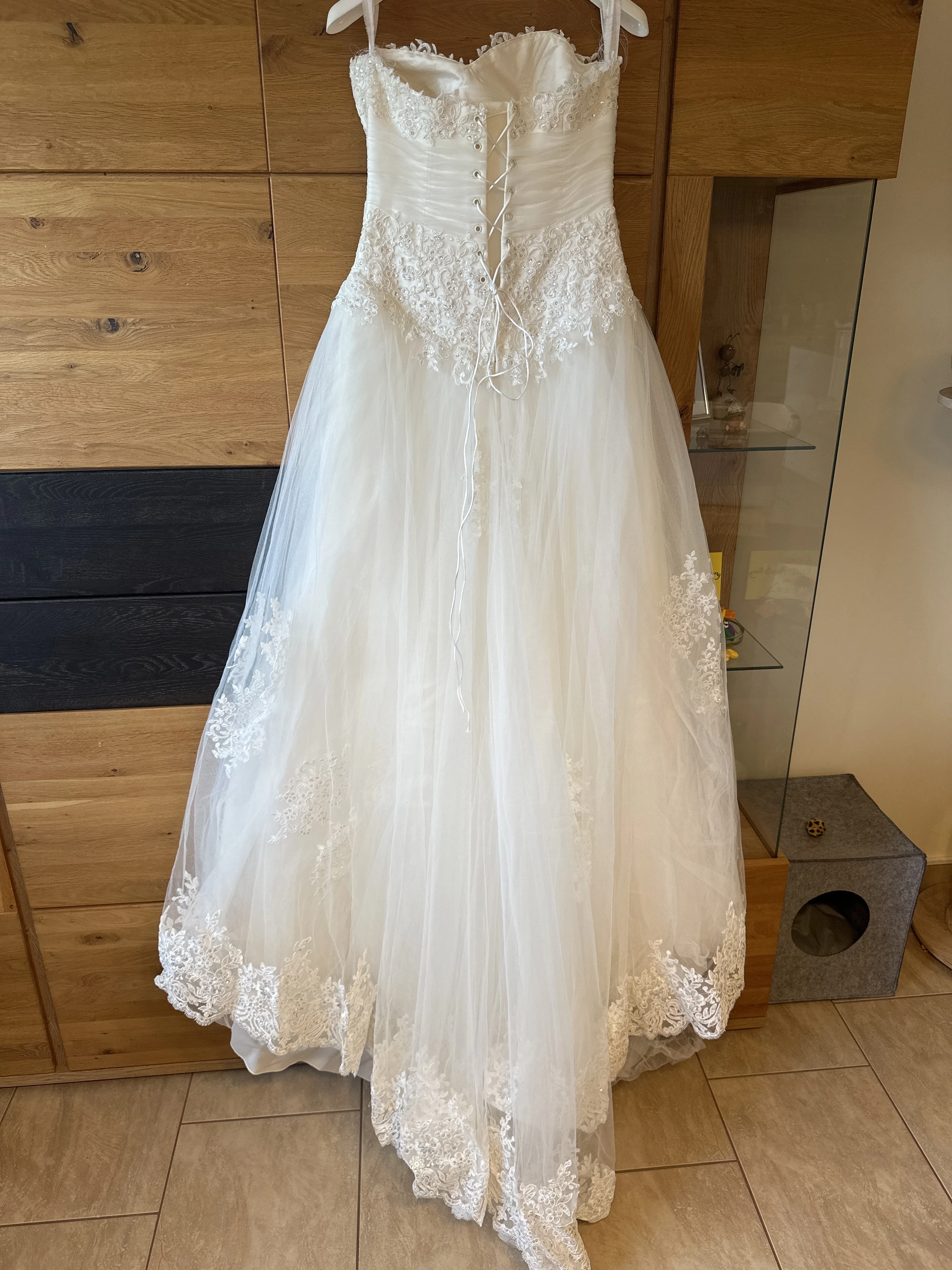 "Das Kleid ist Trägerlos, ist im berteil mit Perlen besetzt. Hat mehrere Lagen und einen Reifrock mit eingearbeitet. Man fühlt sich wie eine Prinzessin. "