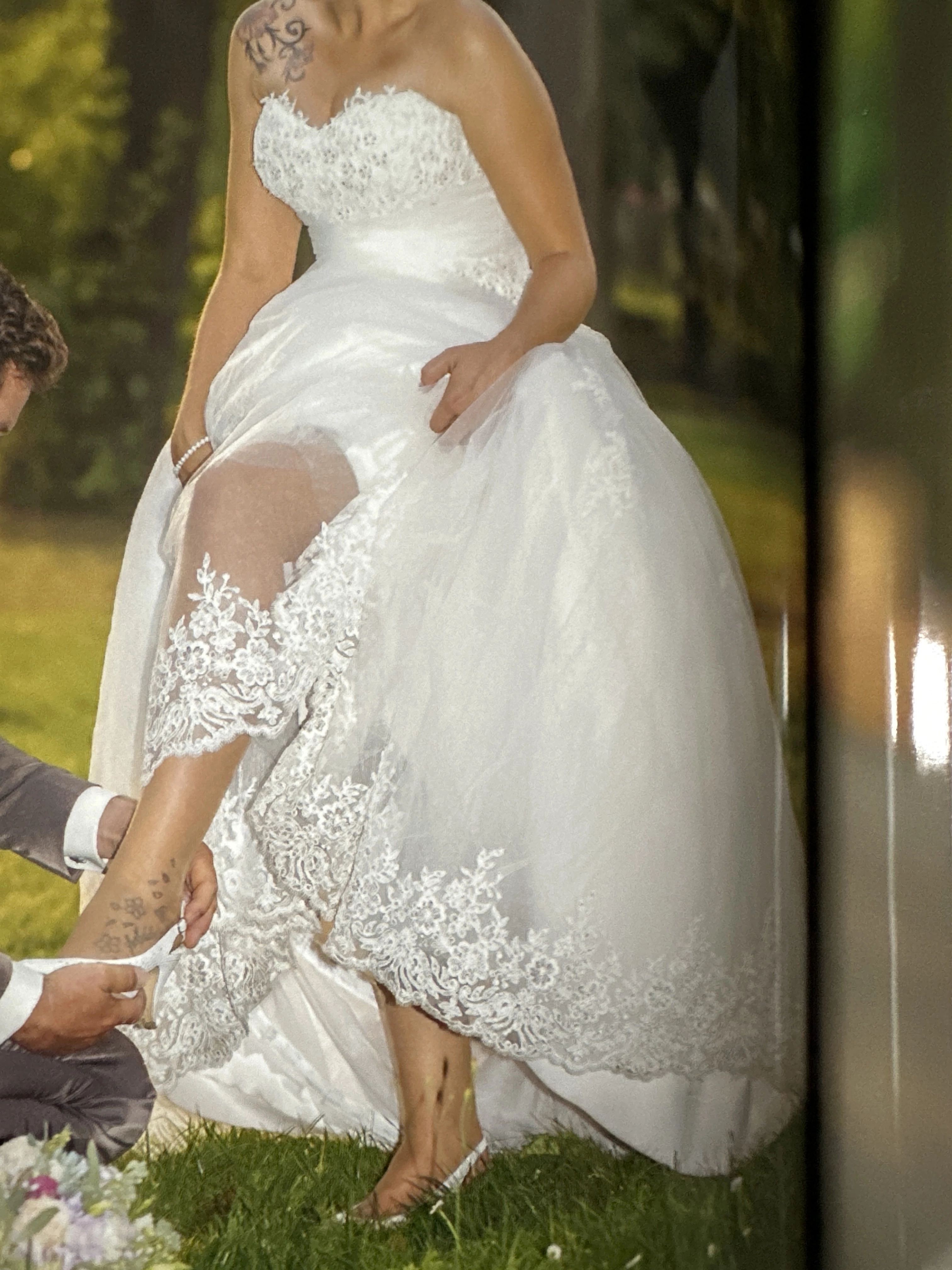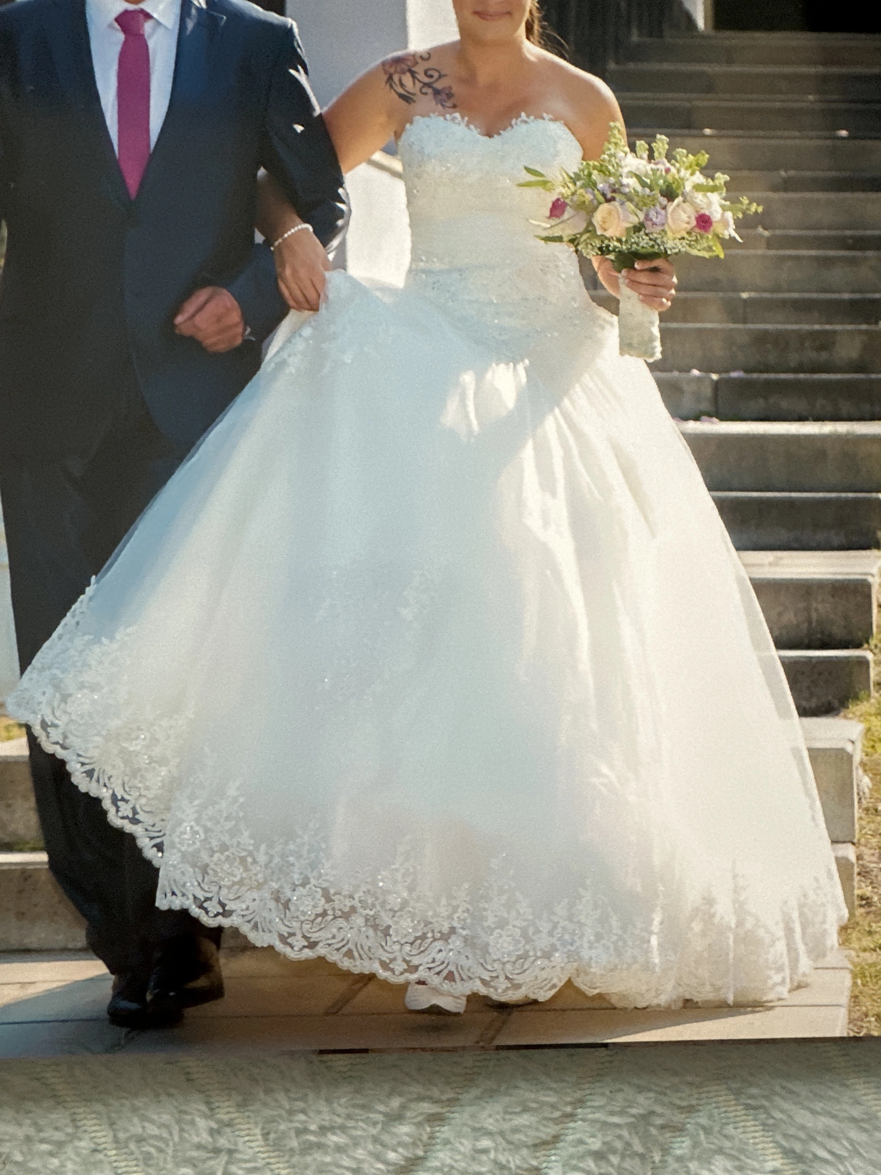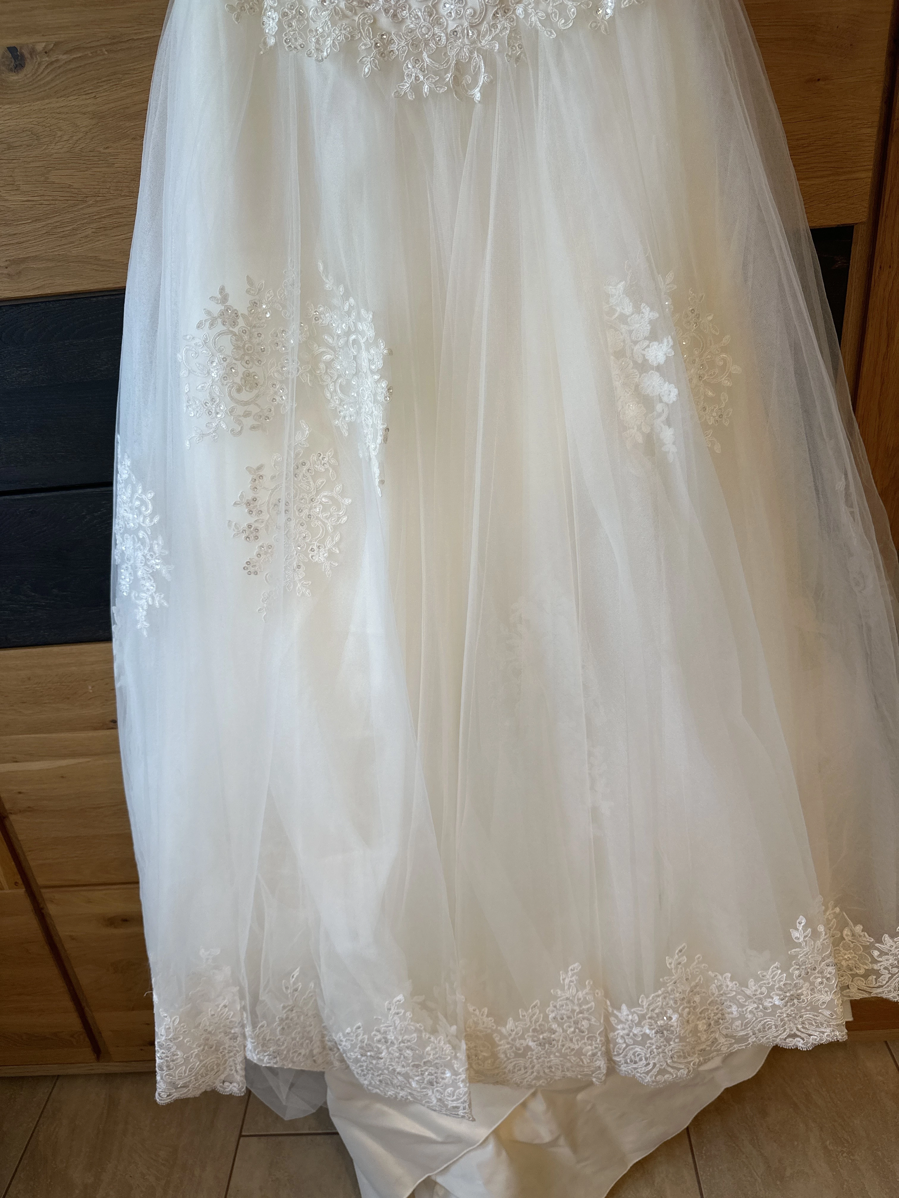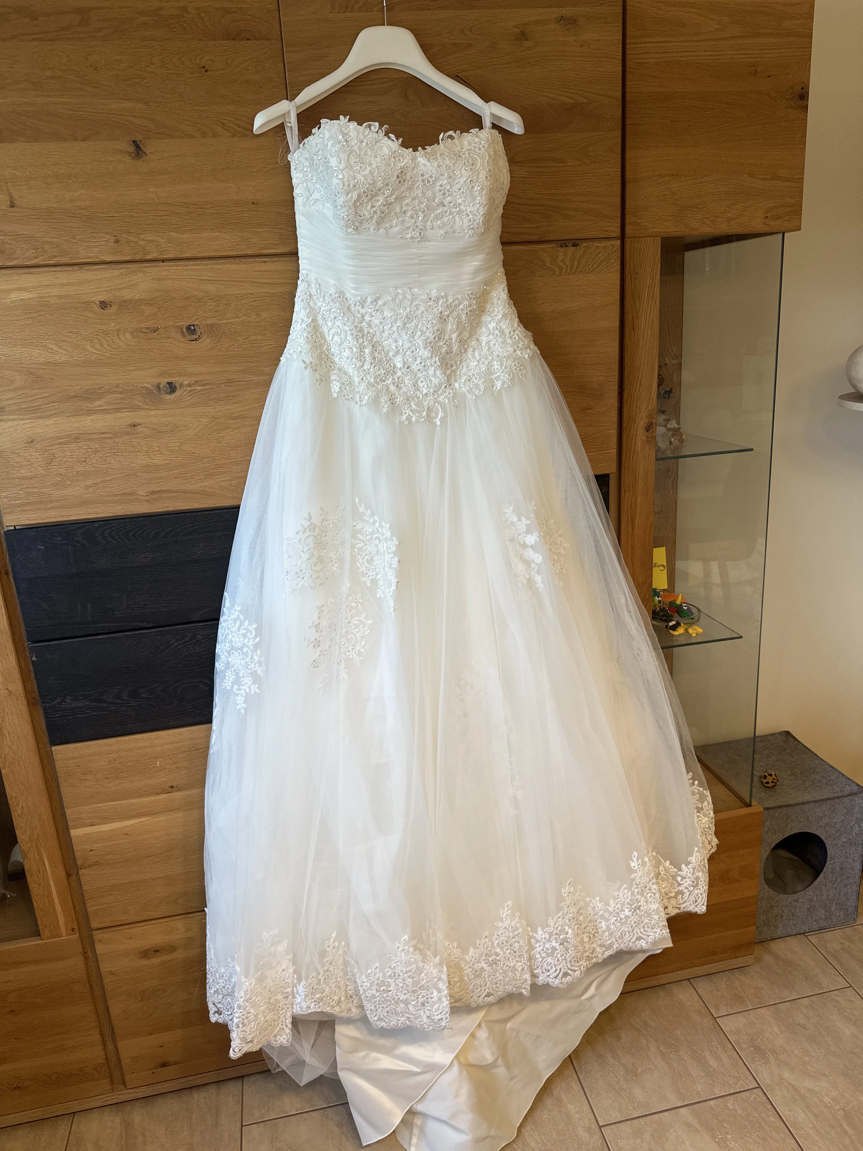 "Das Kleid ist Trägerlos, ist im berteil mit Perlen besetzt. Hat mehrere Lagen und einen Reifrock mit eingearbeitet. Man fühlt sich wie eine Prinzessin. "