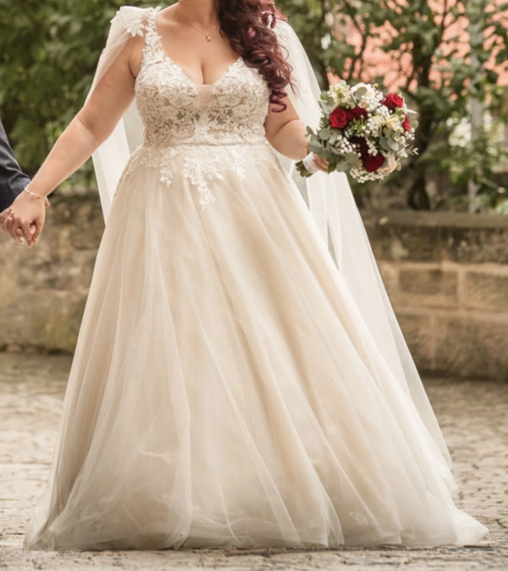 Ich habe mich darin sofort wohlgefühlt und kein anderes Kleid mehr in Betracht gezogen. Jetzt darf es eine neue Braut an ihrem großen Tag begleiten.