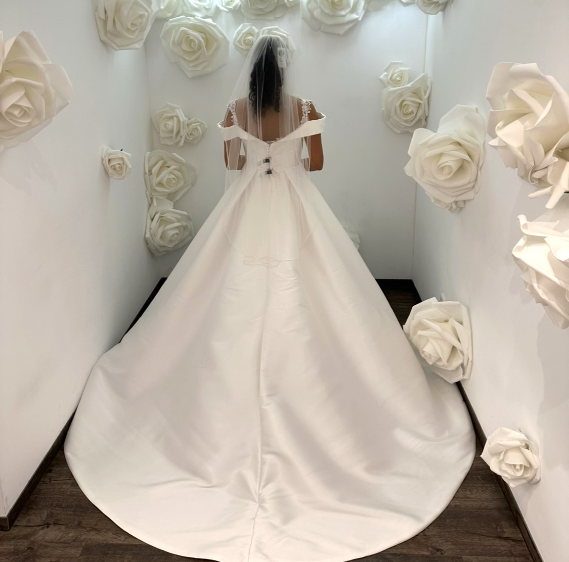 Größe: 38 - Anpassbar, kann eine Nummer kleiner oder größer getragen werden, da das Kleid bei der Anprobe mit Klammern befestigt wurde und noch nicht individuell angepasst wurde