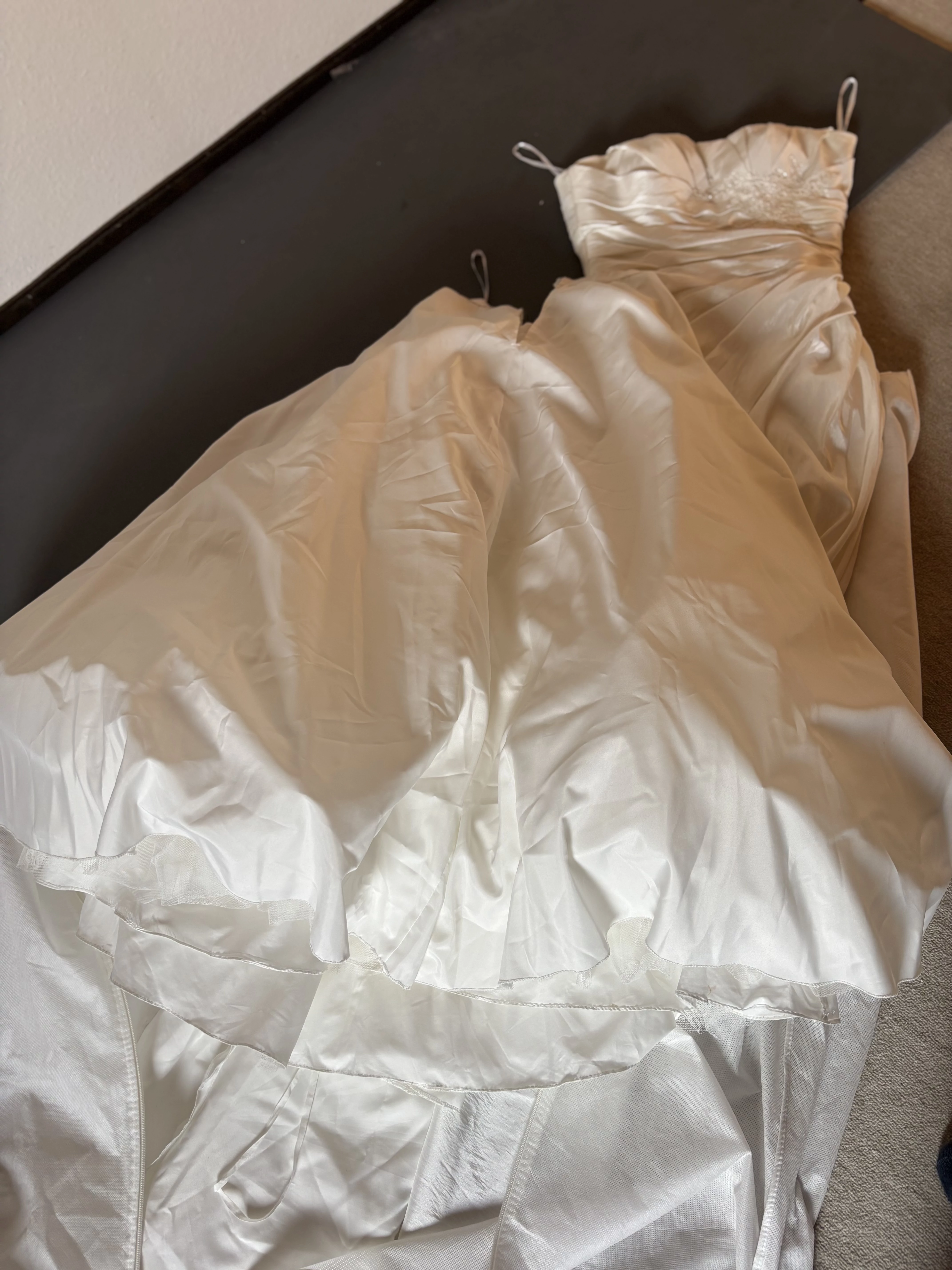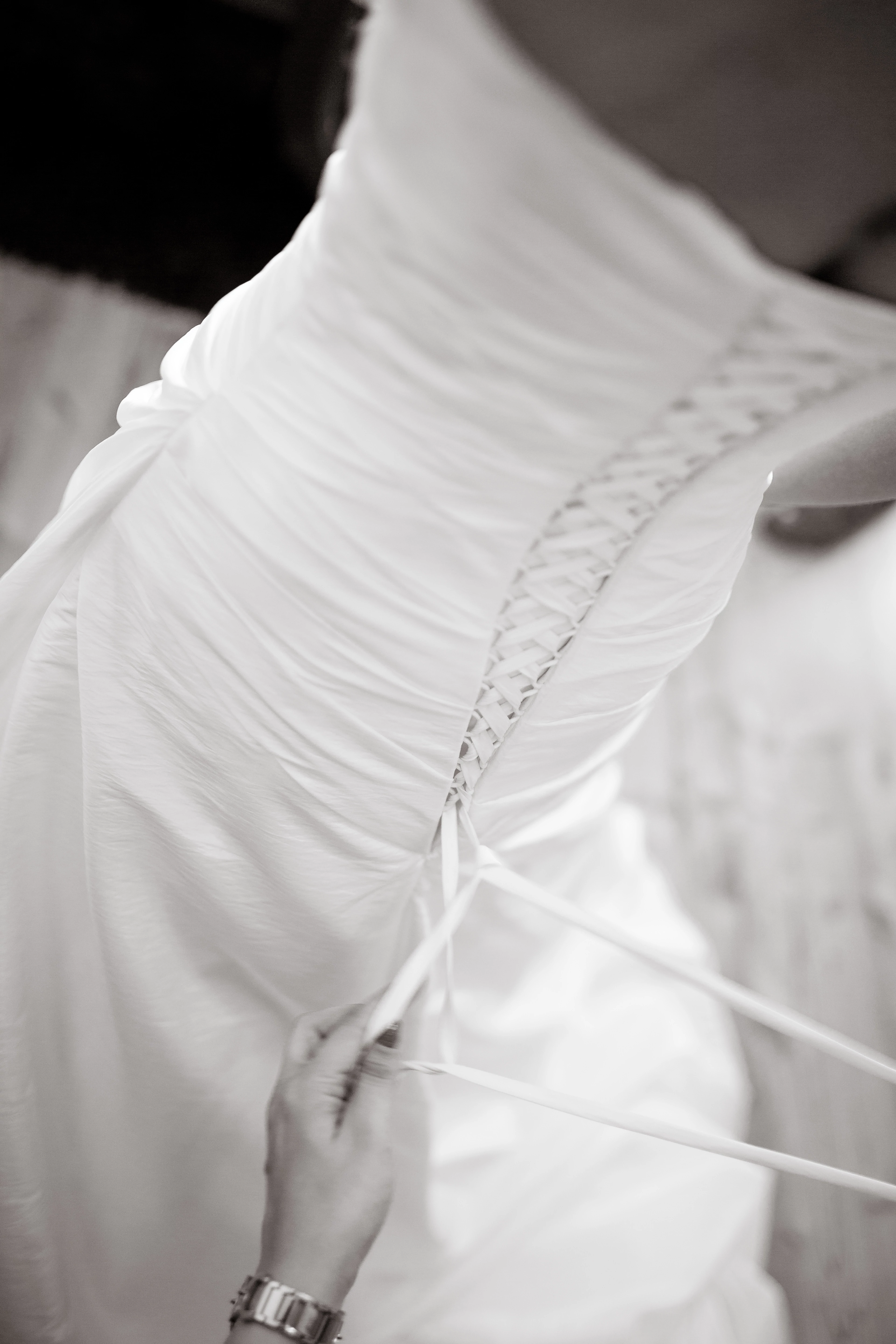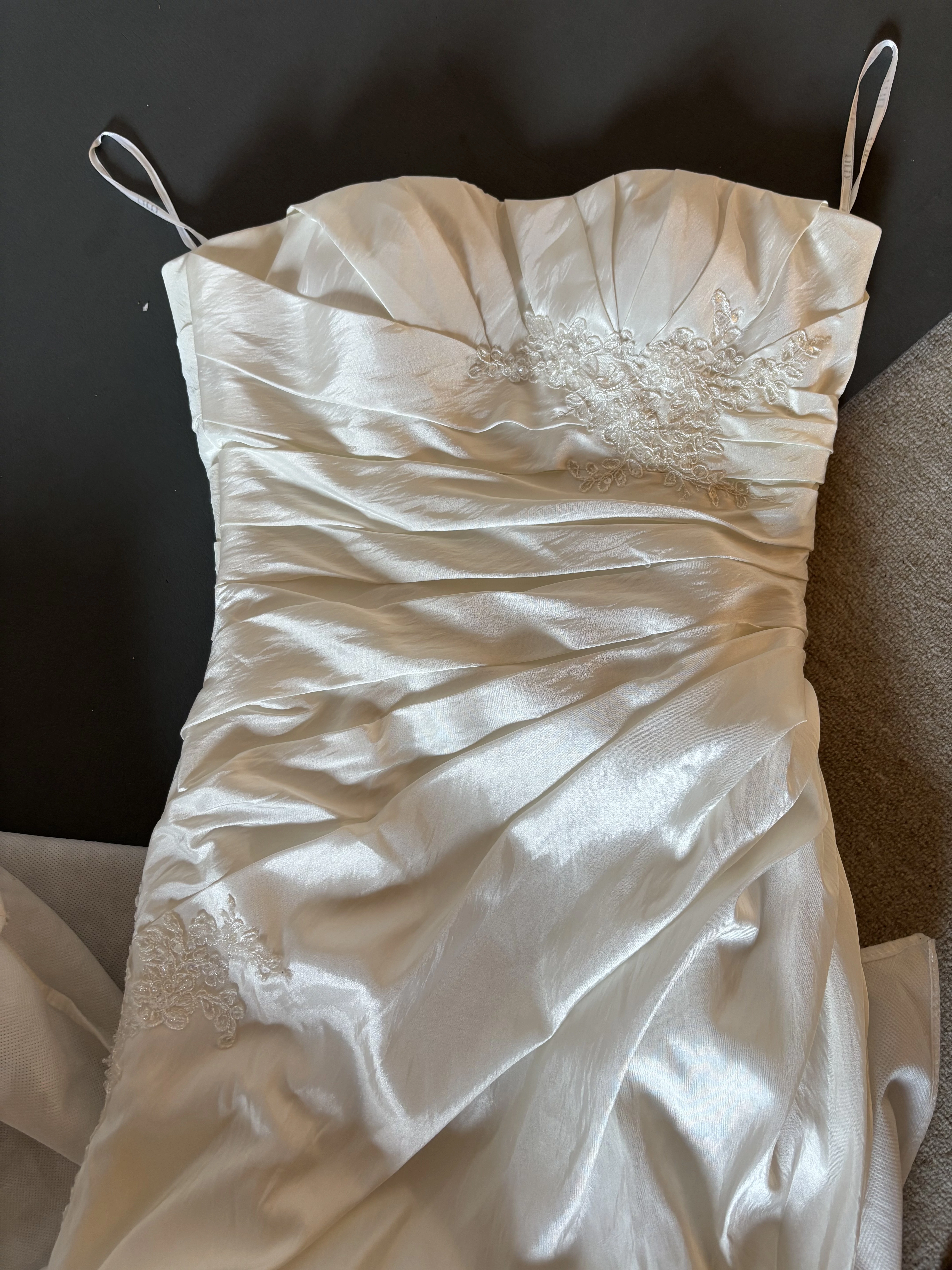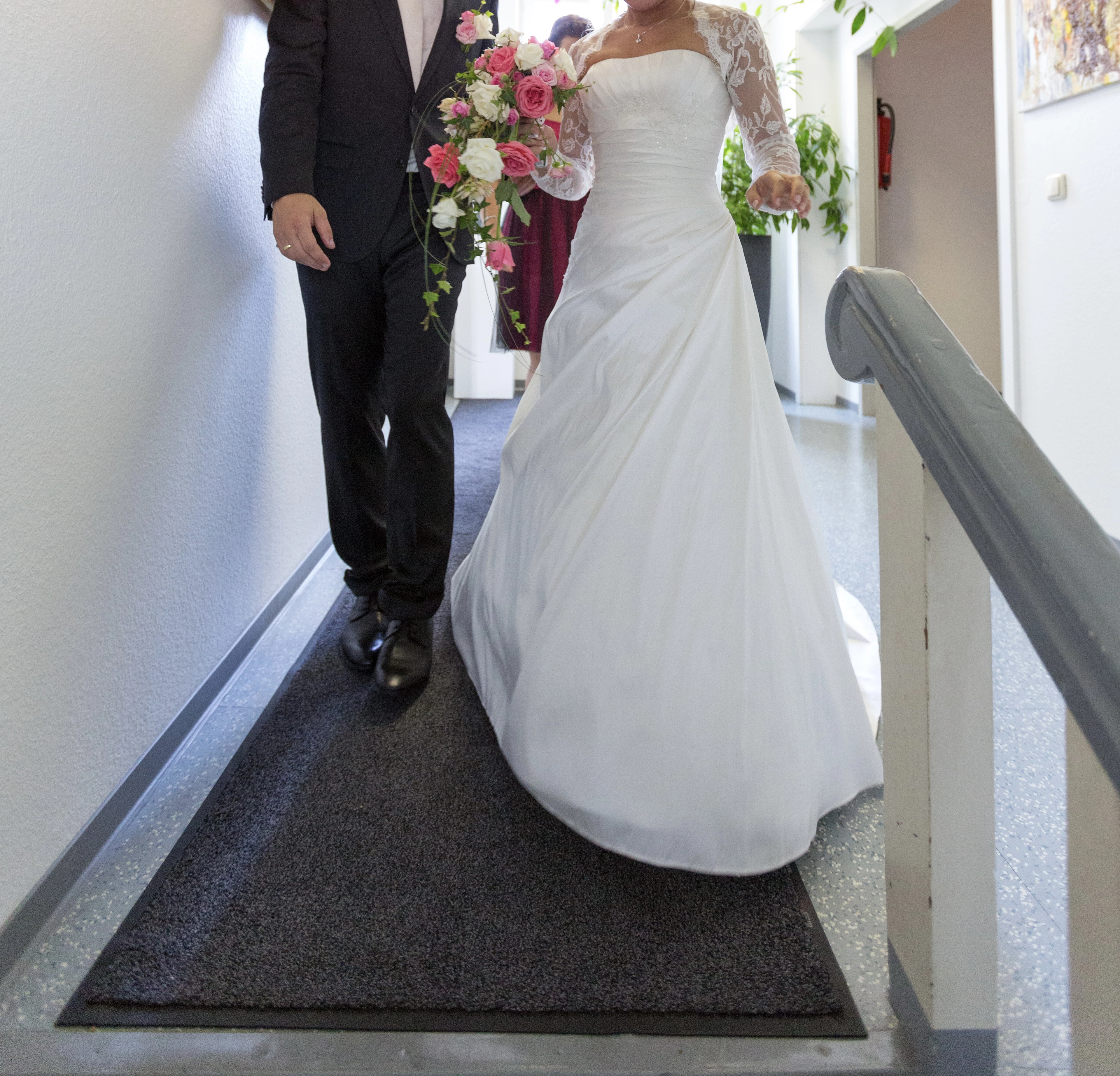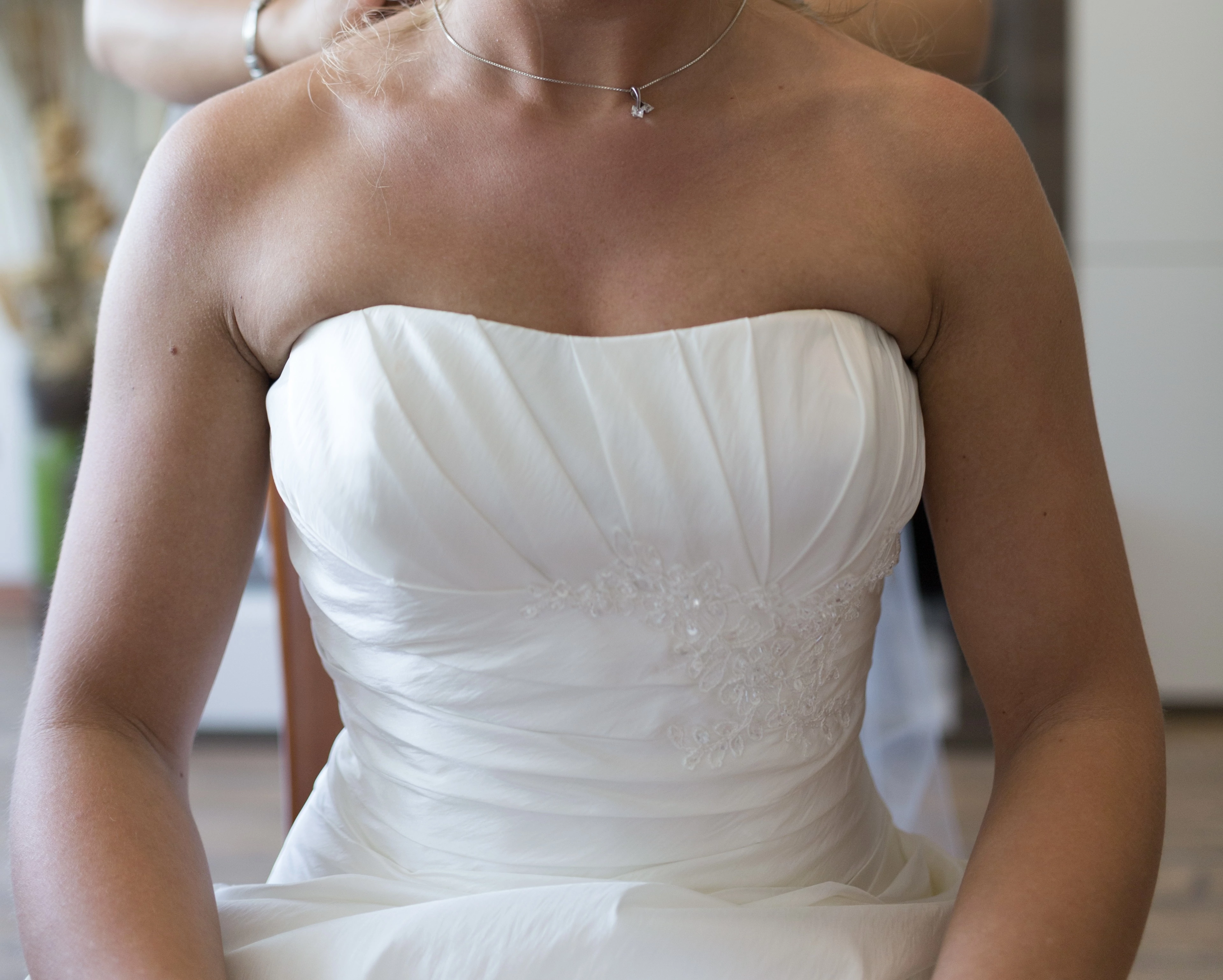 Das Kleid hat schöne dezente Highlights. Die Schleppe kann man am Kleid befestigen. Hände sind also frei. Das Bändchen ist mir bei der Feier leicht gerissen, wurde aber von einer Schneiderin professionell vernäht.