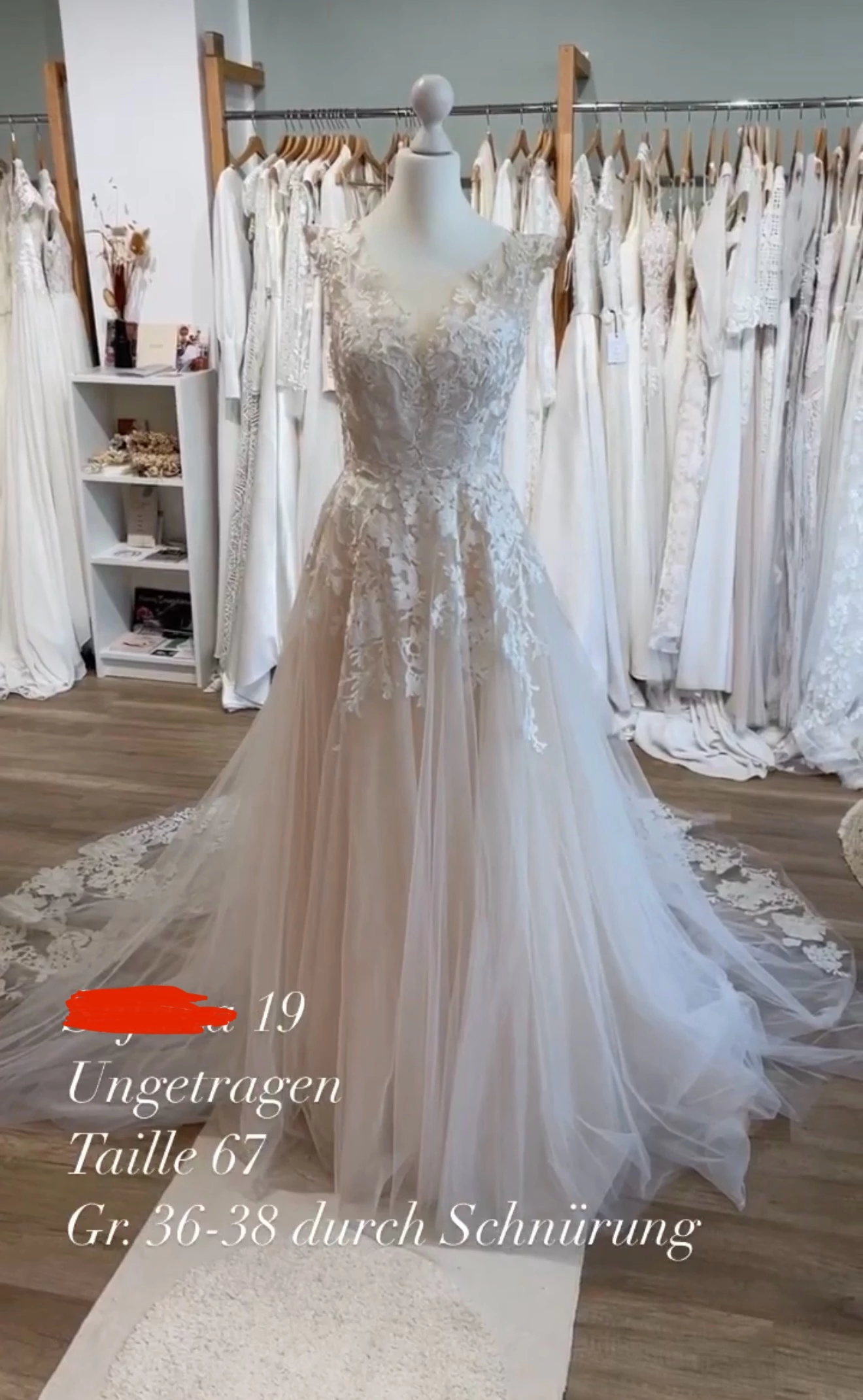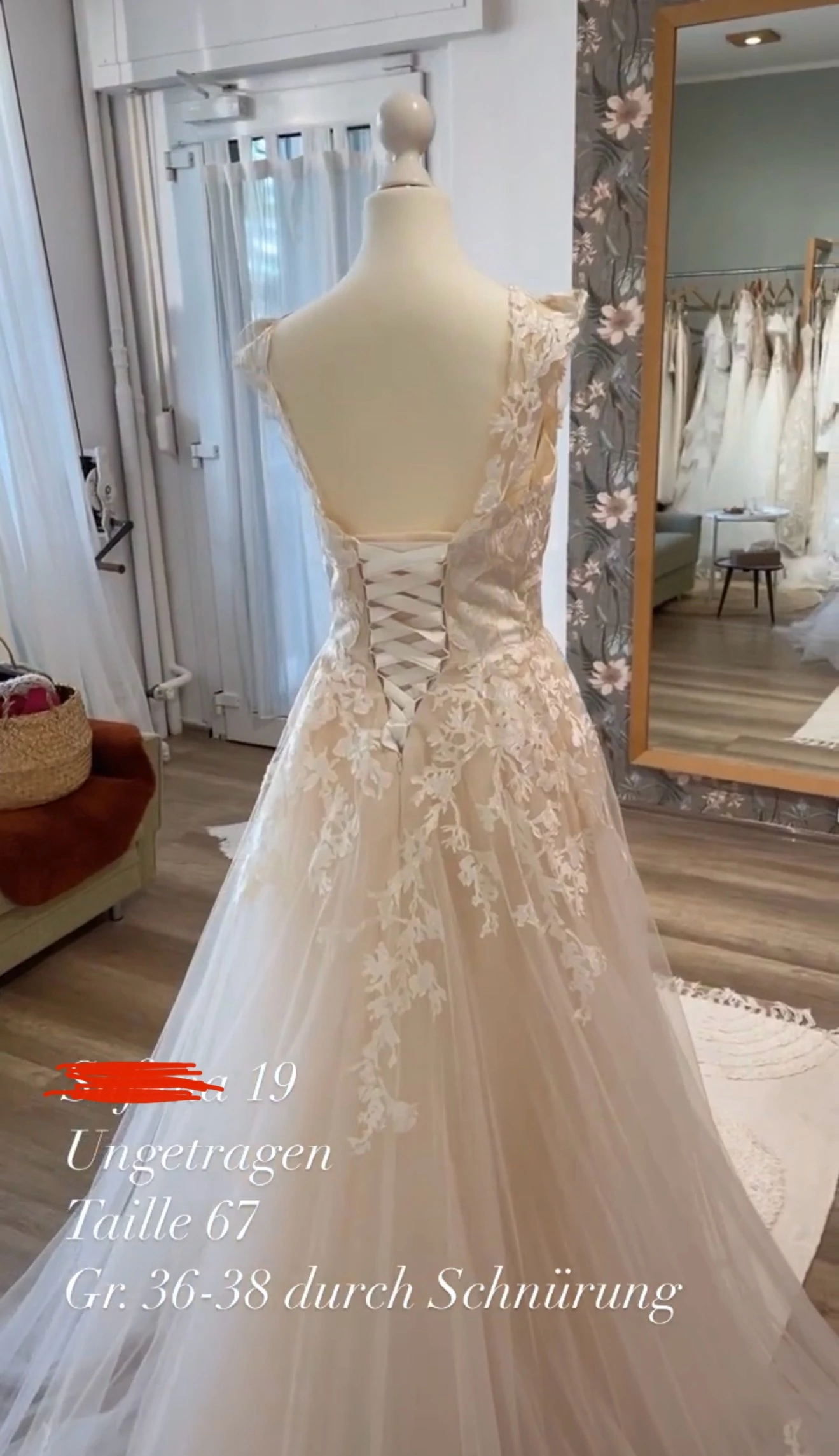 Das Kleid hat leichte Peach Untertöne und wunderschöne Spitze."