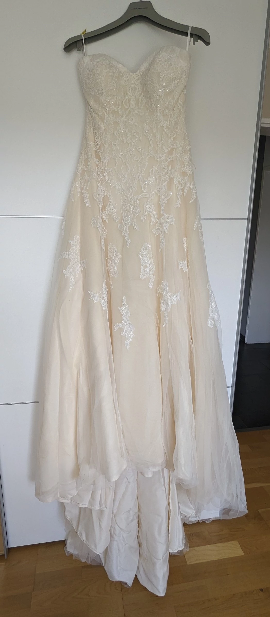 Es hat einen Herzausschnitt und eine Schnürung am Rücken. Es sitzt super, auch ohne BH. Man hatte nie das Gefühl es rutscht etc. Es hat ein lange Schleppe, die man auch etwas hochbinden kann - wobei ich mir nicht sicher bin, ob es die Art "Kathedrale" ist - und viele süße Spitzendetails.