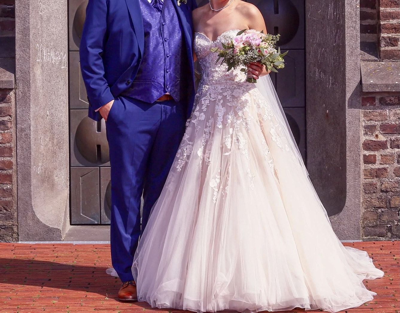 "Das Kleid besticht durch sein außergewöhnliches Farbdesign und seinen Materialmix aus Tüll und Blütenspitze in den Farben Blush und Ivory. Es hebt eine schmale Taille hervor und wirkt wie aus dem Märchen.