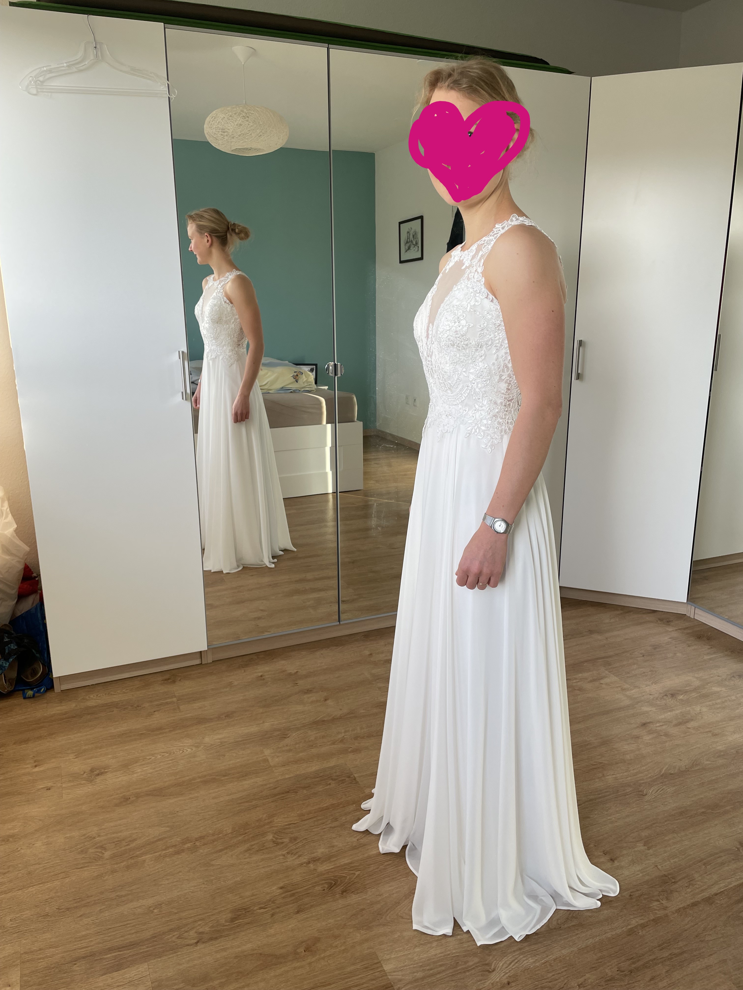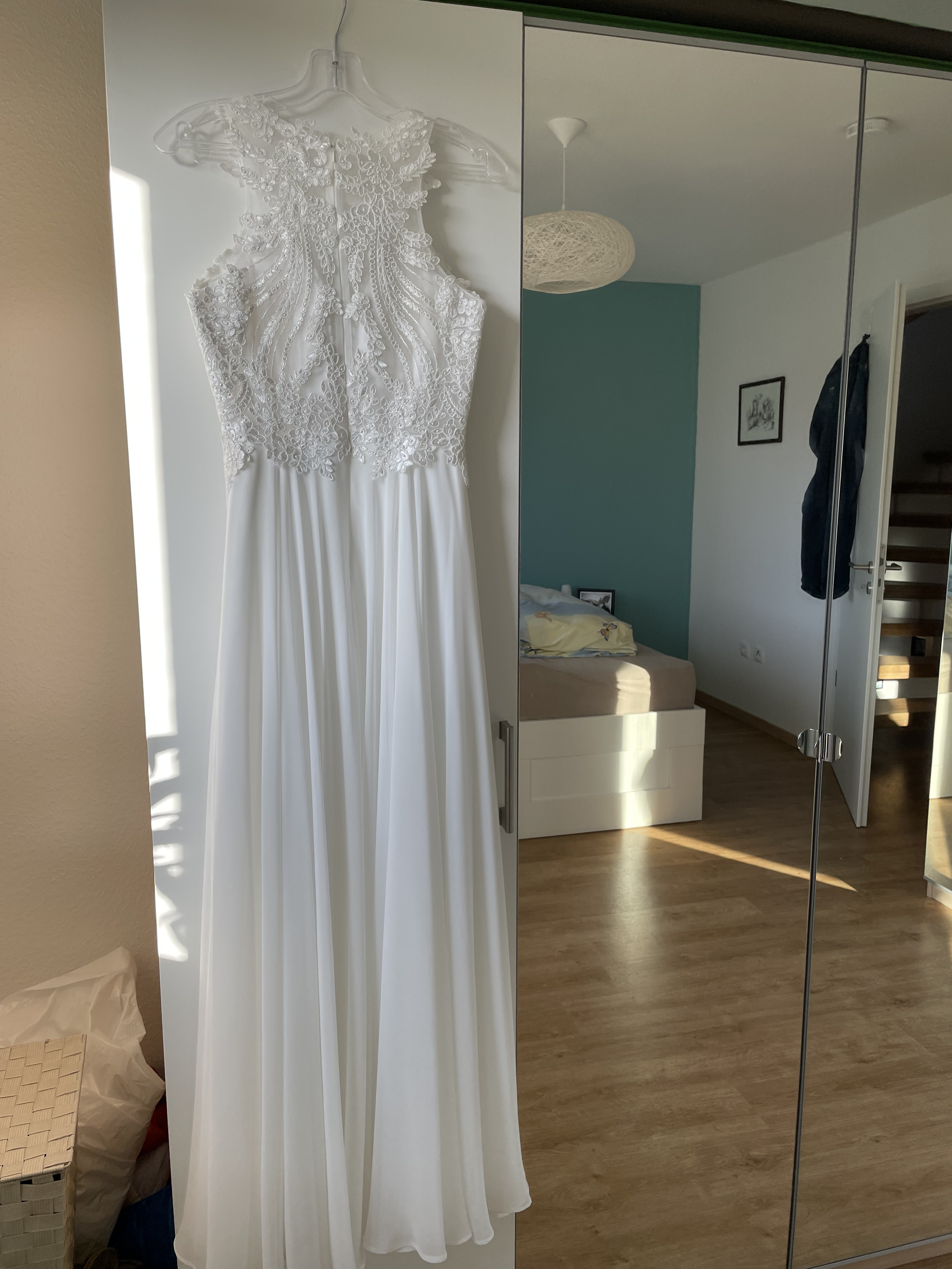 Neu gekauft im August 2021 im Brautmodegeschäft MariLo in Lilienthal bei Bremen, einmal für ein paar Stunden getragen und anschließend direkt in professioneller Reinigung in den Neuzustand versetzt.
