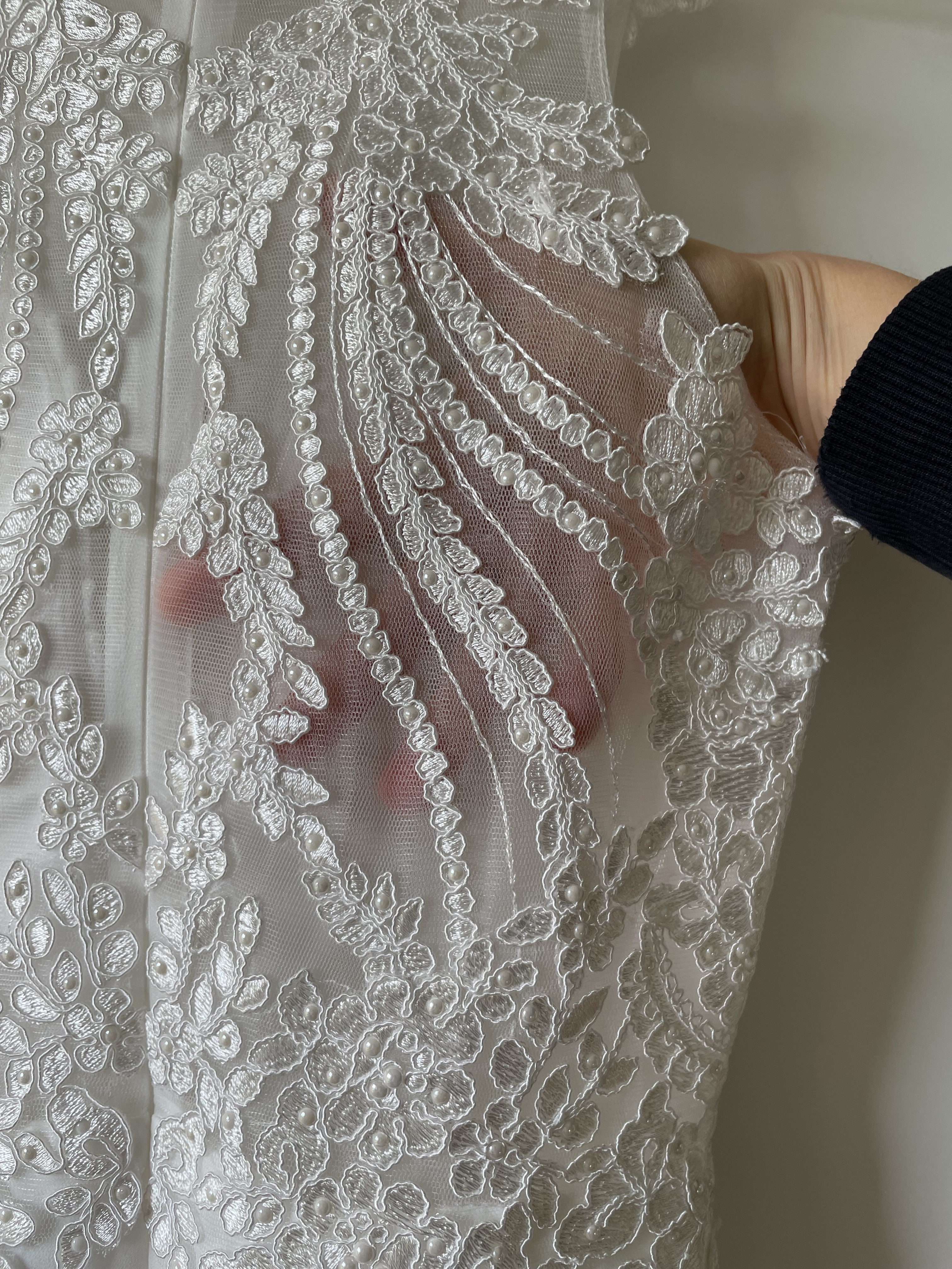 Blattartige Stickereien und Perlenaufsätze am Oberkörper – vorne undurchsichtig am Rücken mit feinem Netz.