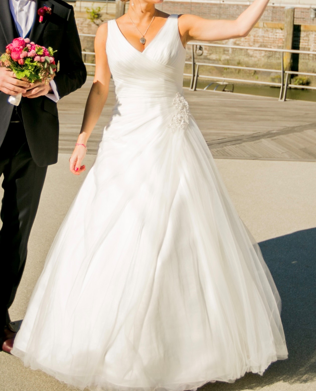 "Zum Verkauf steht ein traumhaft schönes Brautkleid in klassisch-elegantem Stil. Das Kleid besticht durch seine feminine A-Linie, die jeder Figur schmeichelt, und seinen zarten, fließenden Tüllrock, der für eine romantische Silhouette sorgt.