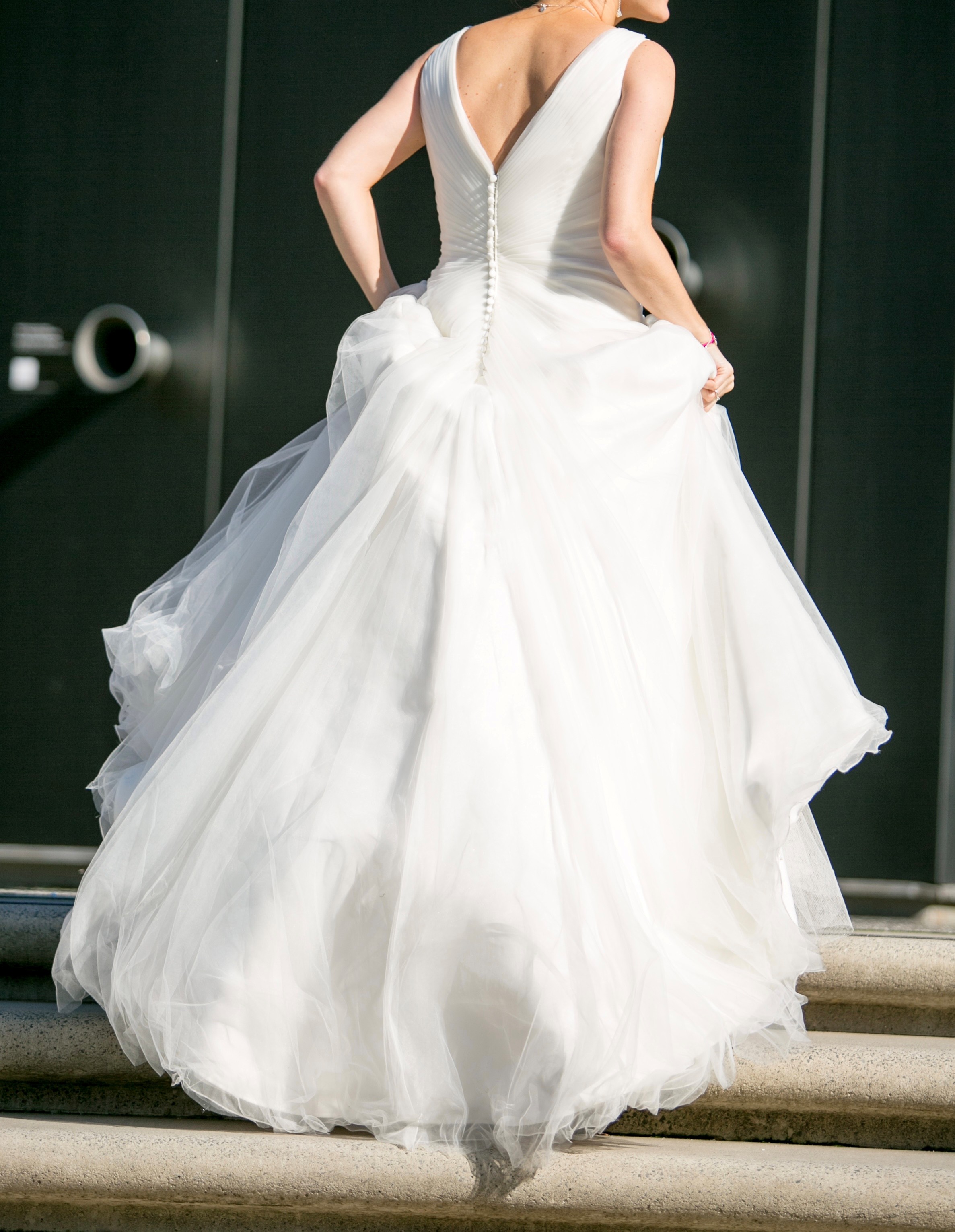 Hinten wird das Kleid mit einer Reihe kleiner, stoffbezogener Knöpfe geschlossen – ein klassisches und zugleich modernes Detail. Die mehrlagige Tüllschicht des Rocks sorgt für Volumen und Bewegung, während die dezente Schleppe das Gesamtbild wunderbar abrundet.