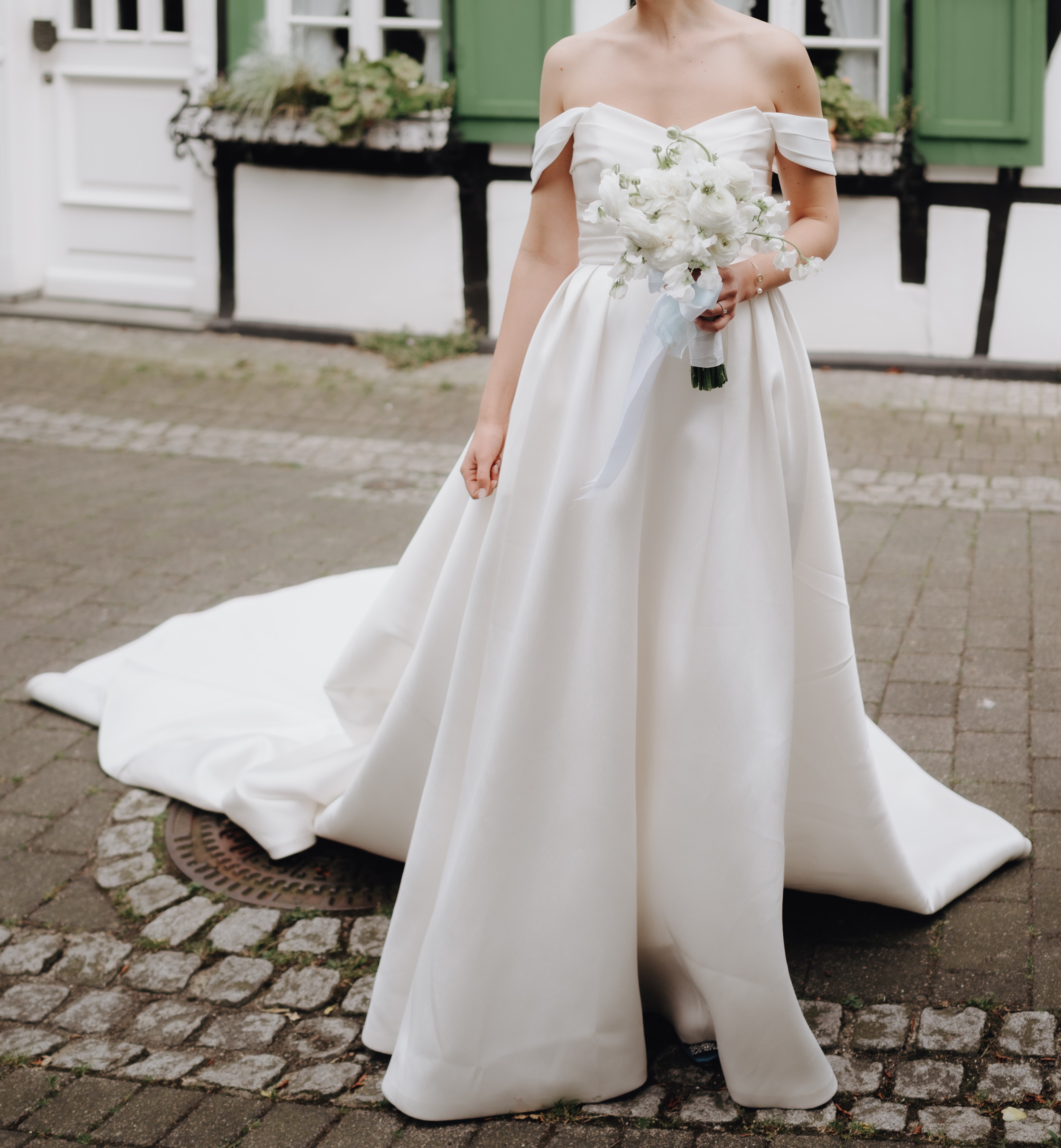 "Das Kleid trifft zu 100% den Geschmack der Braut im Jahr 2025. Ich habe es auf meiner Hochzeit im Juni 2025 getragen und habe mich super wohl und mit der langen Schleppe mit aufwendiger Knopfleiste wie eine Prinzession gefühlt.