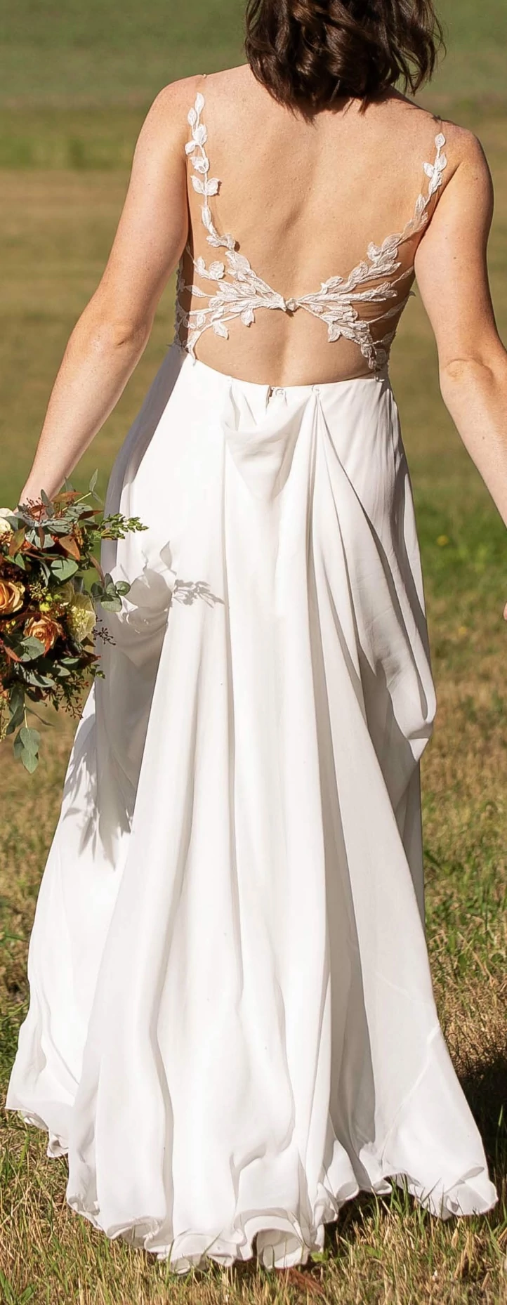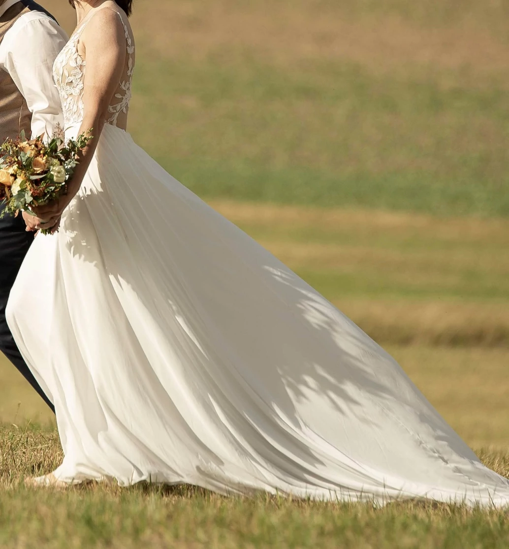"Luftig/leicht, zeitlos und elegant. Durch die schlichten Blätter innerhalb der transparenten Spitze wirkt es elegant und natürlich und eignet sich für Hochzeiten an unterschiedlichen Locations. Die Leichte Schleppe kommt bei etwas Wind auch auf Bildern fantastisch zur Geltung ;)"