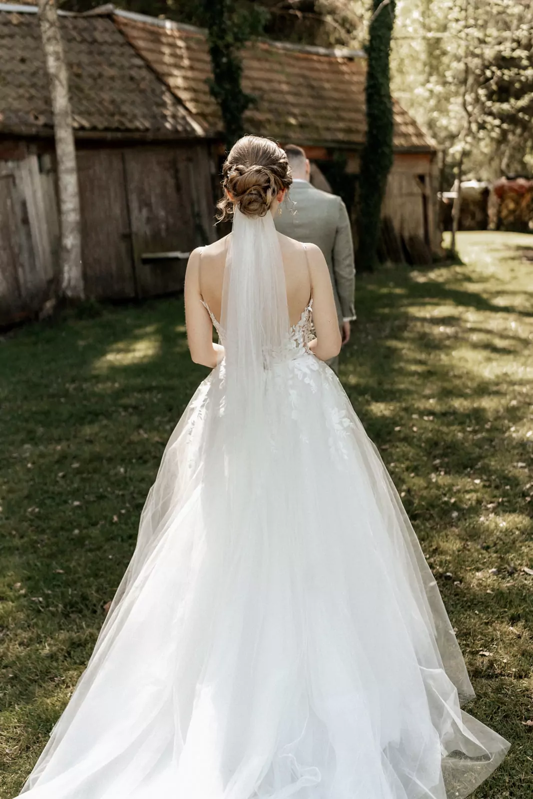 * Lange Schleppe: Die lange Schleppe verleiht dem Kleid eine majestätische Ausstrahlung und sorgt für einen atemberaubenden Moment - vorallem beim Gang zum Altar.