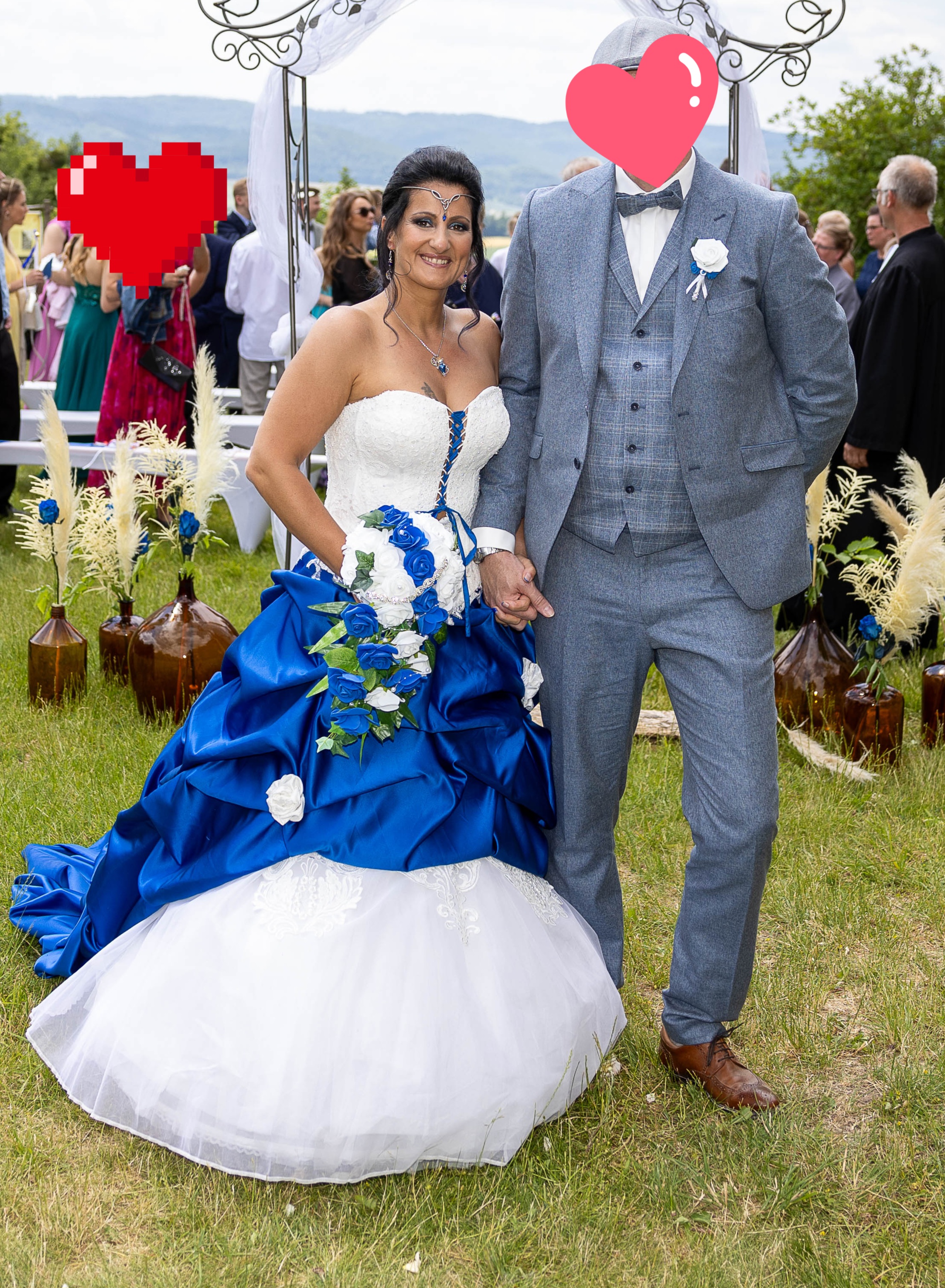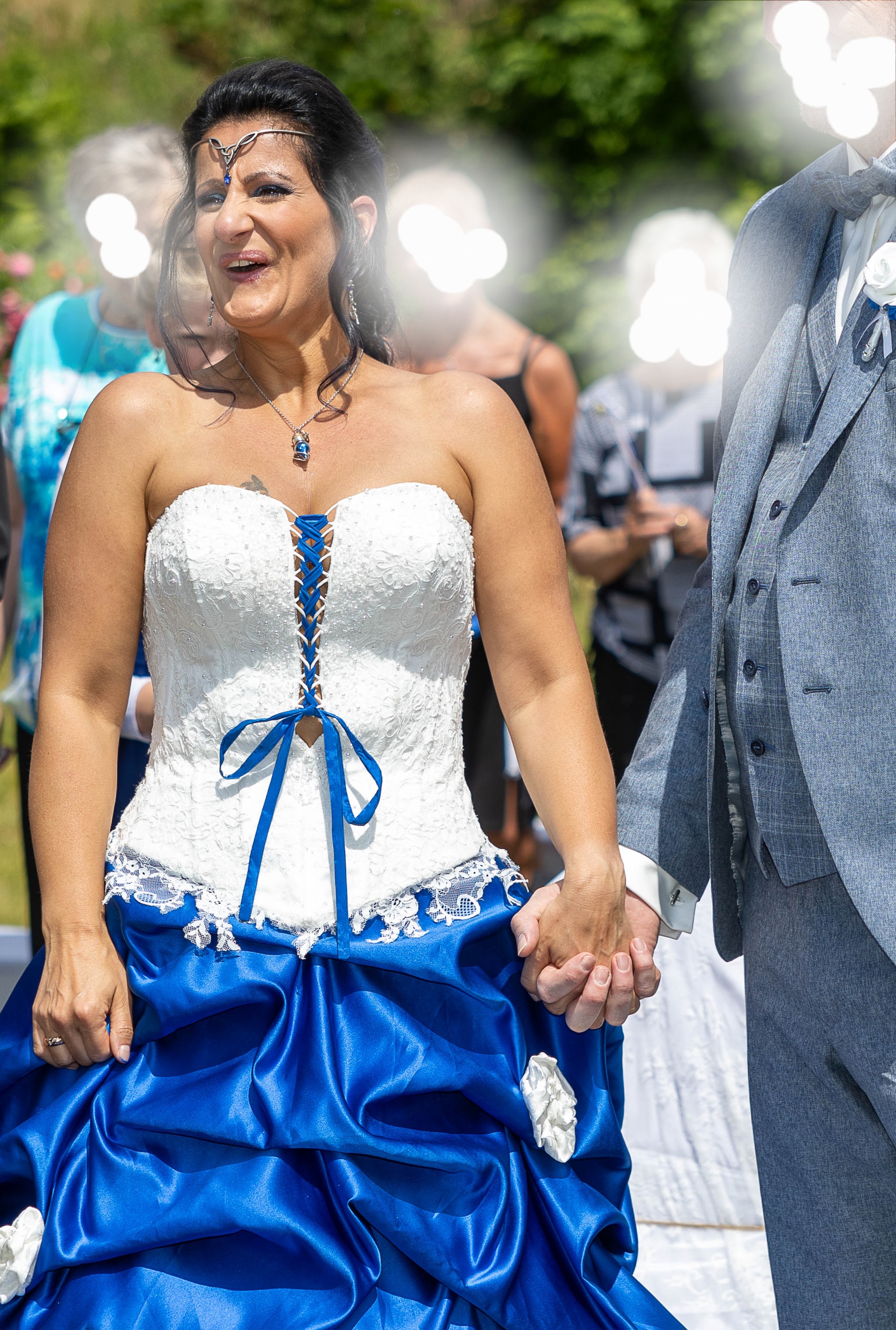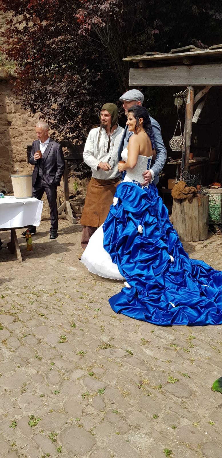 Das besteht aus Korsage in Ivory , Unterkleid worauf aufwendig Spitzenornamente genäht sind , Reifrock und blaue wallende Schleppe