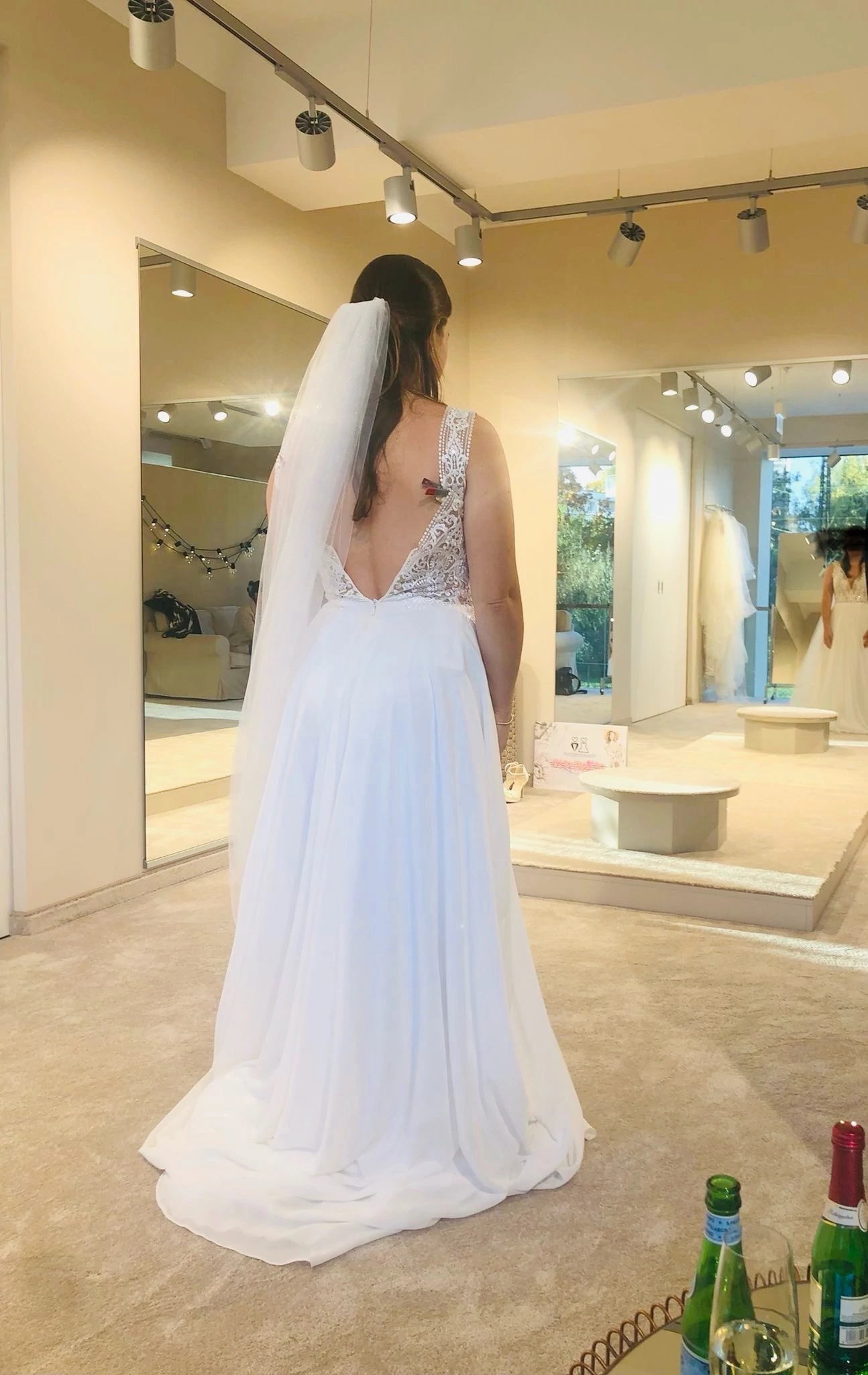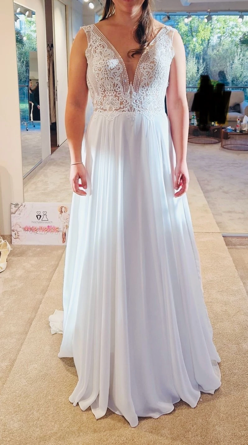 "Das Kleid wirkt oben sehr aufregend durch die Spitze und wirkt trotzdem elegant. Dazu passt die schön fallende A-Linie mit Schleppe. Der tiefe Rückenausschnitt ist ein echter Hingucker. Ich hatte darin einen Traumtag und hoffe der nächsten Braut geht es genauso damit.