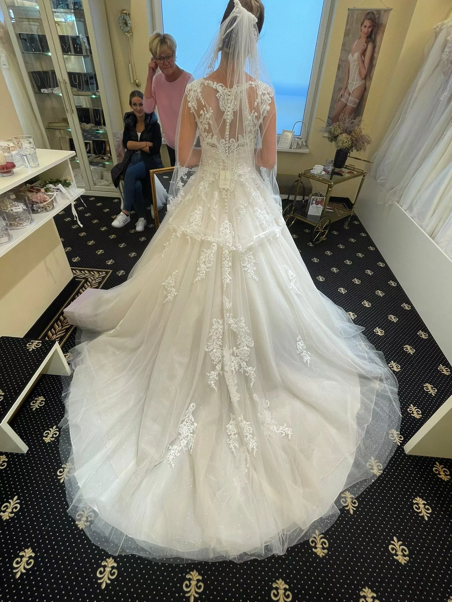 Knopfleiste am Rücken, inkl. Reifrock, angenehm zu Tragen. Bei den Schultern wurde ein Silikonband angebracht, damit es nicht so scheuert an der Schulter"